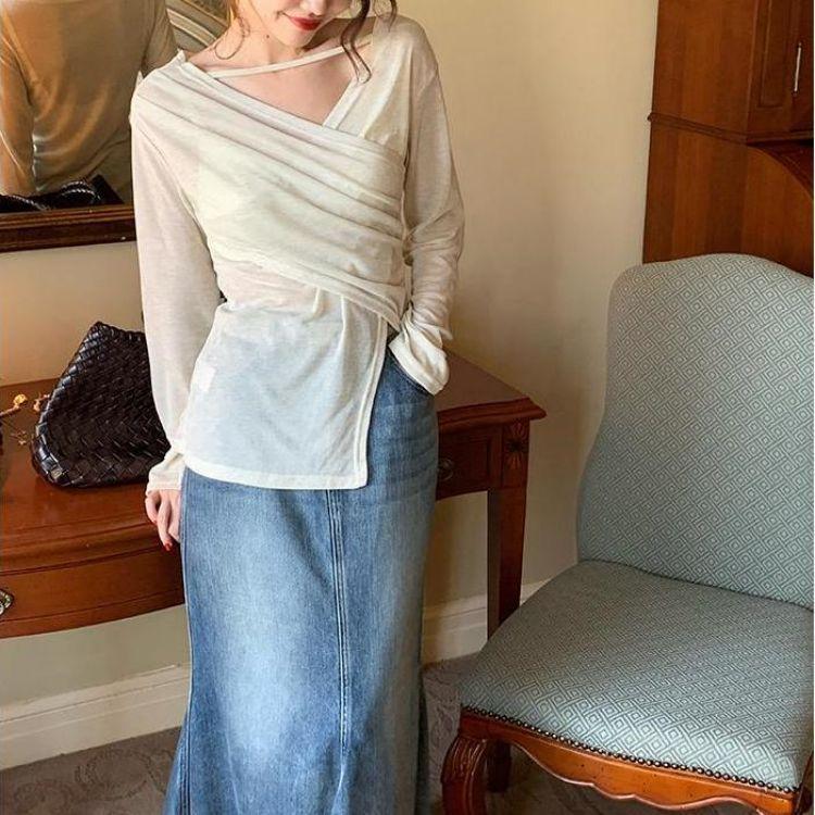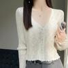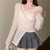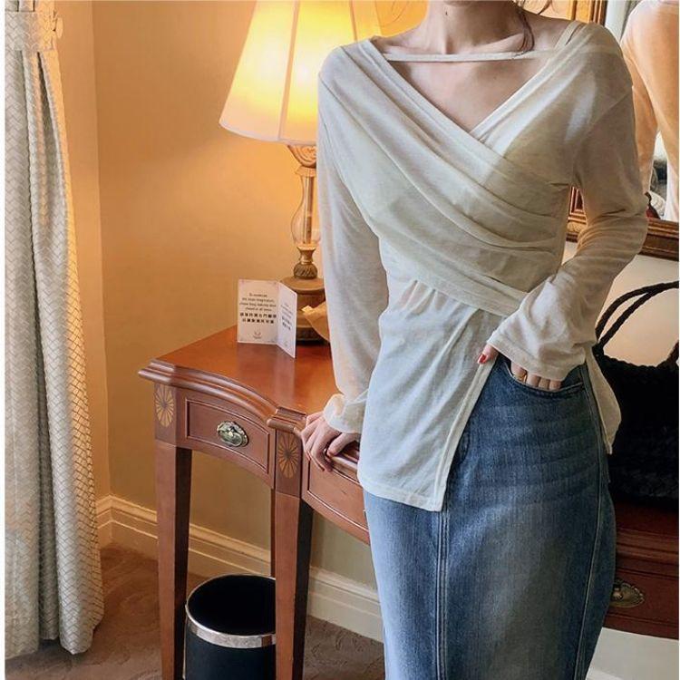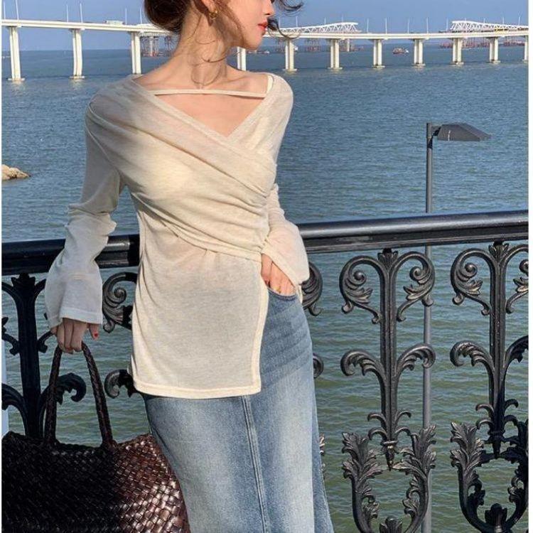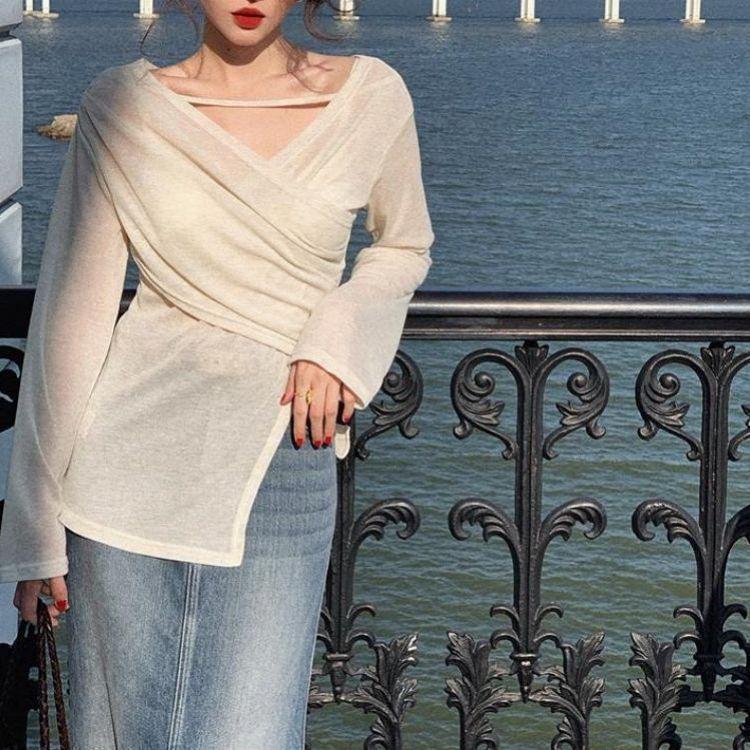 Top de Punto de Manga Larga con Cuello en V de Color Sólido Retro Suave de Estilo Francés para Mujer, Diseño Cruzado de Verano, Top Fino para Principios de Otoño