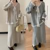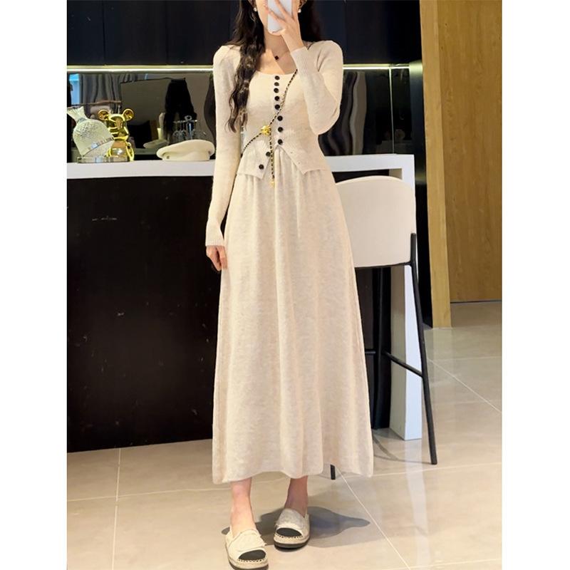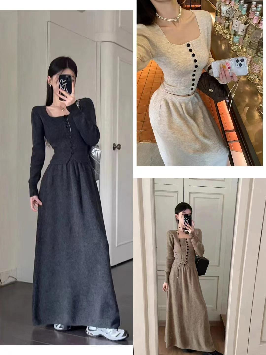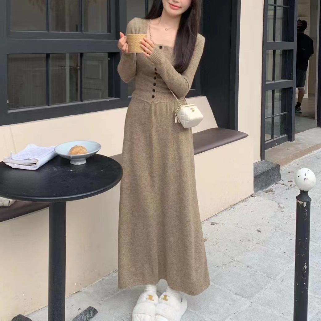 Suéter de cuello cuadrado de alta gama para otoño e invierno, traje de falda de temperamento suave, conjunto de dos piezas de estilo occidental de punto retro adelgazante