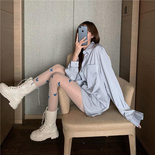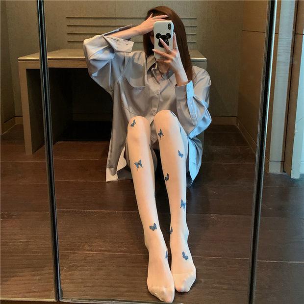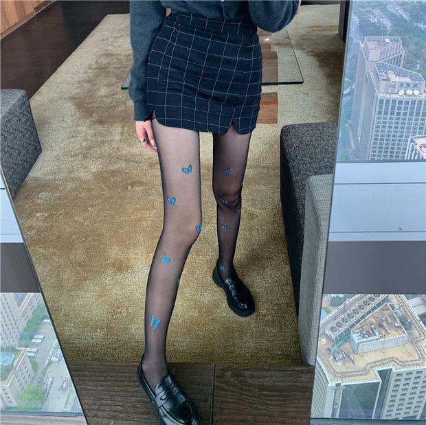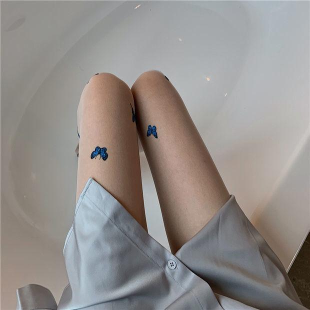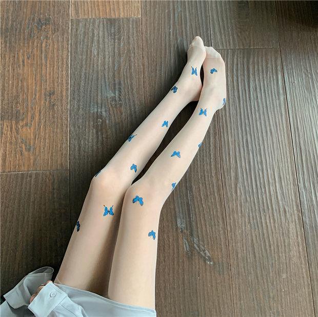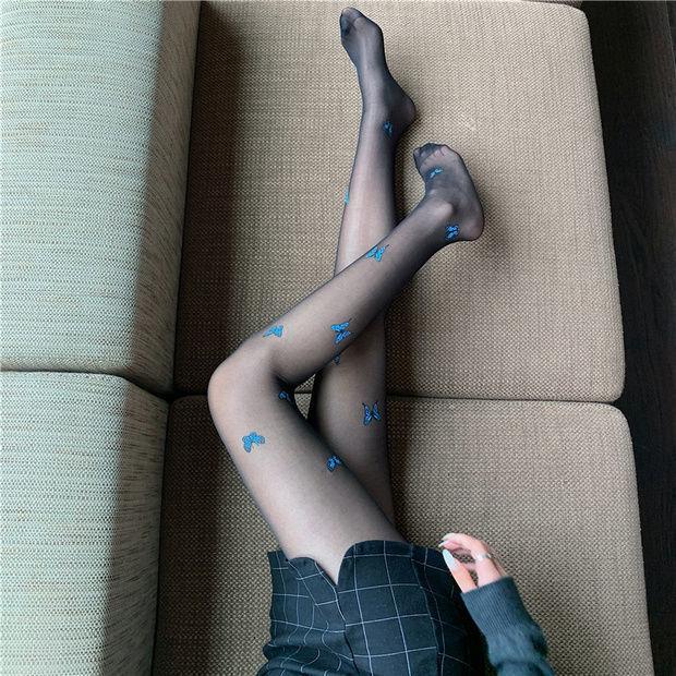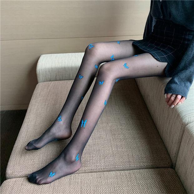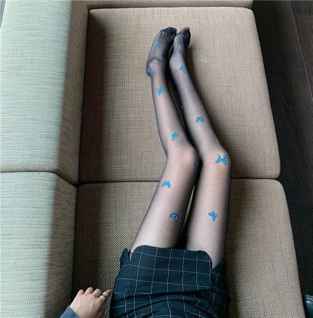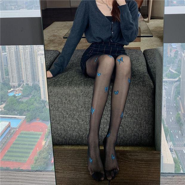 Medias de seda finas de corte arbitrario con mariposa azul, malla de seda negra y roja, pantimedias sexys, calcetines de seda ajustados con gancho y pierna anti-gancho.