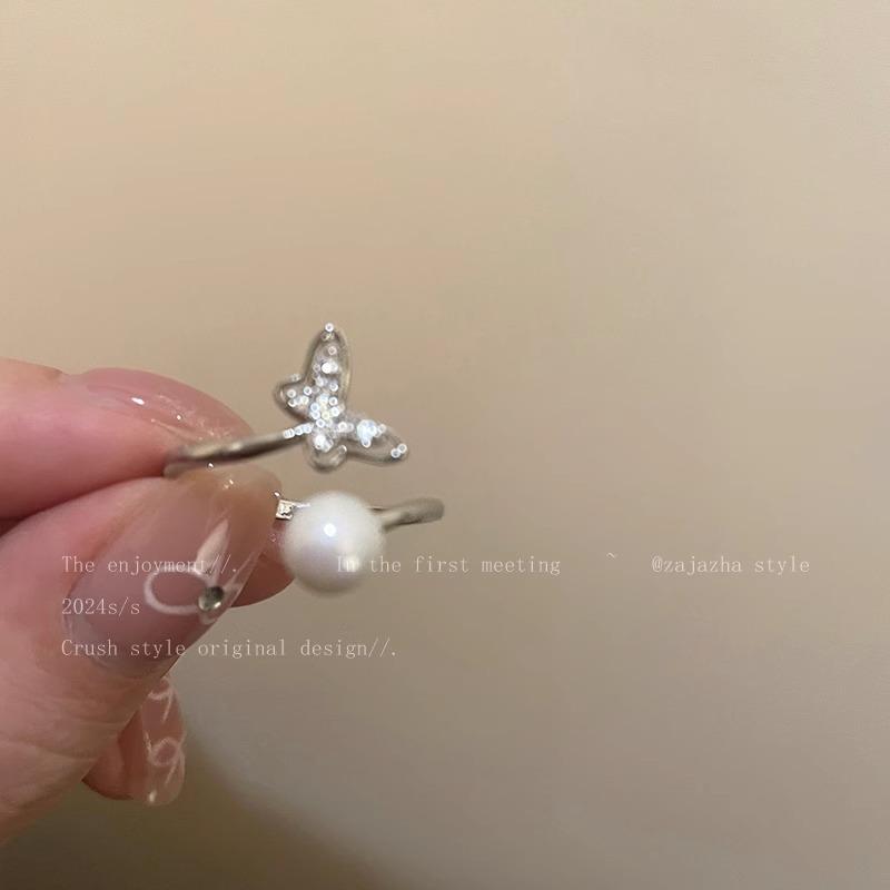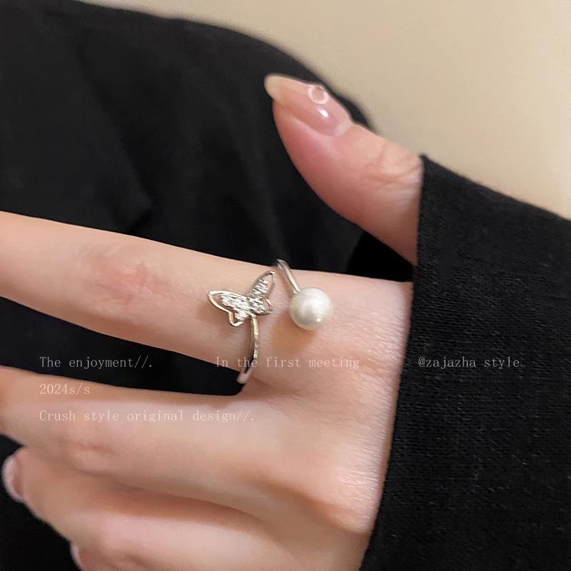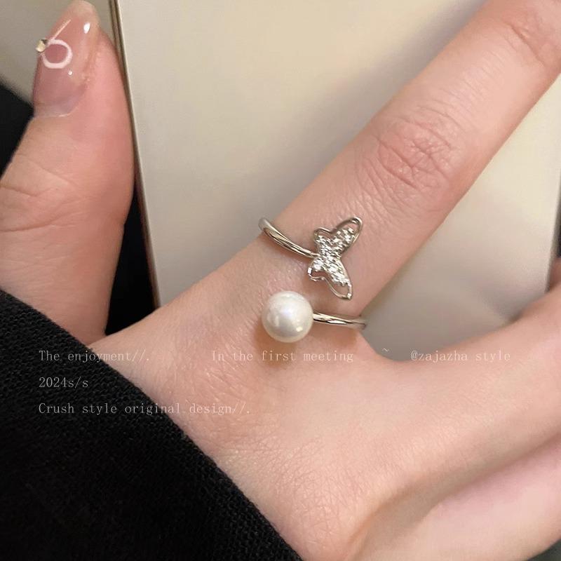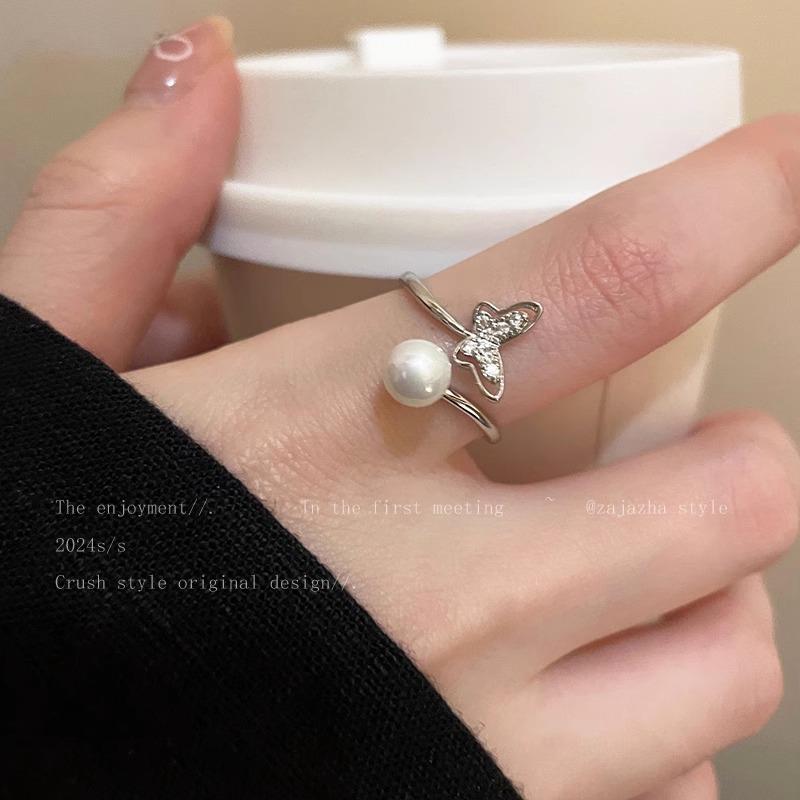 Anillo Francés Simple de Mariposa y Perla Diseño Nicho de Alta Gama Combinable Lujo Ligero Elegante Distintivo Anillo de Dedo