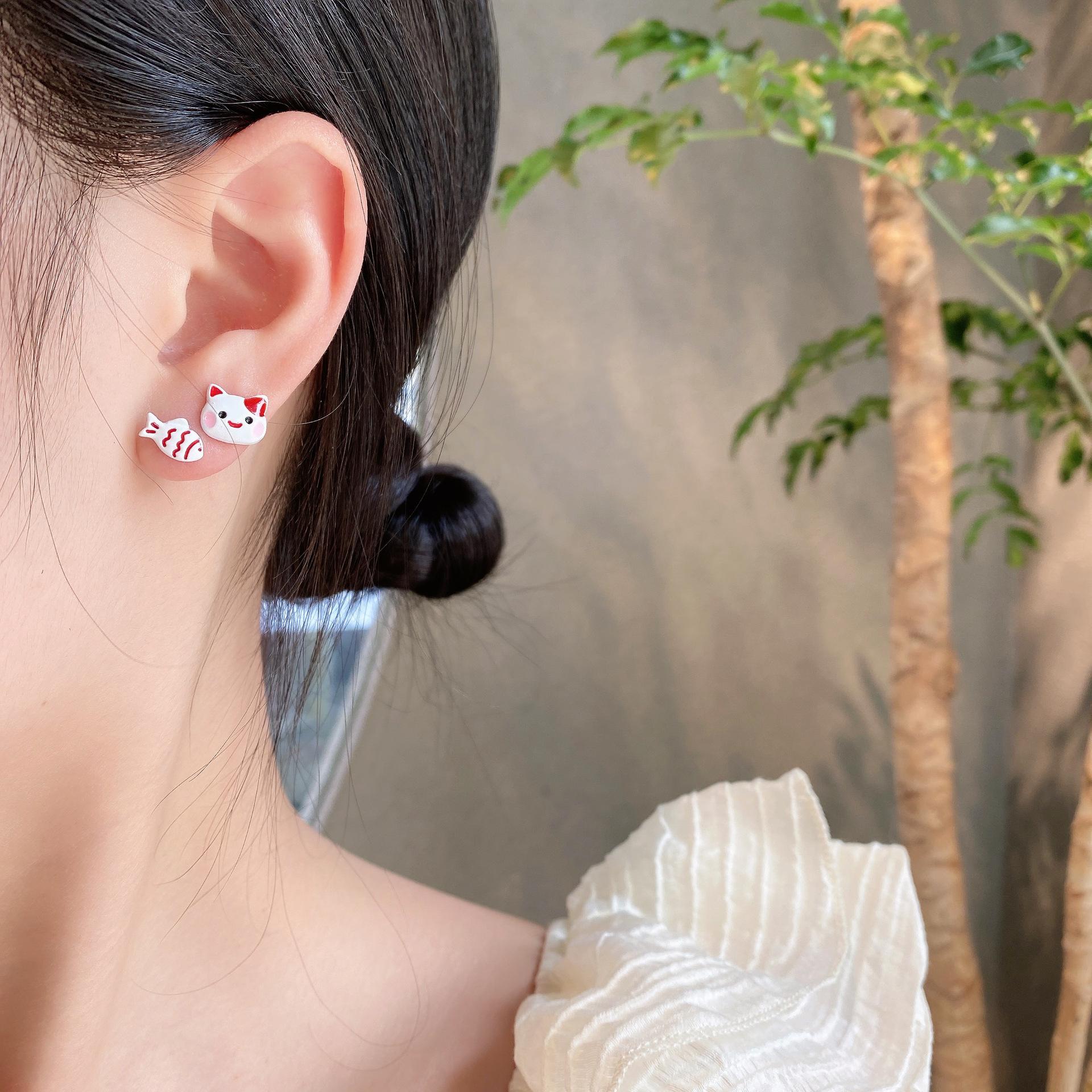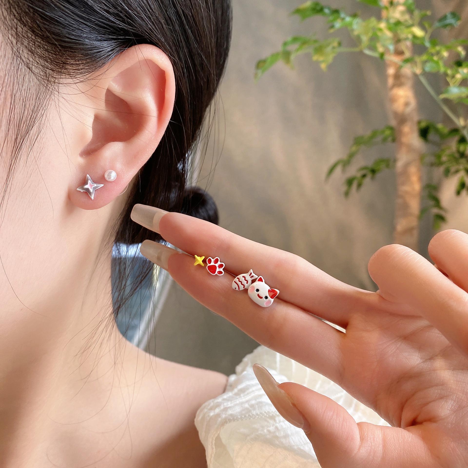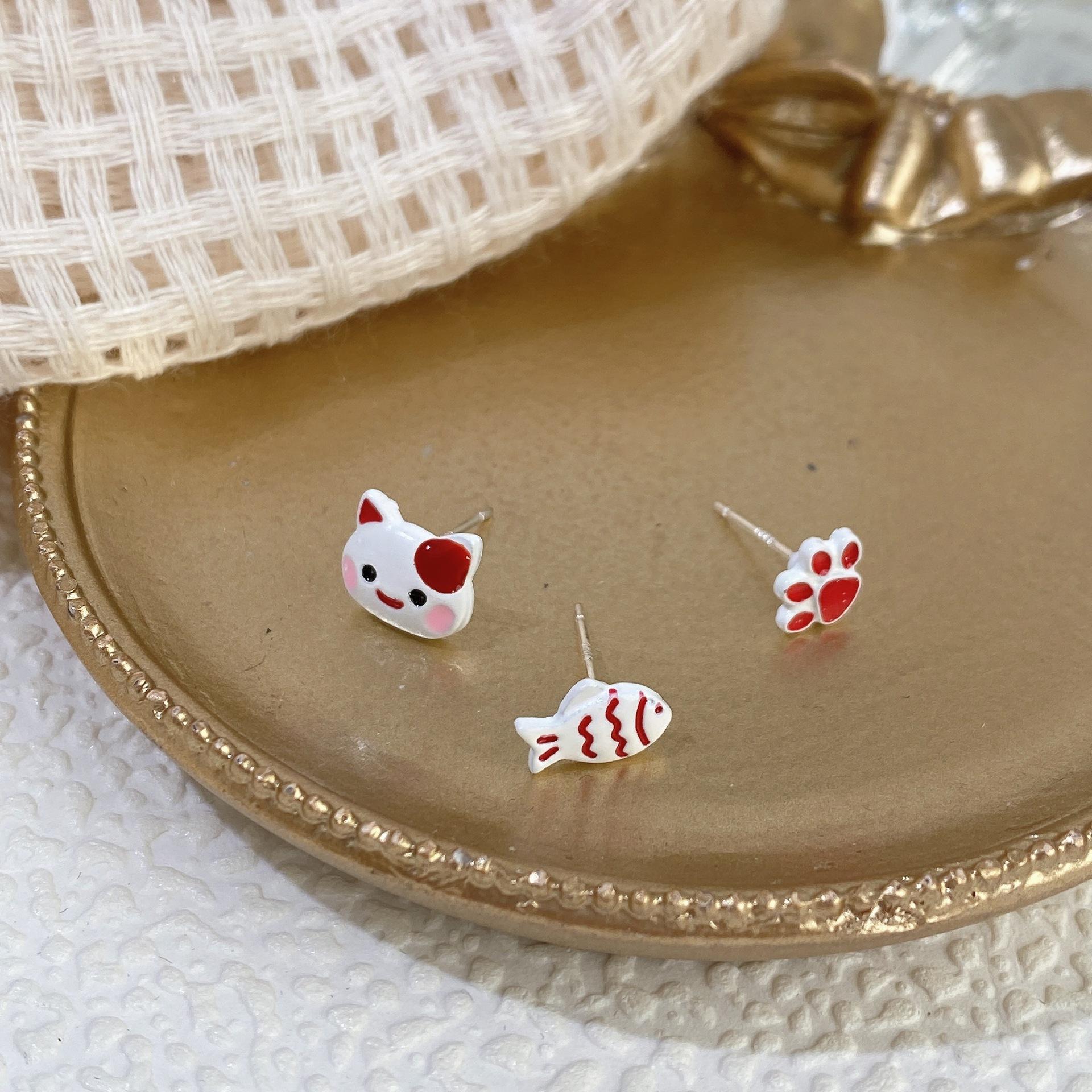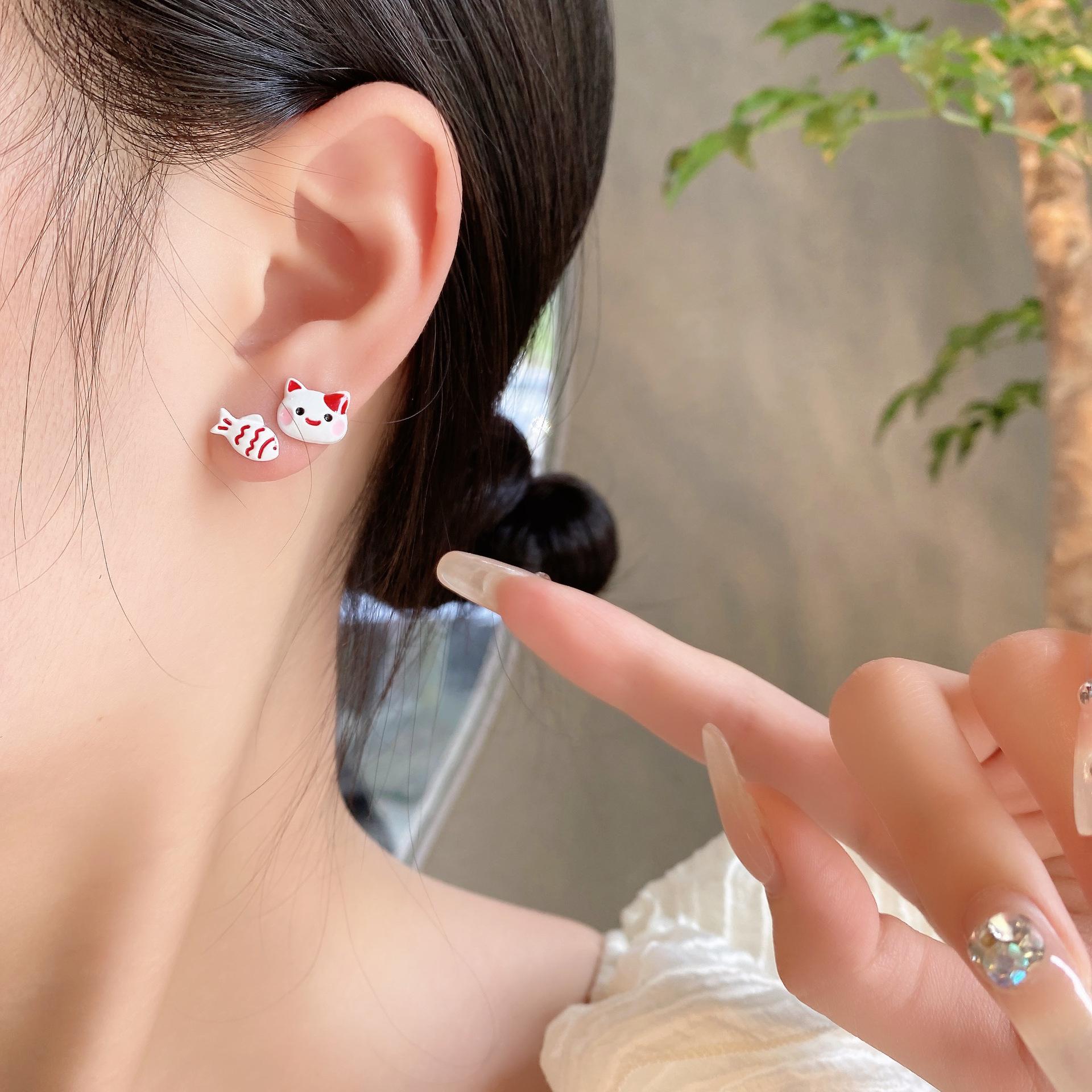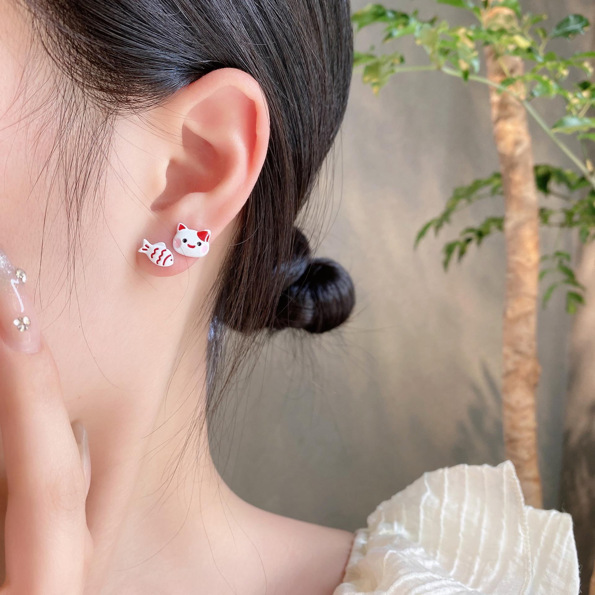 Pendientes de gato de dibujos animados con forma de pargo quemado, combinación de nuevos estilos, pequeños y exquisitos, pendientes de novia para mujer, con uñas de hueso.