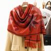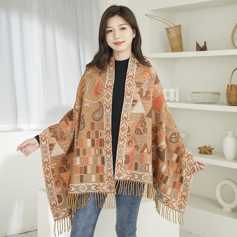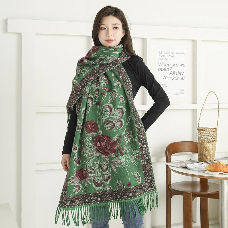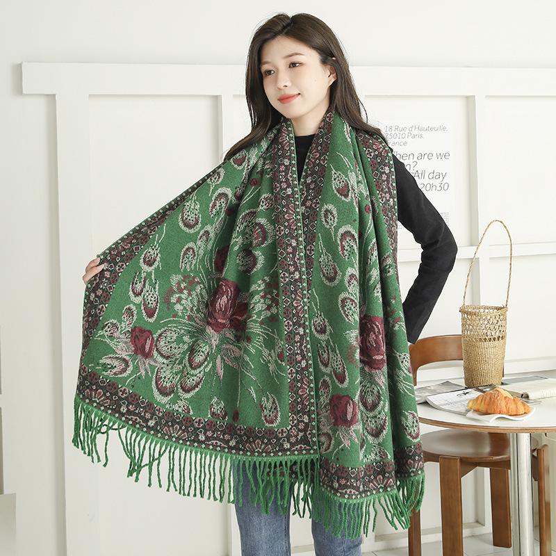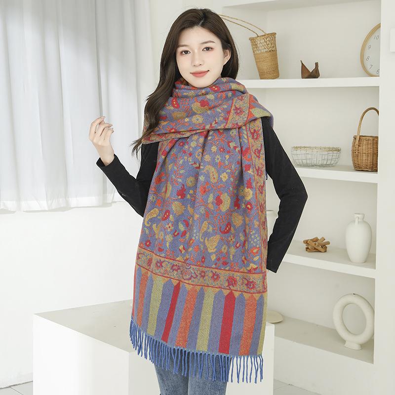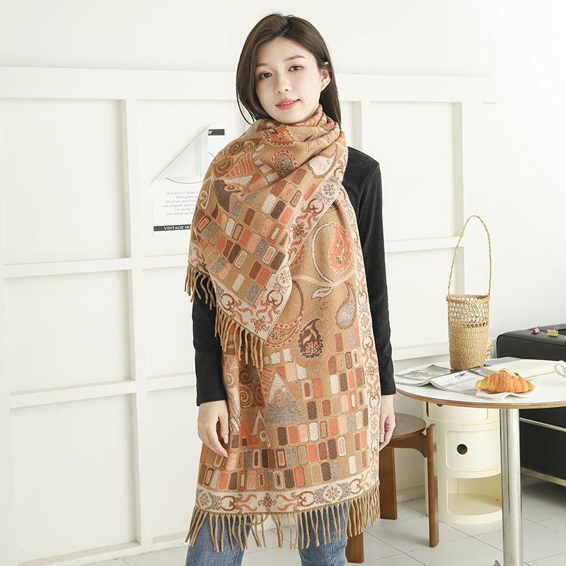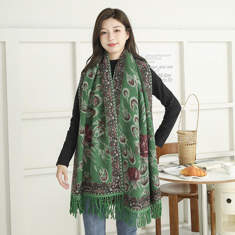 Bufanda de estilo étnico para mujer, de invierno, de imitación de cachemira de alta gama, chal para mujer con borlas, bufanda vintage de jacquard.