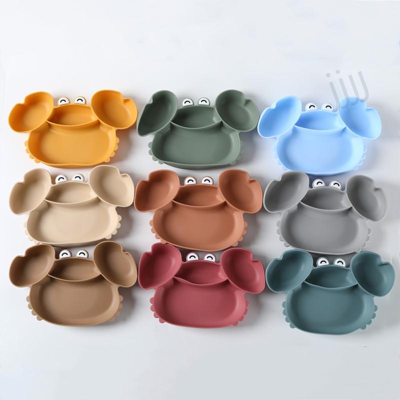 Plato de rejilla de silicona para niños, plato de cangrejo de dibujos animados, vajilla de suplemento alimenticio para bebés integrada, plato resistente a caídas con ventosa