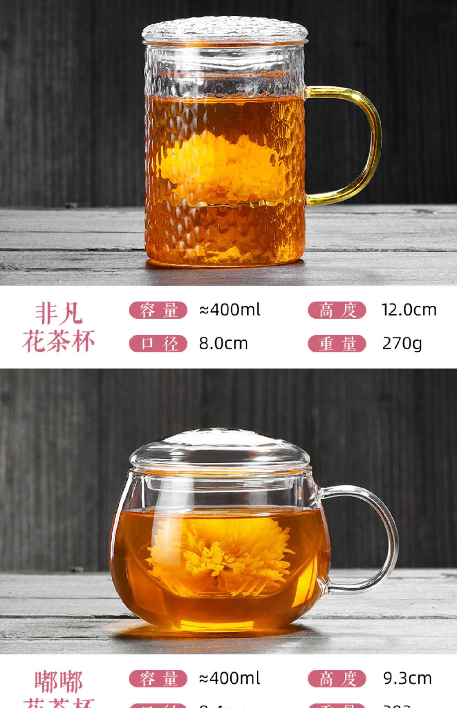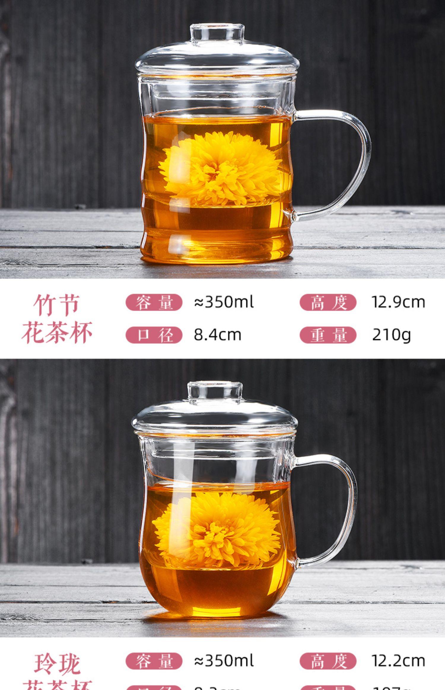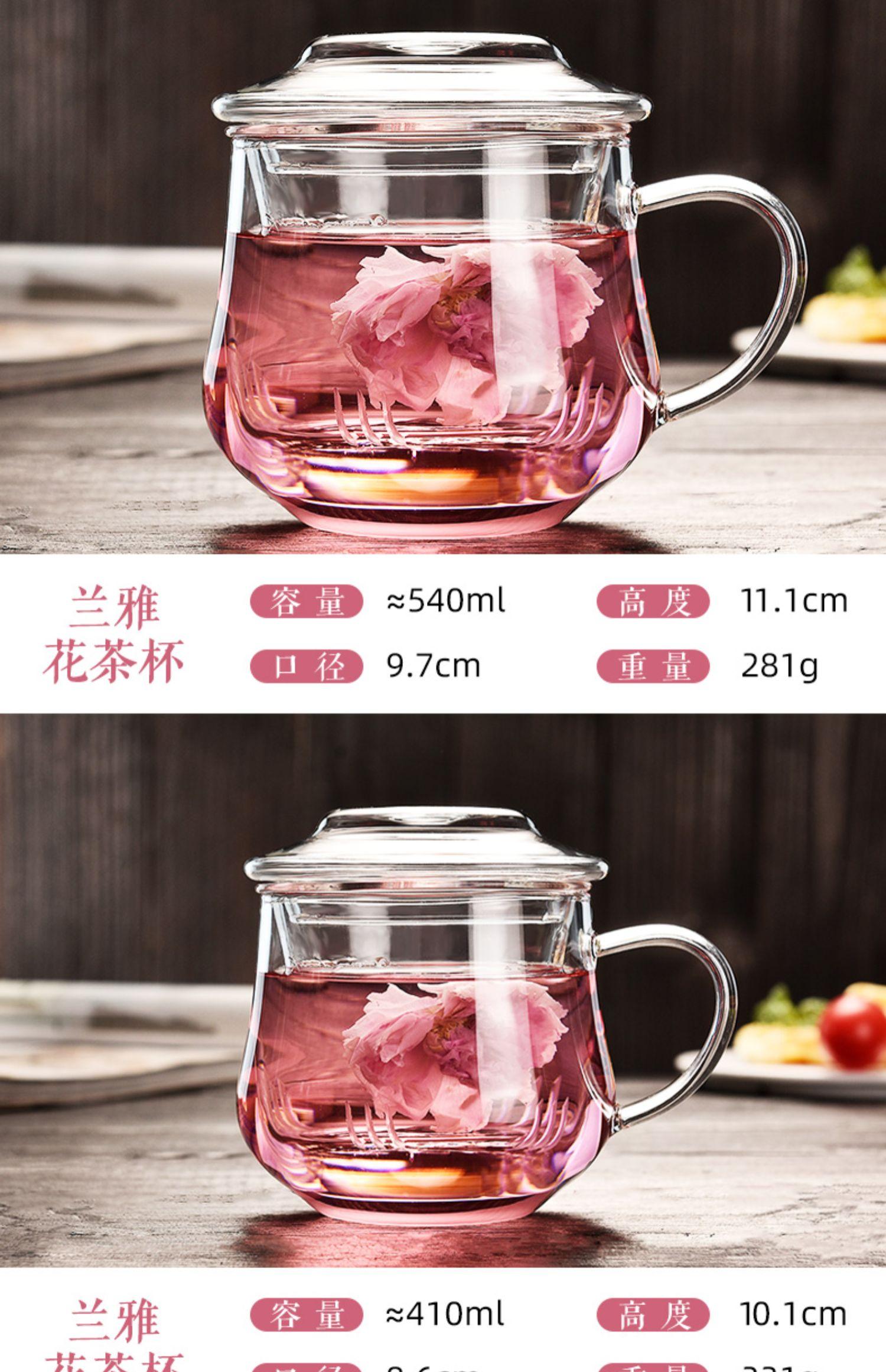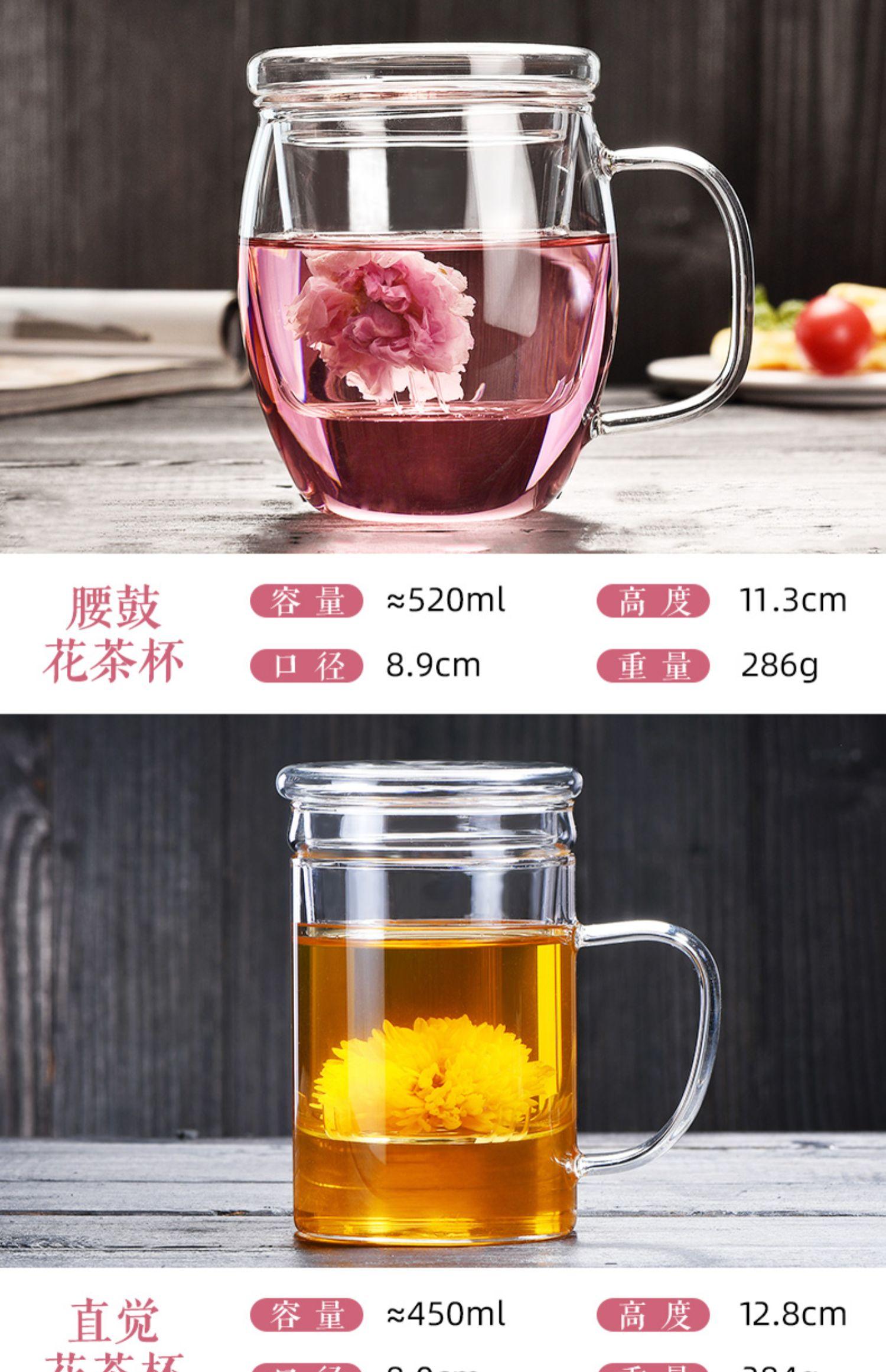 Taza de té de vidrio resistente al calor con forma de flor, transparente, para el hogar, con tapa con asa, con filtro separador de té espesado para oficina.