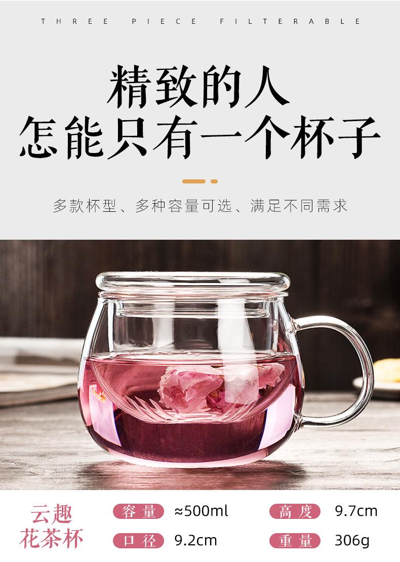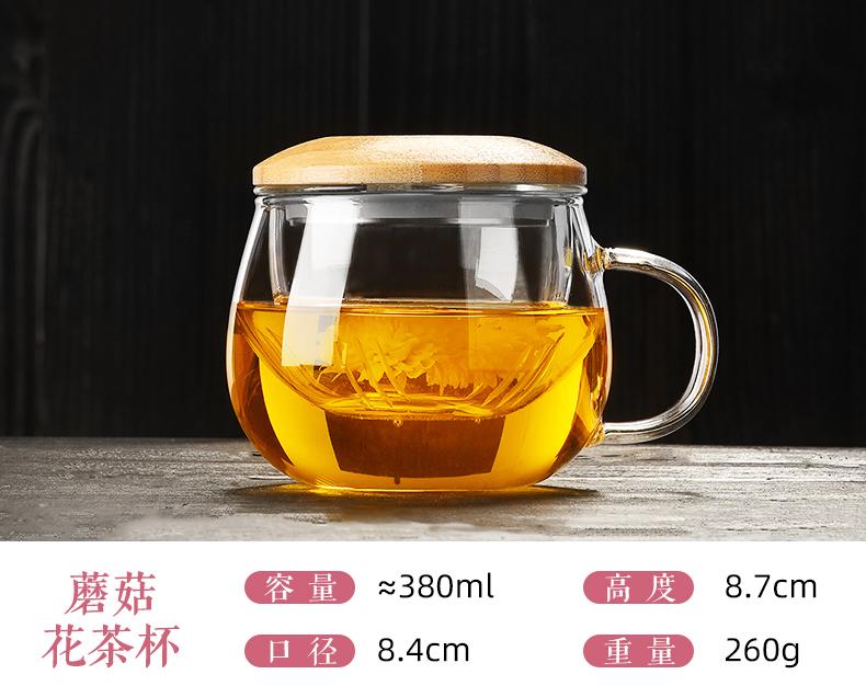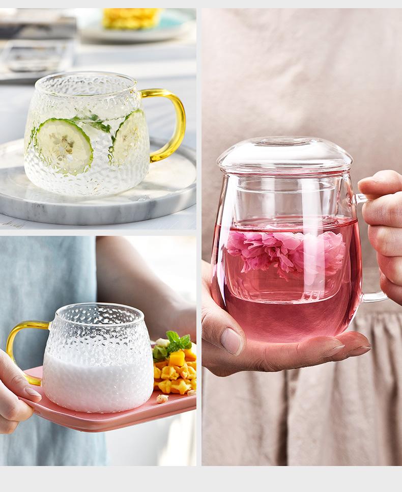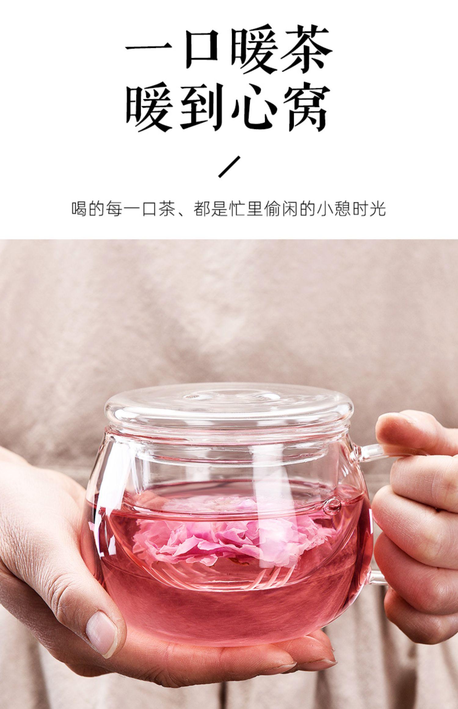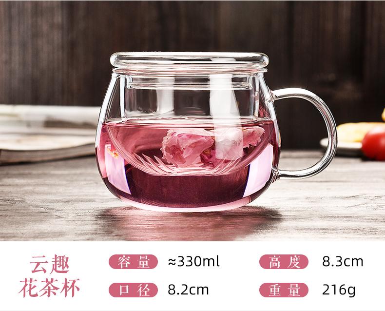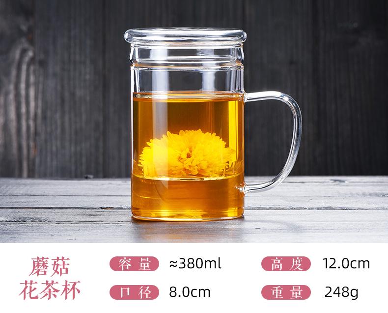 Taza de té de vidrio resistente al calor con forma de flor, transparente, para el hogar, con tapa con asa, con filtro separador de té espesado para oficina.