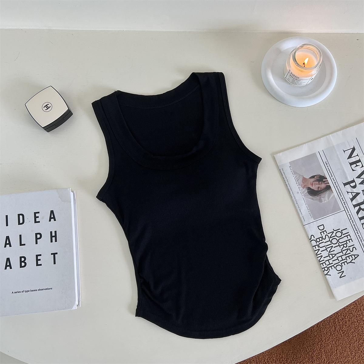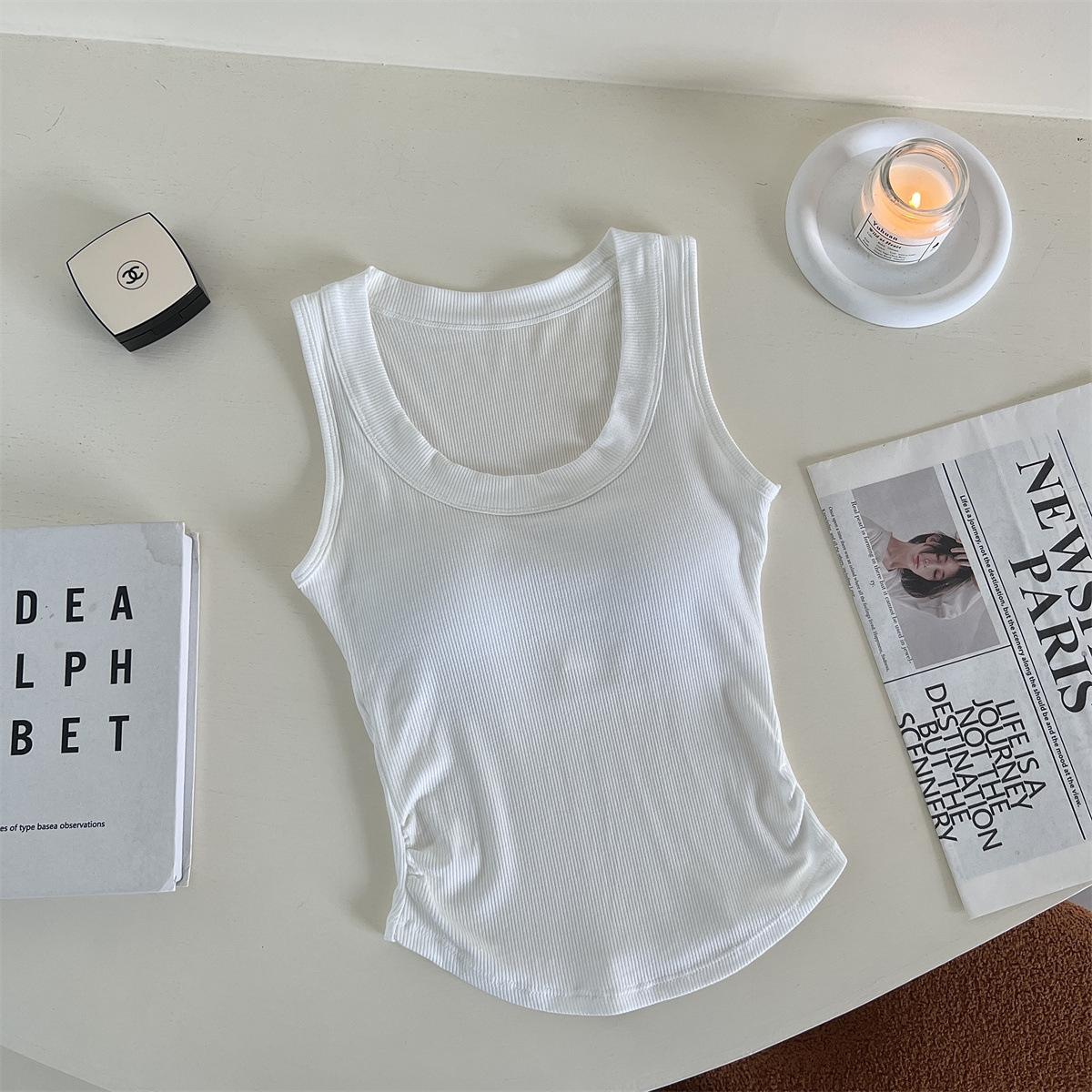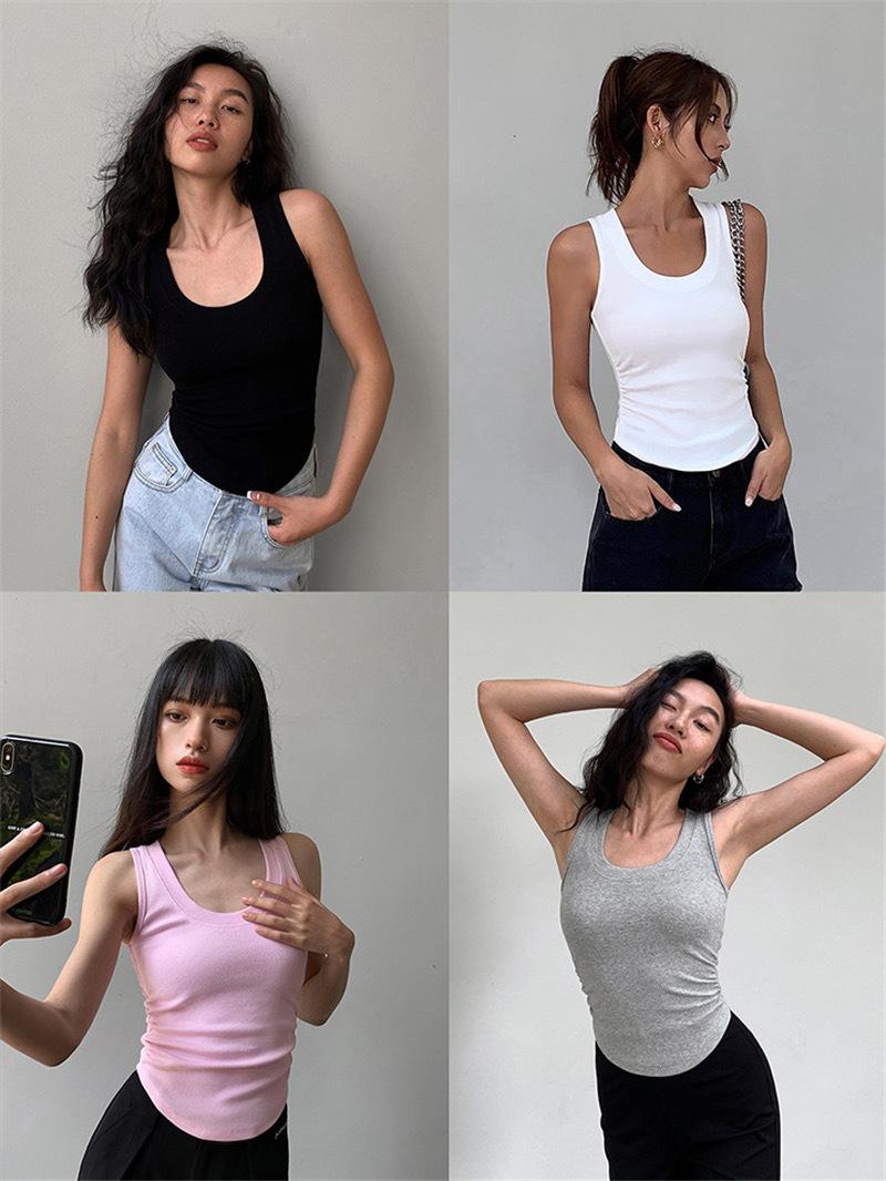 Chaleco básico de color liso con cuello en U y almohadilla para el pecho, estilo americano, estilo chica sexy, diseño de cintura plisada, sin mangas para mujer