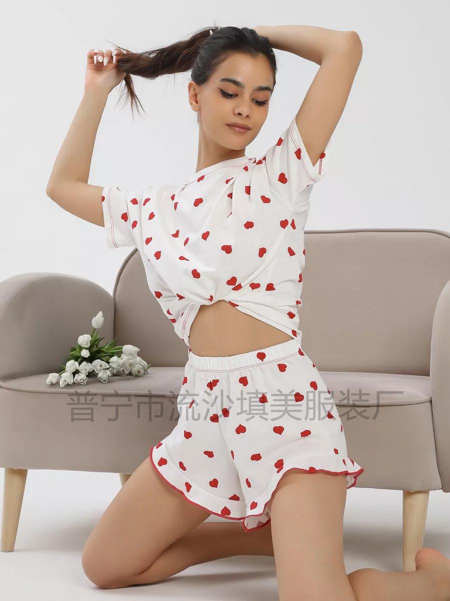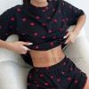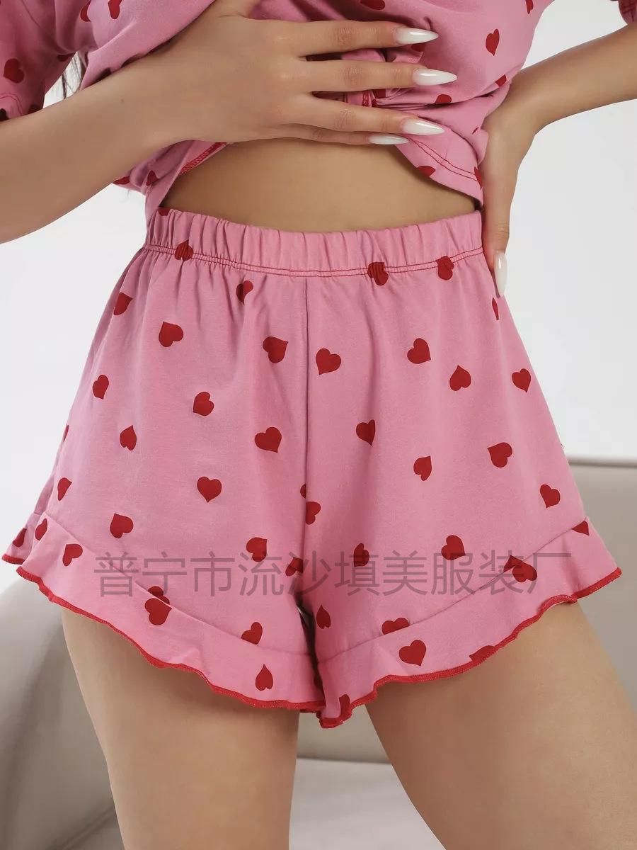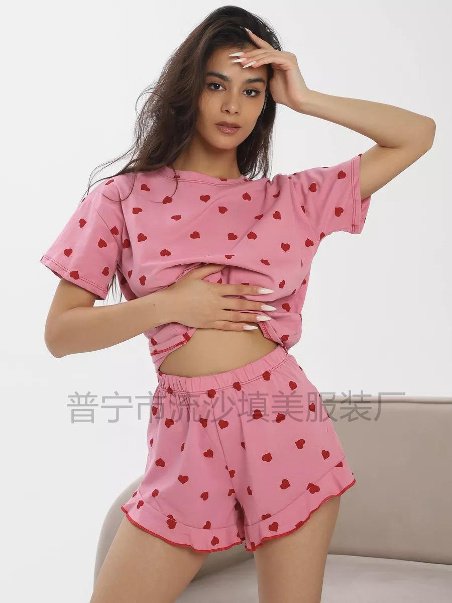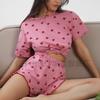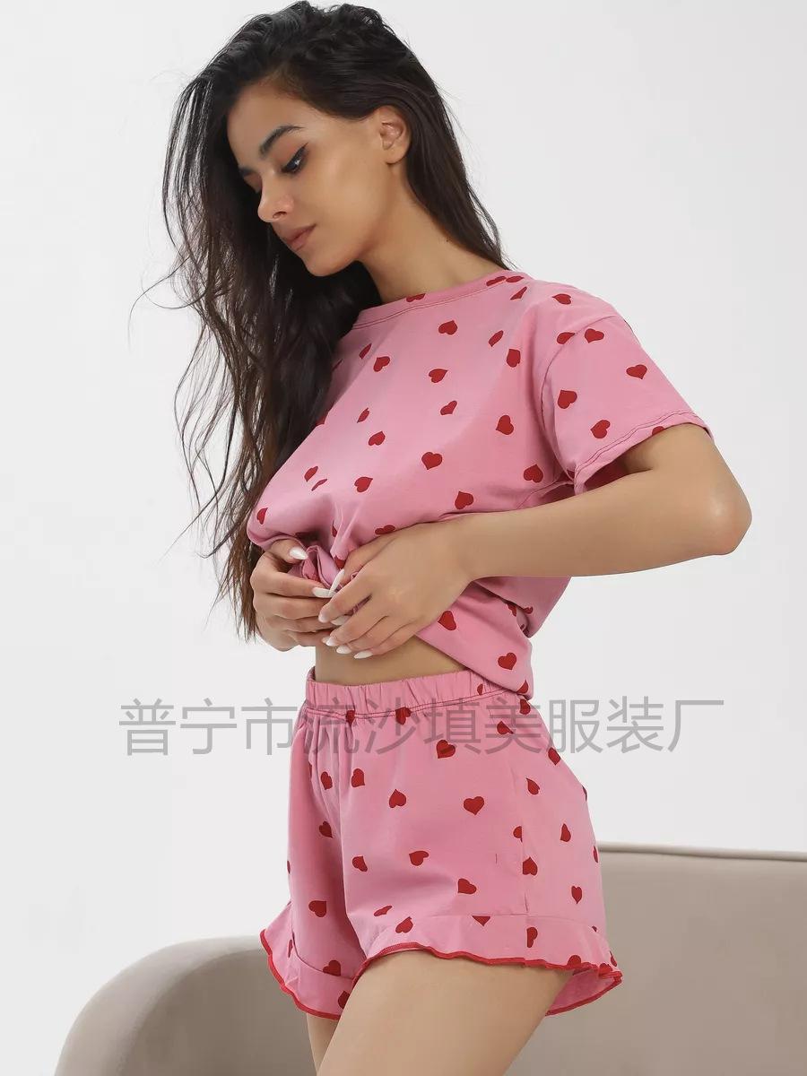 Conjunto de pijama de dos piezas para mujer, ropa de casa, cuello redondo, manga corta, estampado de amor transfronterizo, estilo europeo y americano