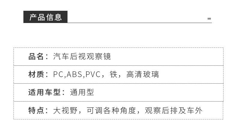 Características: 1. Lente de vidrio curvado de alta definición de gran tamaño, ajustable a varios ángulos, para observar los asientos traseros y el exterior del automóvil.