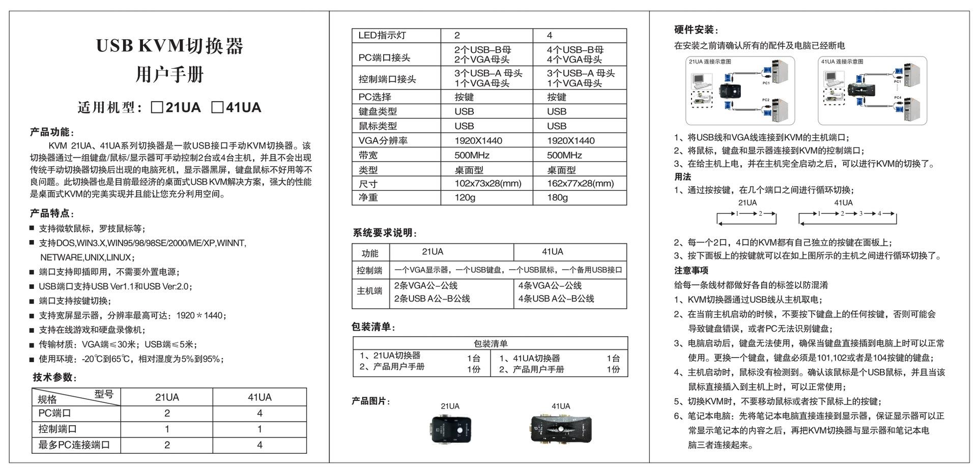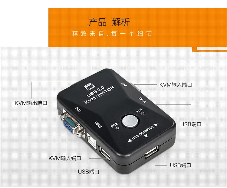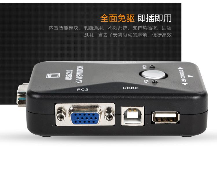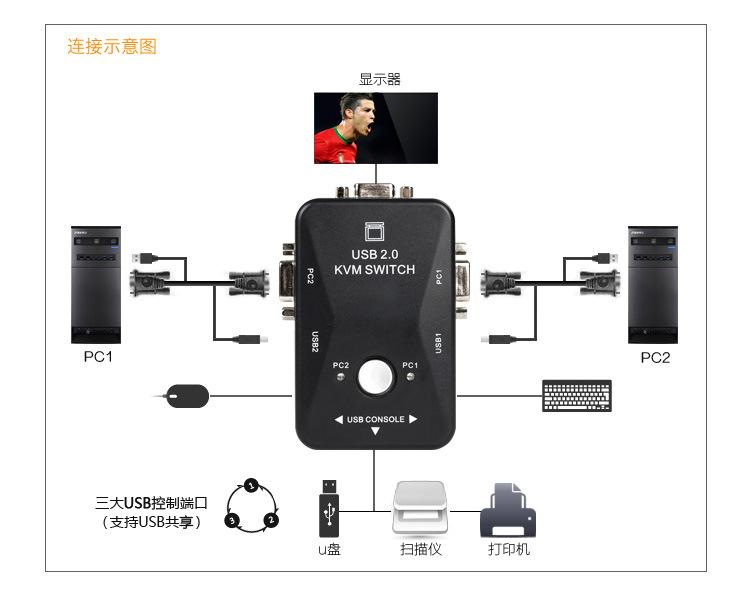 1. Interfaz de entrada: 2 puertos de impresión USB + 2 puertos de video VGA; 2 hosts pueden conmutar para usar 1 juego de mouse, teclado y equipo de visualización