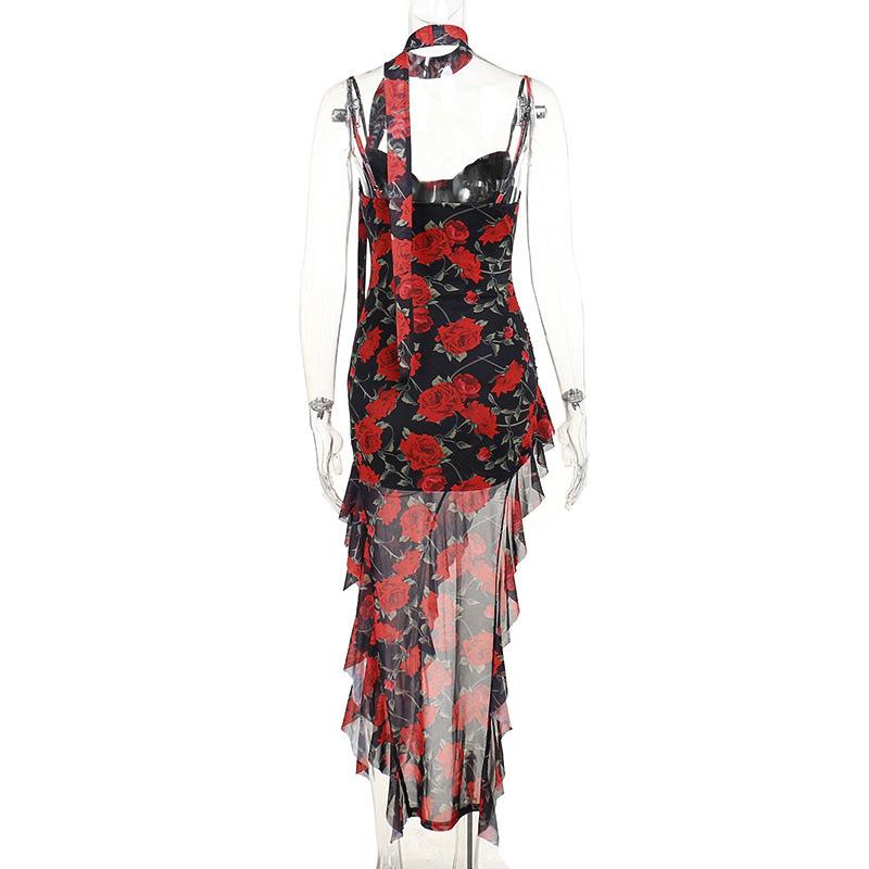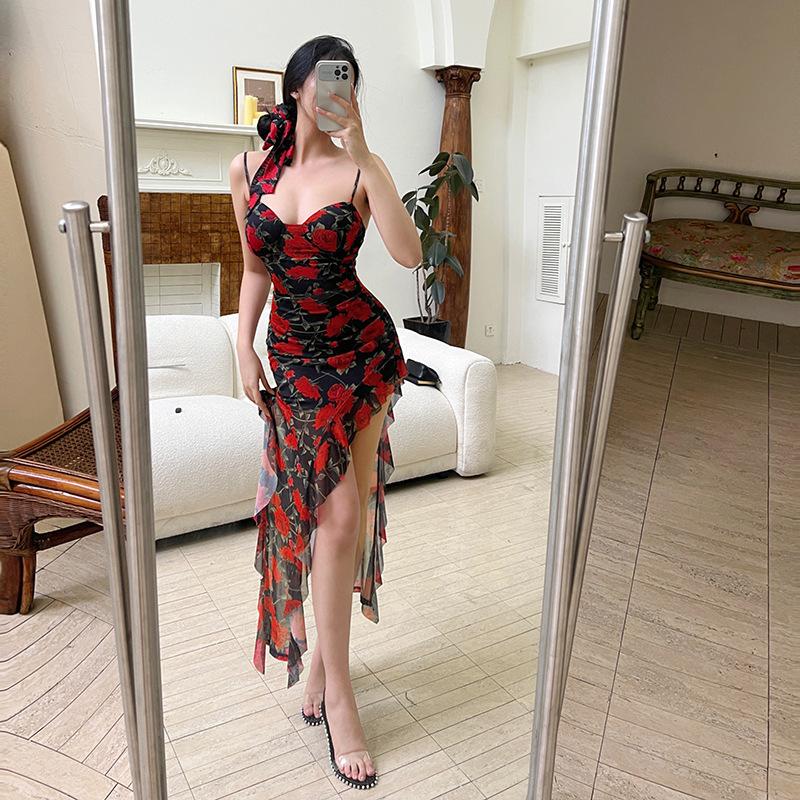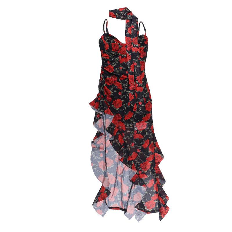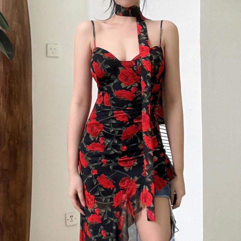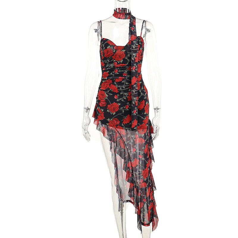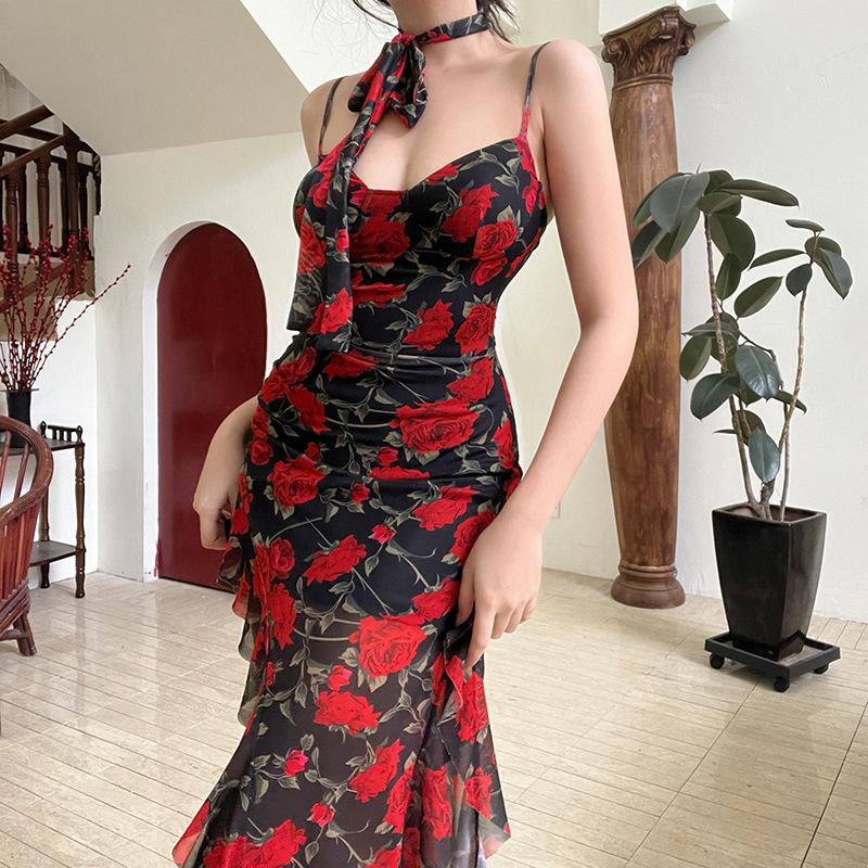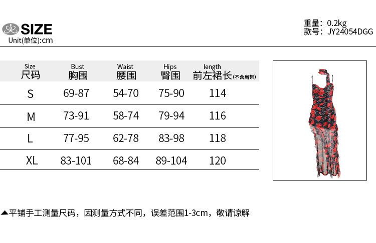JY23103 - Falda larga con tirantes y estampado floral en el pecho para mujer, ropa transfronteriza, vestido de cintura estrecha, 2023 |