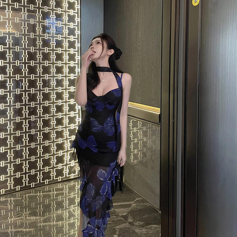 YY23577 Vestido con apliques de copa en el pecho estilo europeo y americano, otoño 2023, nuevo, con tirantes en la cintura, falda larga a la cadera para chica sexy |