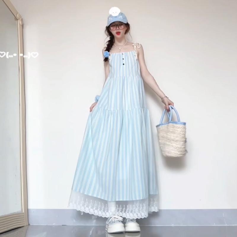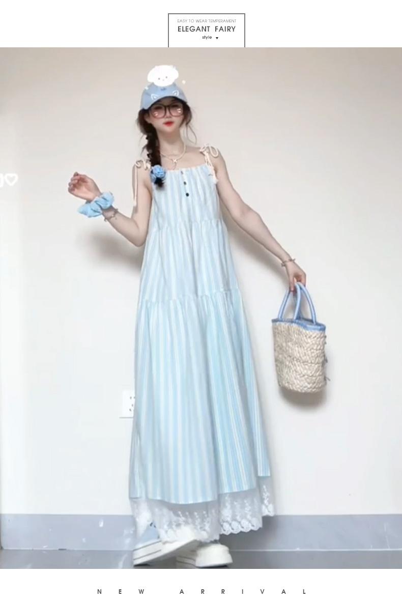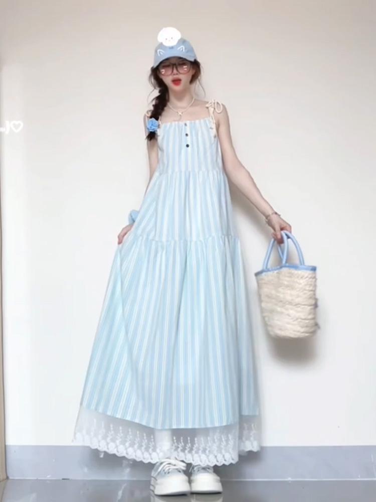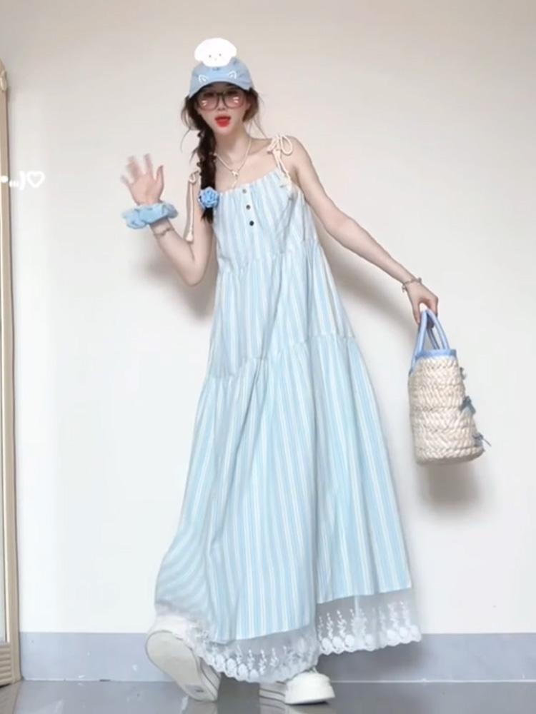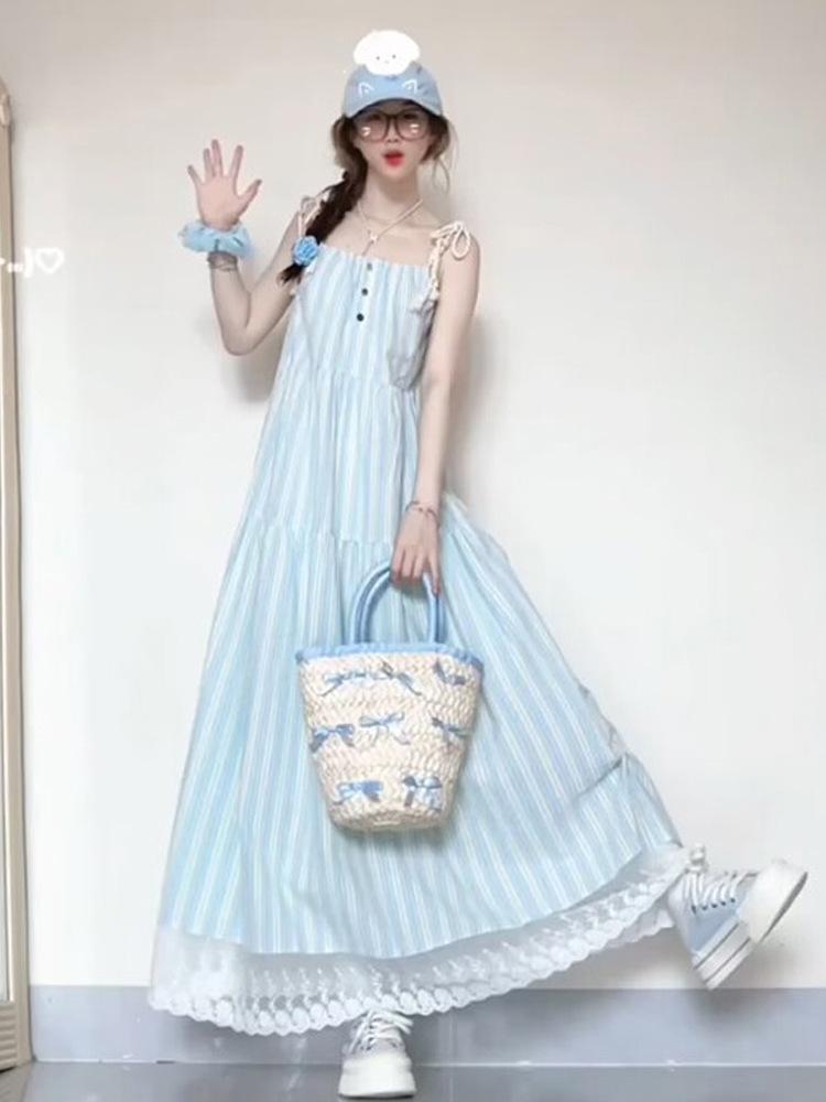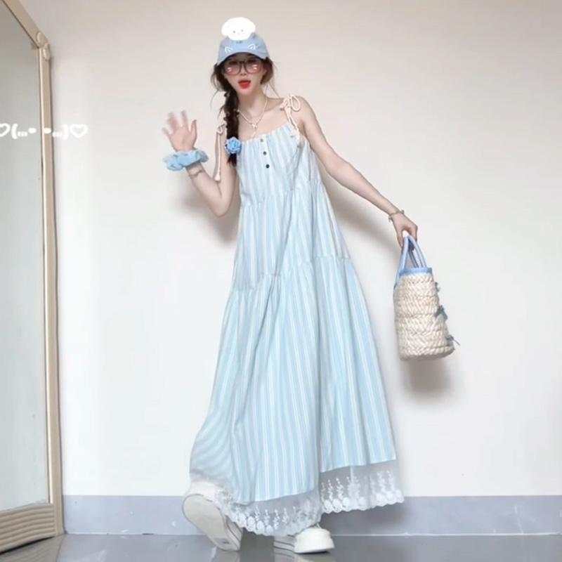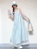 Vestido de tirantes de rayas azules francesas para niños, verano 2025, vestido largo pequeño para vacaciones en la playa.