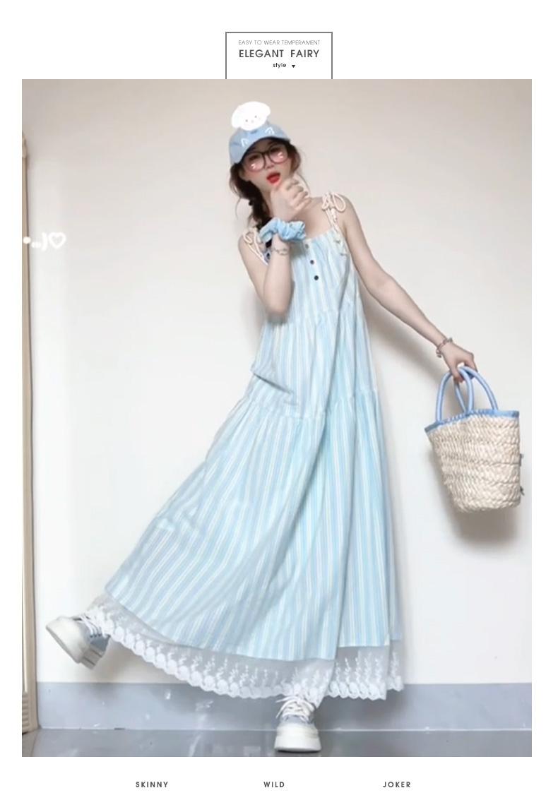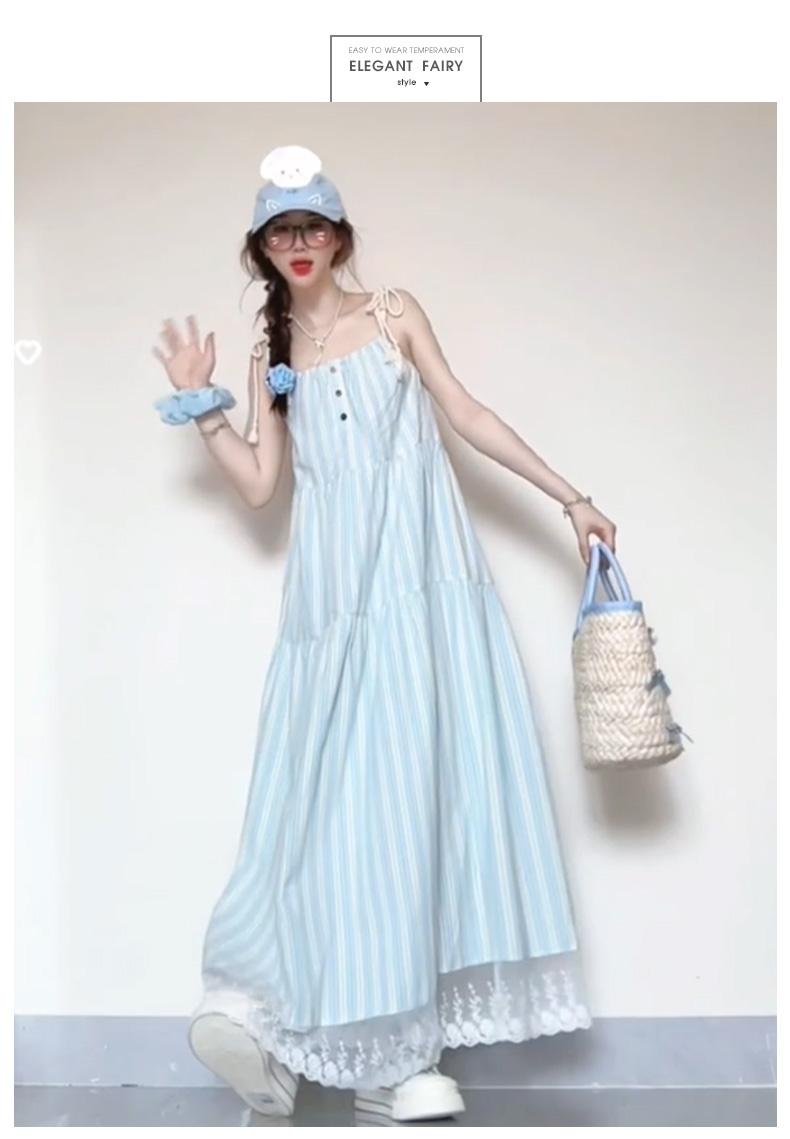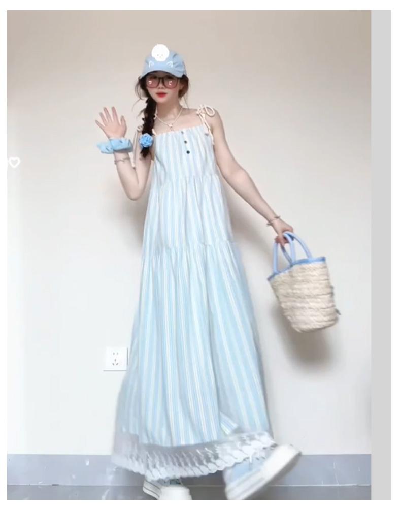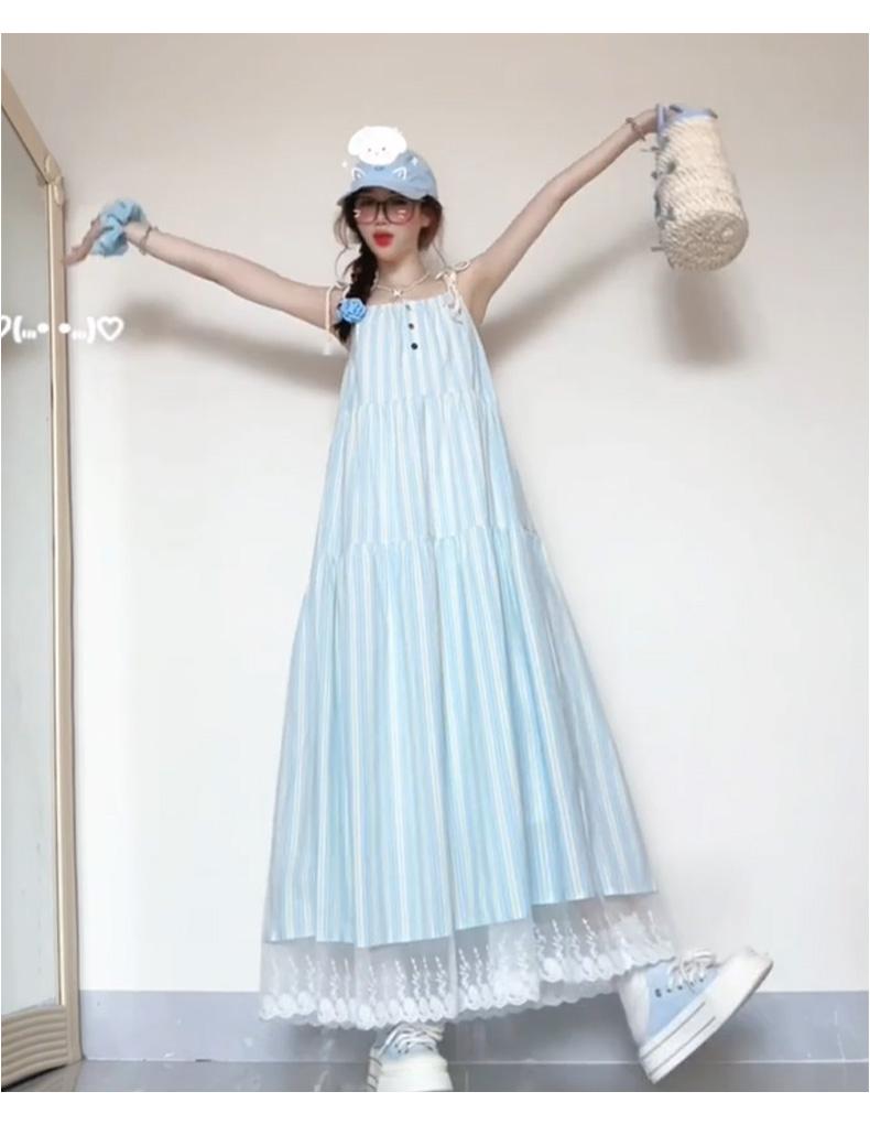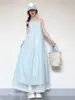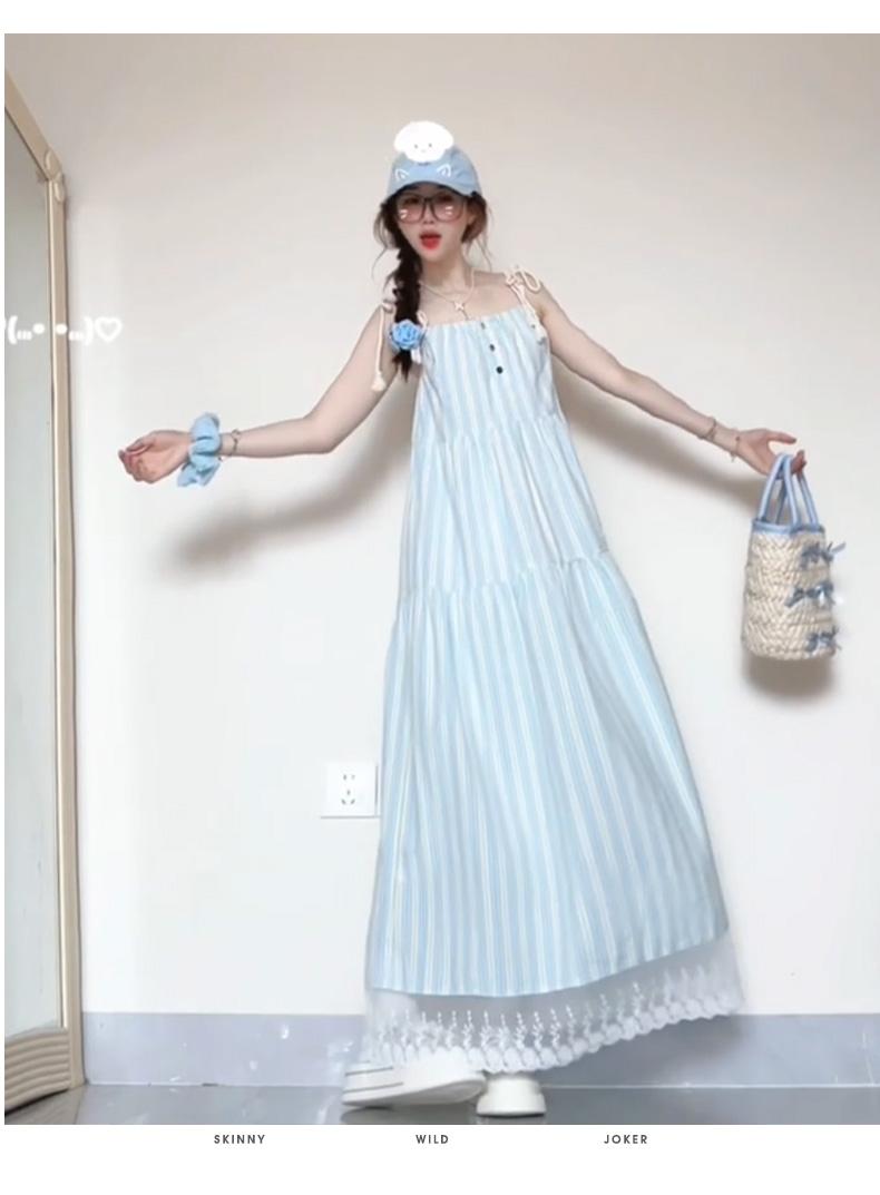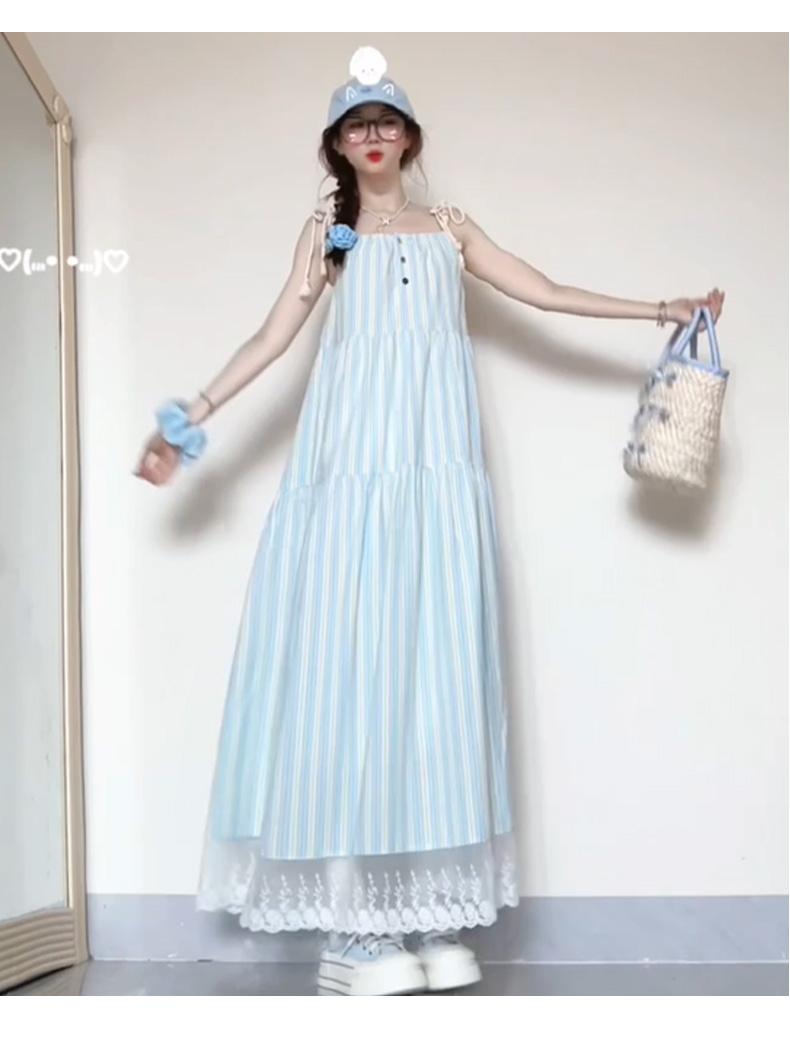 Vestido de tirantes de rayas azules francesas para niños, verano 2025, vestido largo pequeño para vacaciones en la playa.