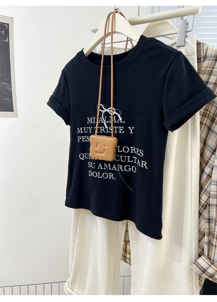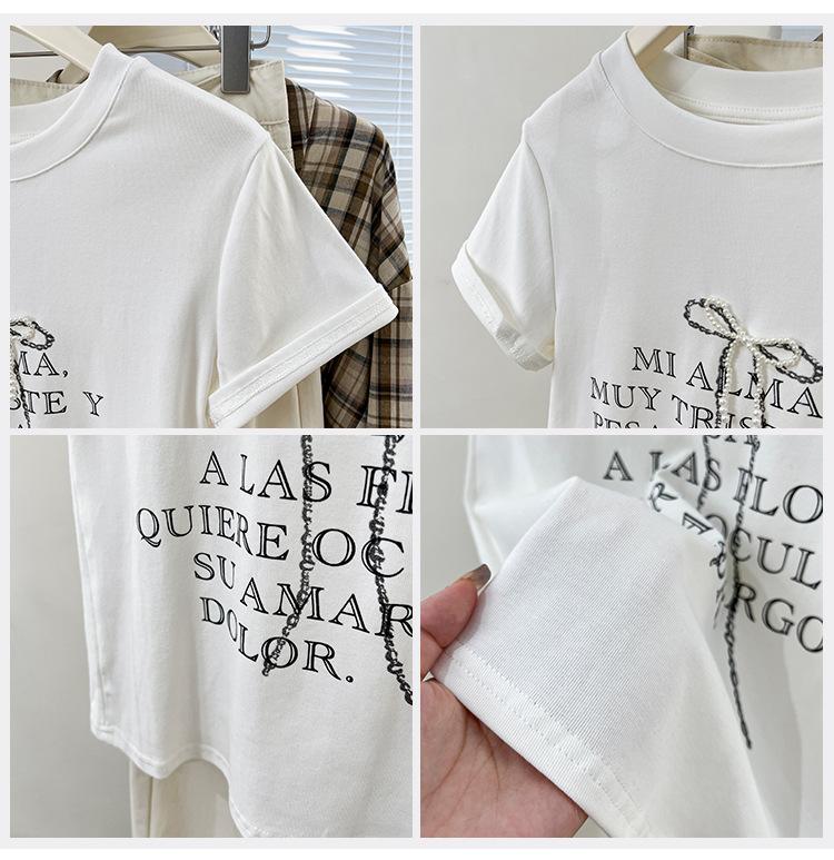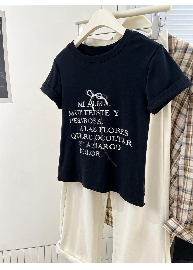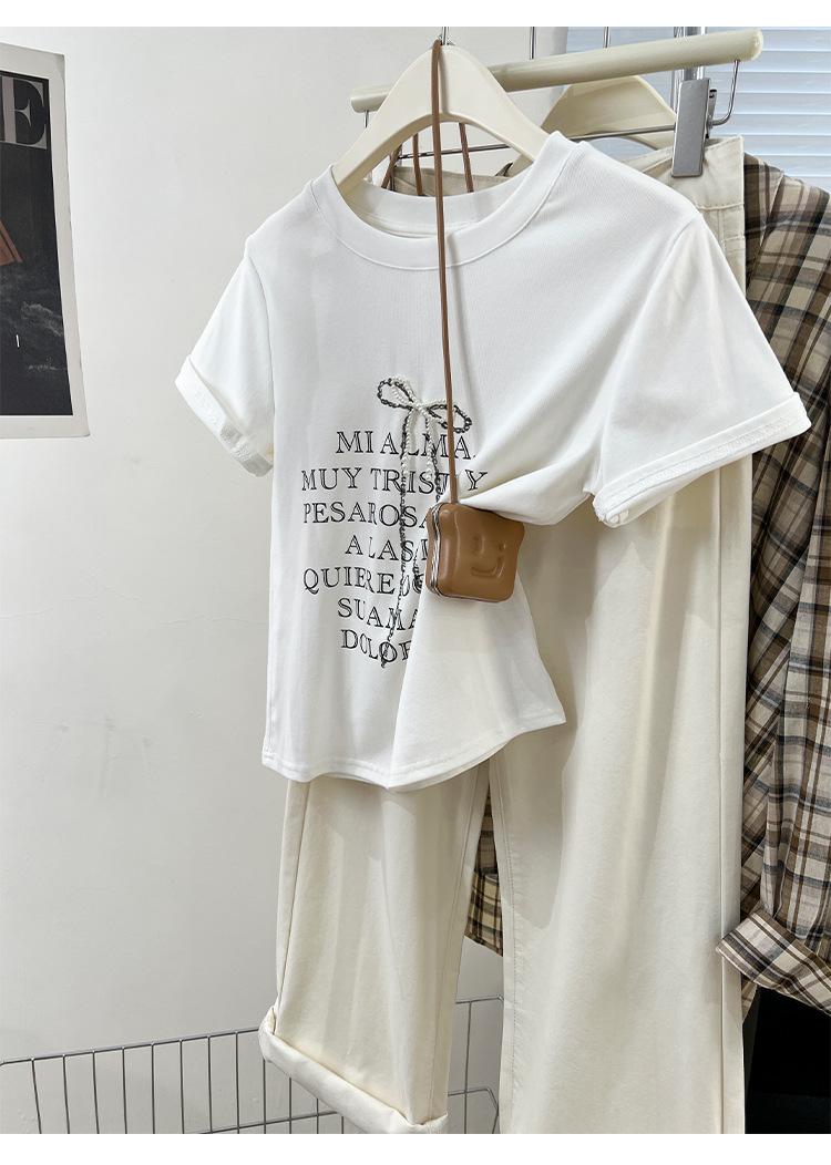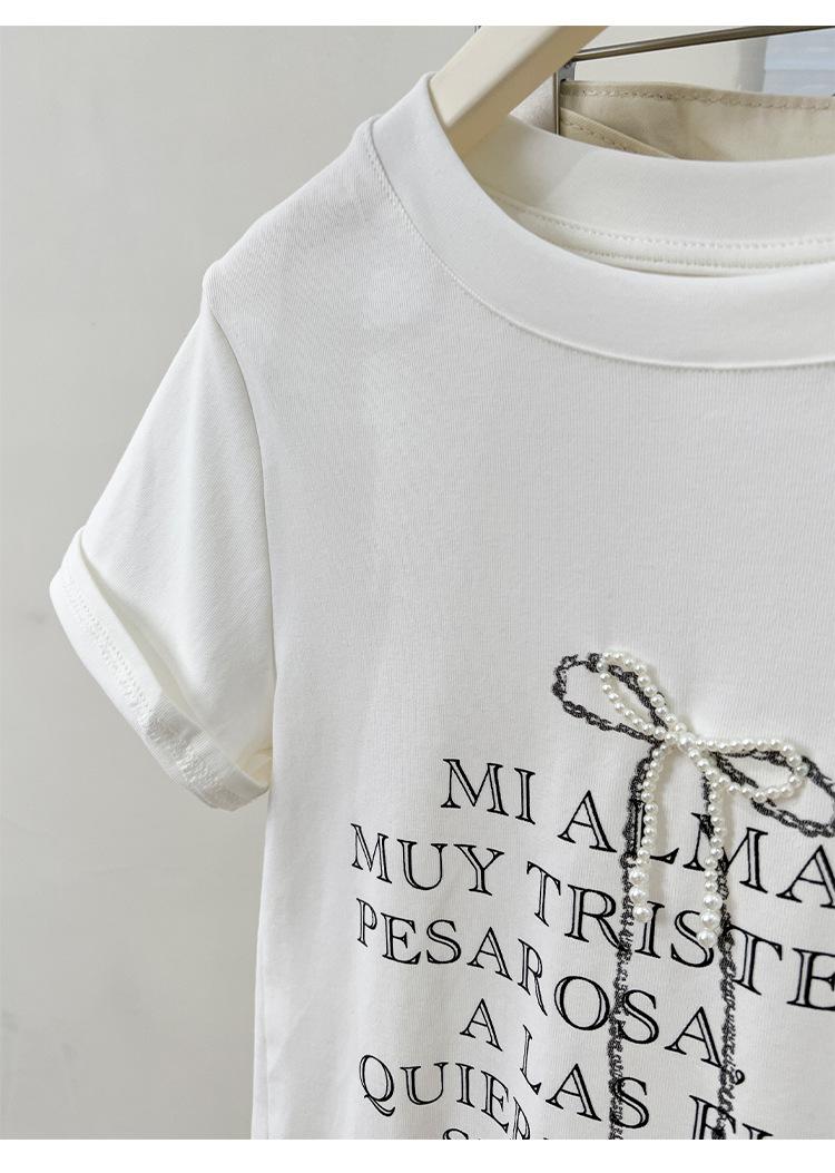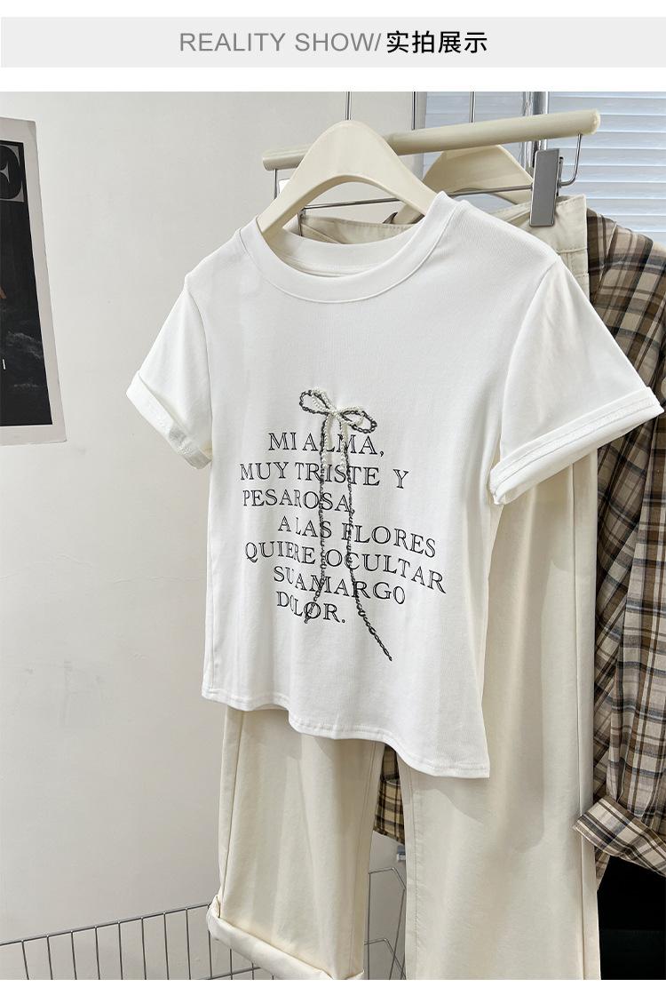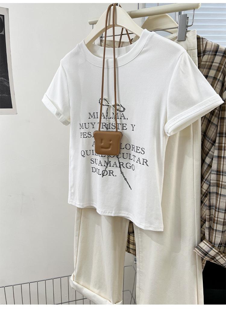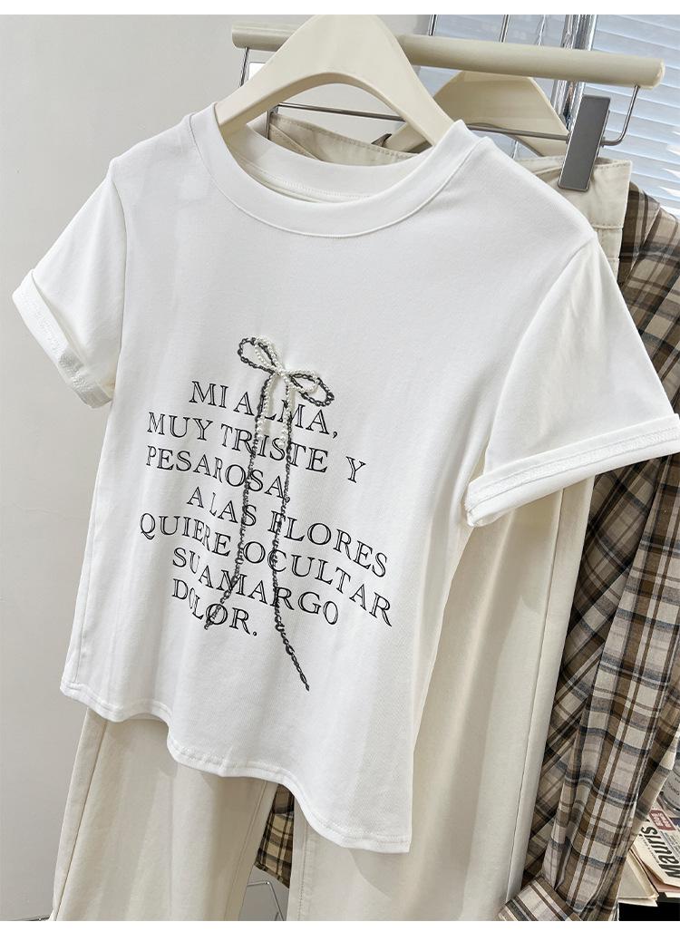 Camiseta de manga corta con cuello redondo y hombros descubiertos para mujer, con lazo estampado, de alta gama, para chicas atractivas, ajustada, de corte pequeño.