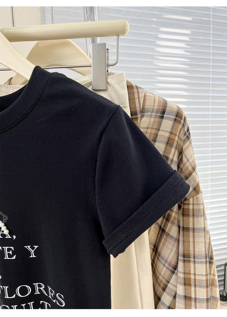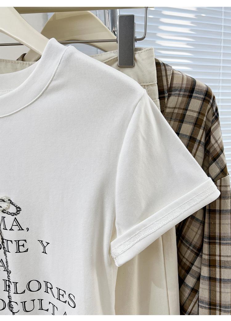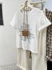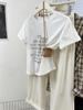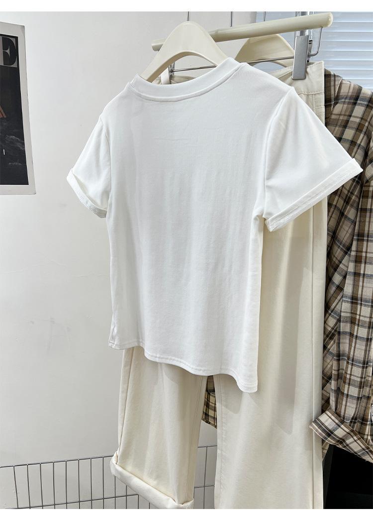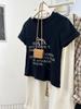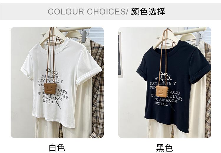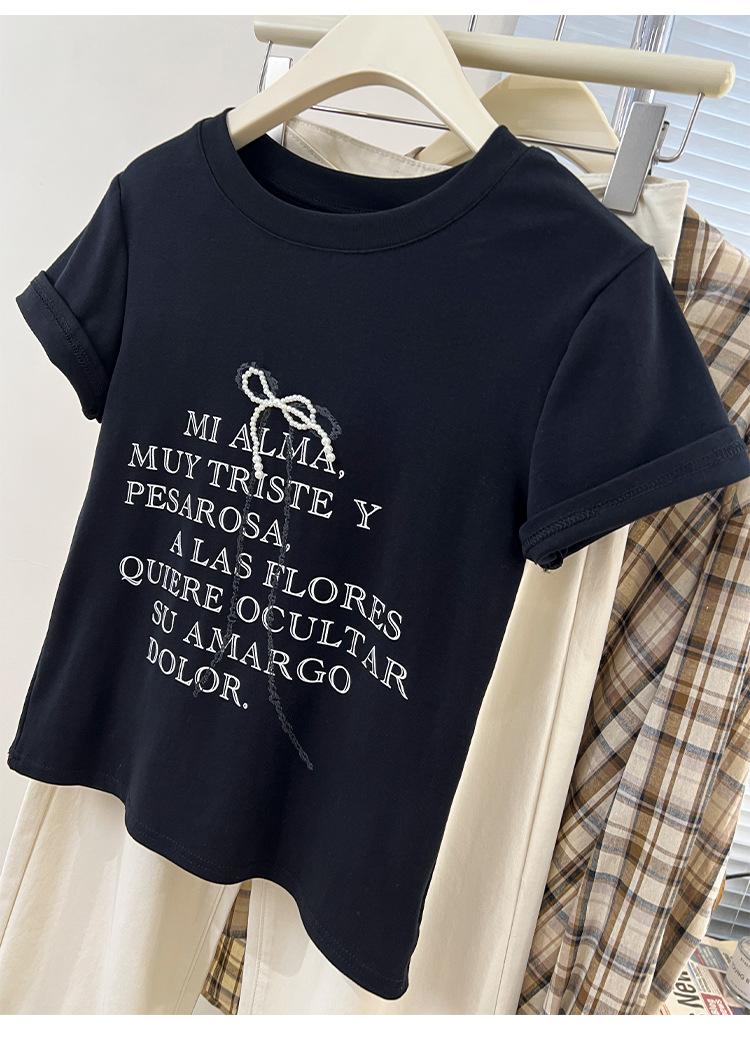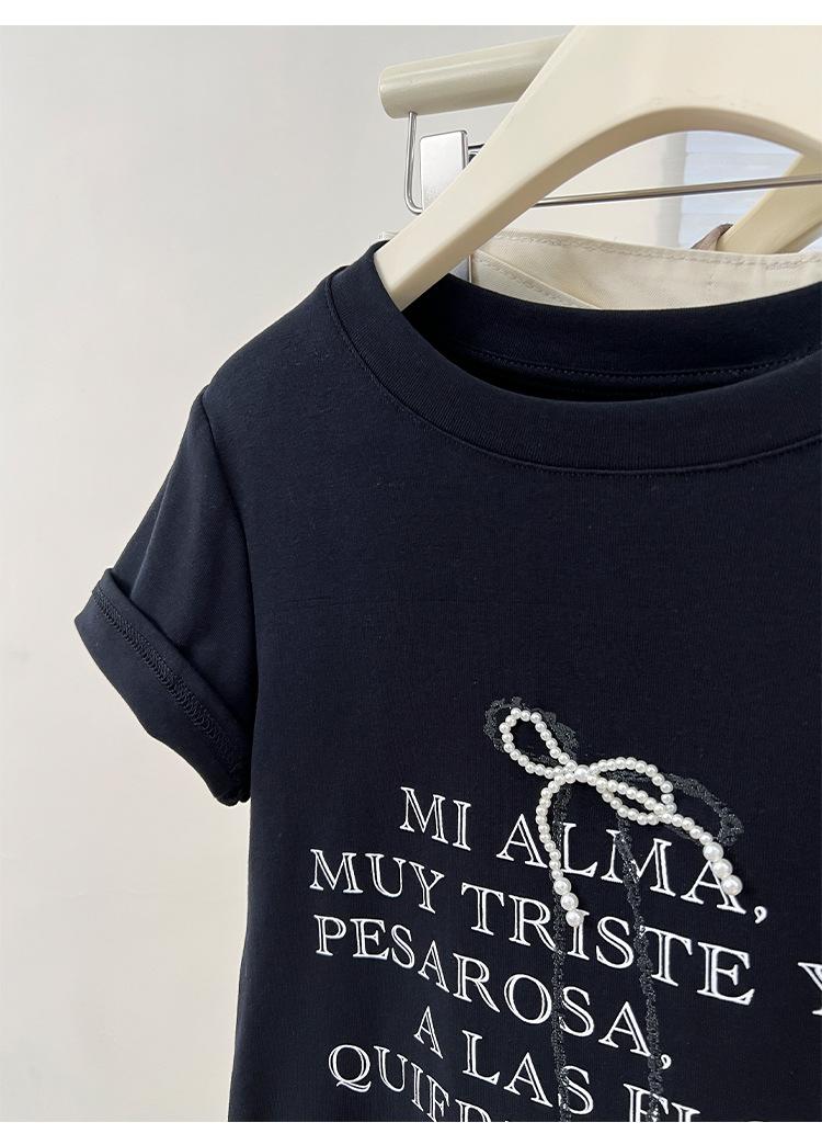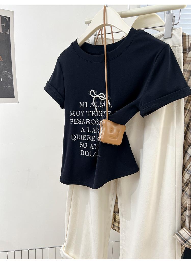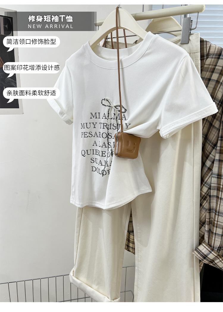 Camiseta de manga corta con cuello redondo y hombros descubiertos para mujer, con lazo estampado, de alta gama, para chicas atractivas, ajustada, de corte pequeño.