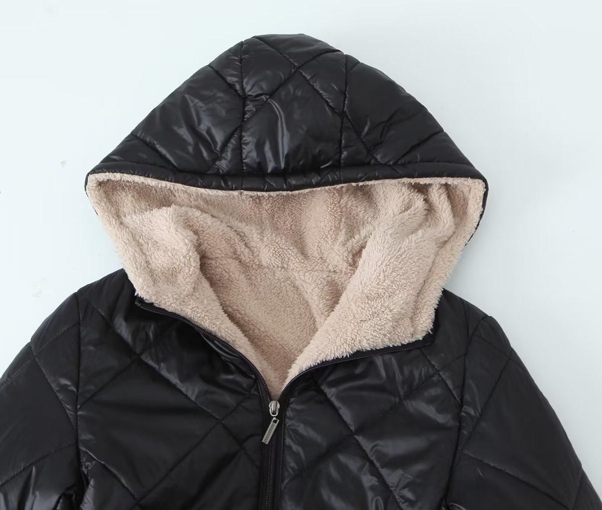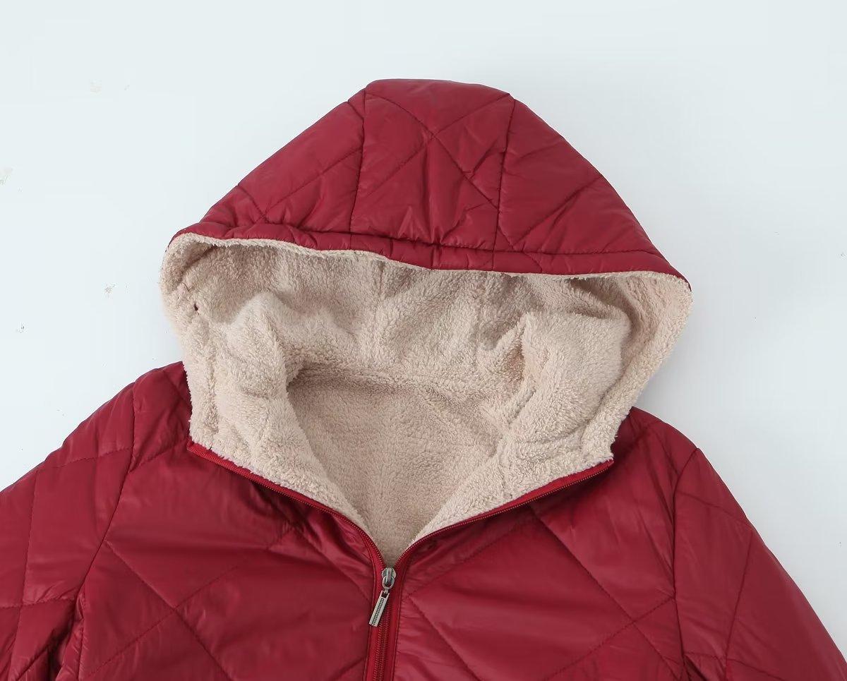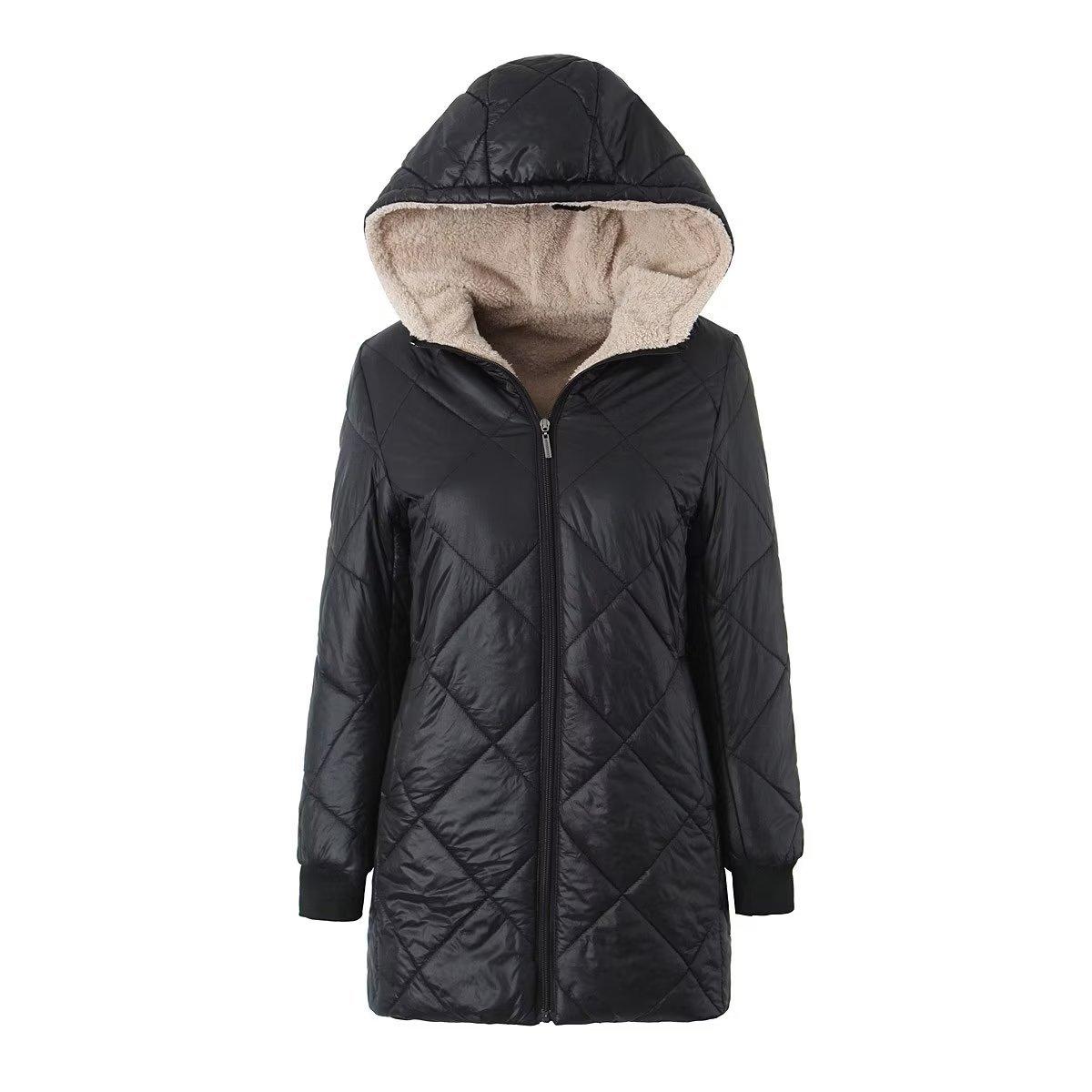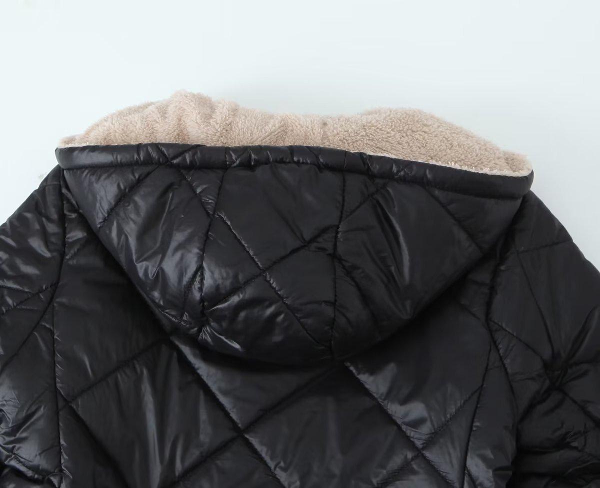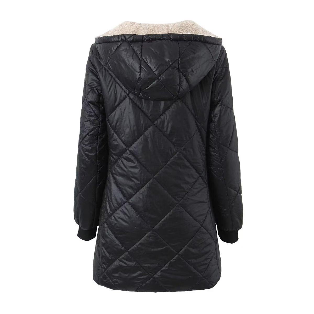 Ropa de Invierno Nueva, Abrigo de Algodón de Longitud Media con Capucha, Impermeable Brillante de Terciopelo de Cordero con Cuadros Geométricos para Mujer