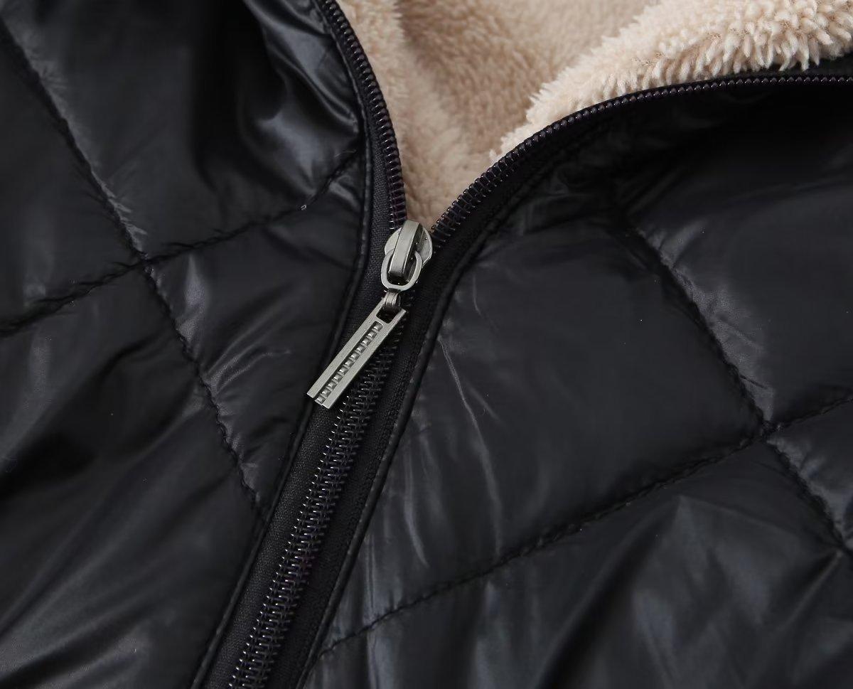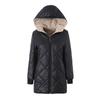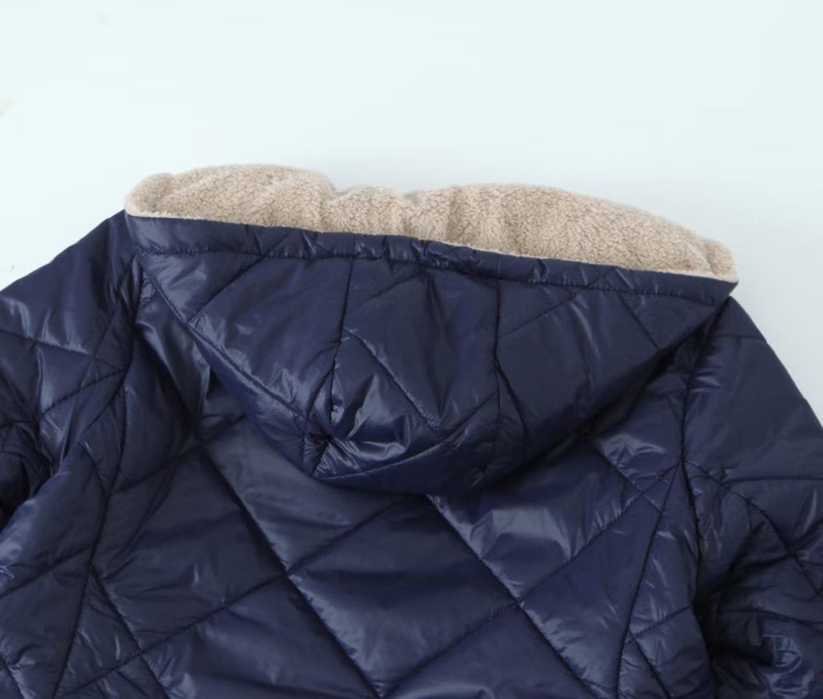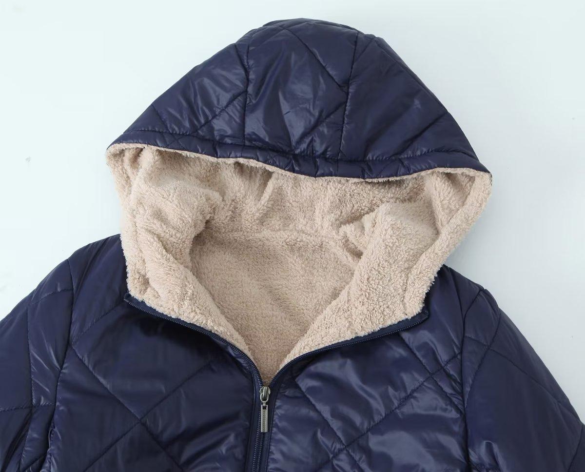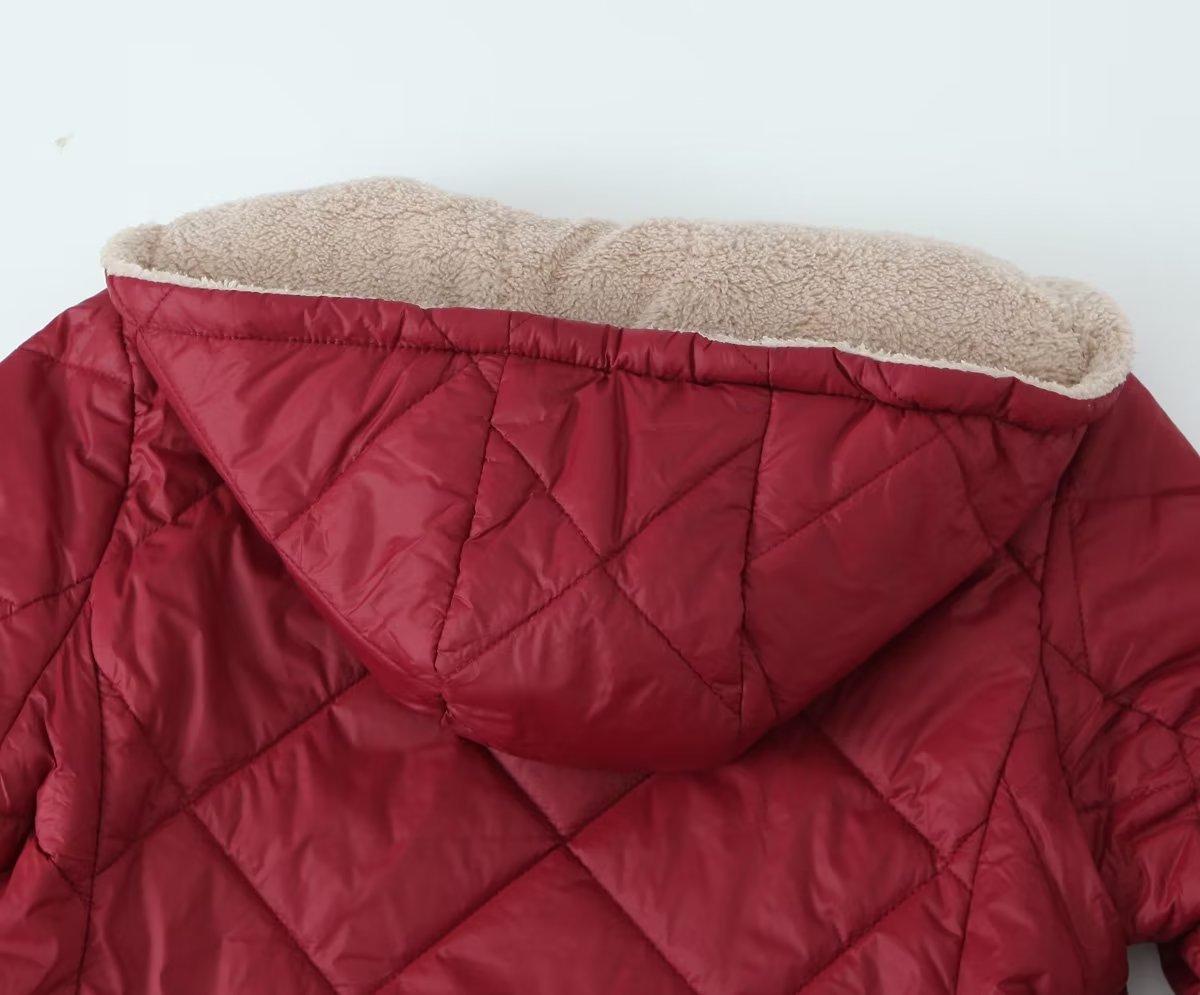 Ropa de Invierno Nueva, Abrigo de Algodón de Longitud Media con Capucha, Impermeable Brillante de Terciopelo de Cordero con Cuadros Geométricos para Mujer