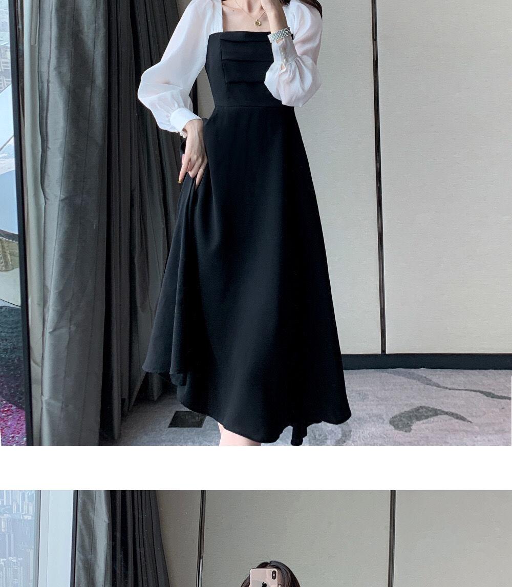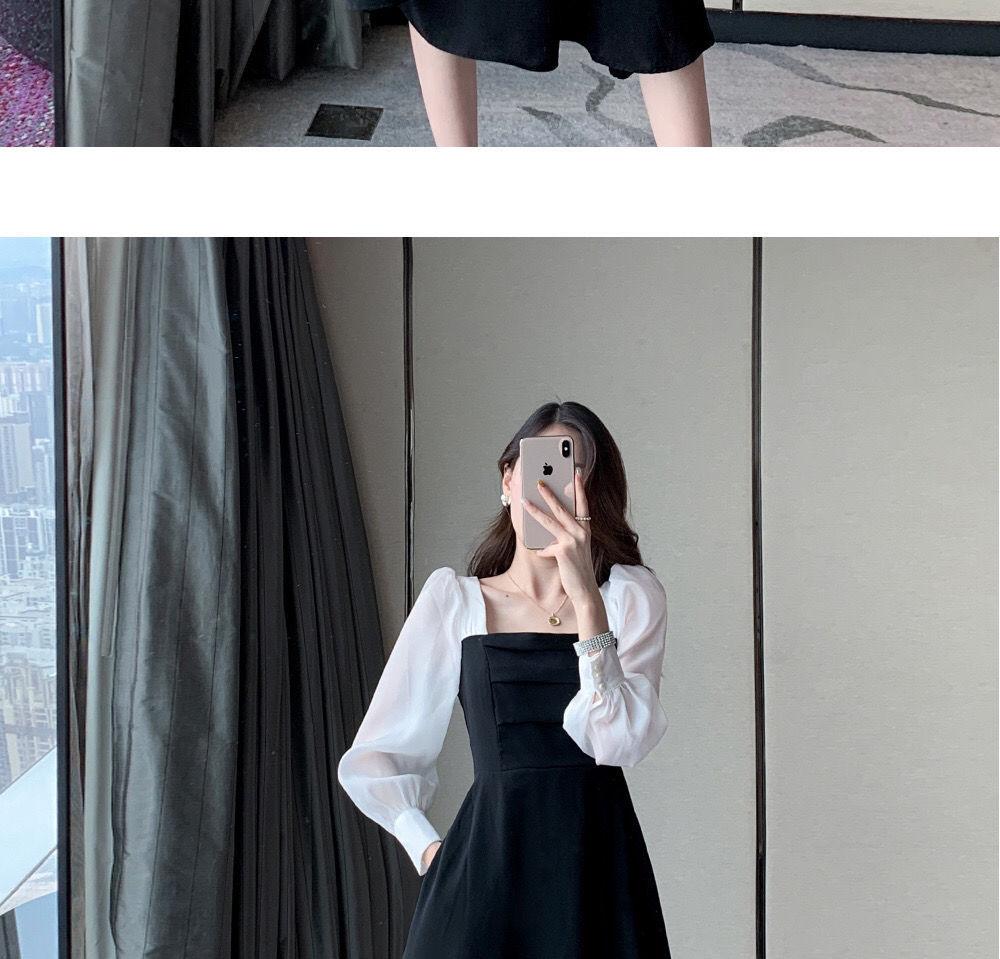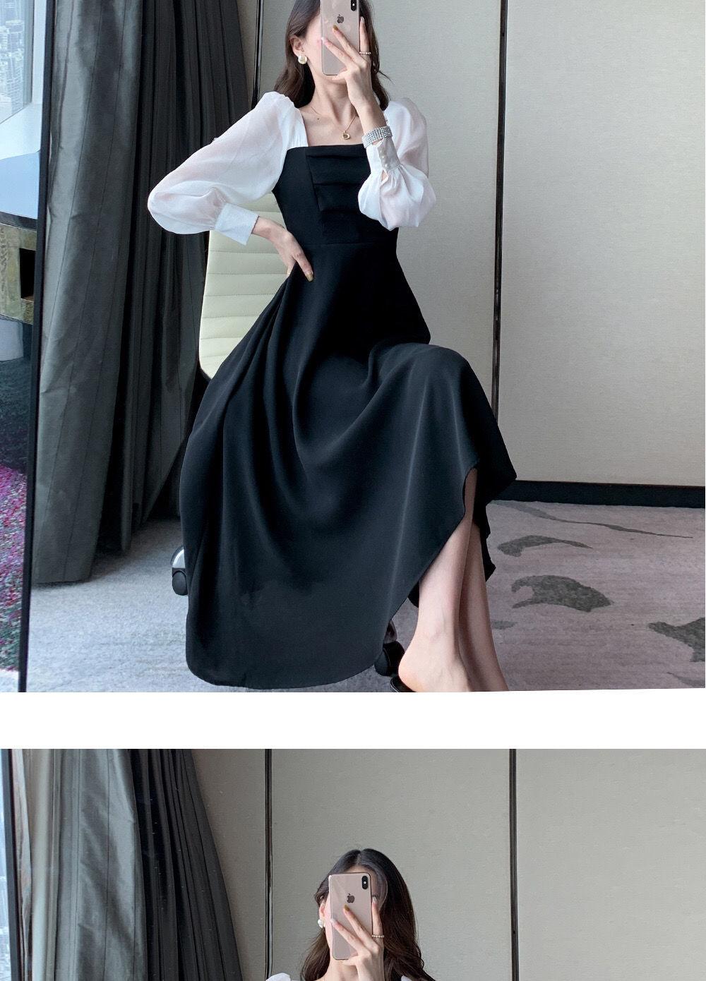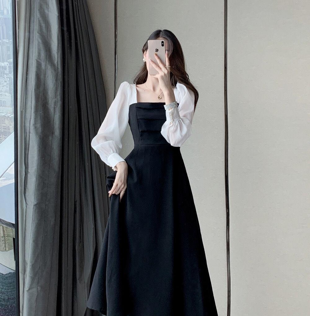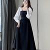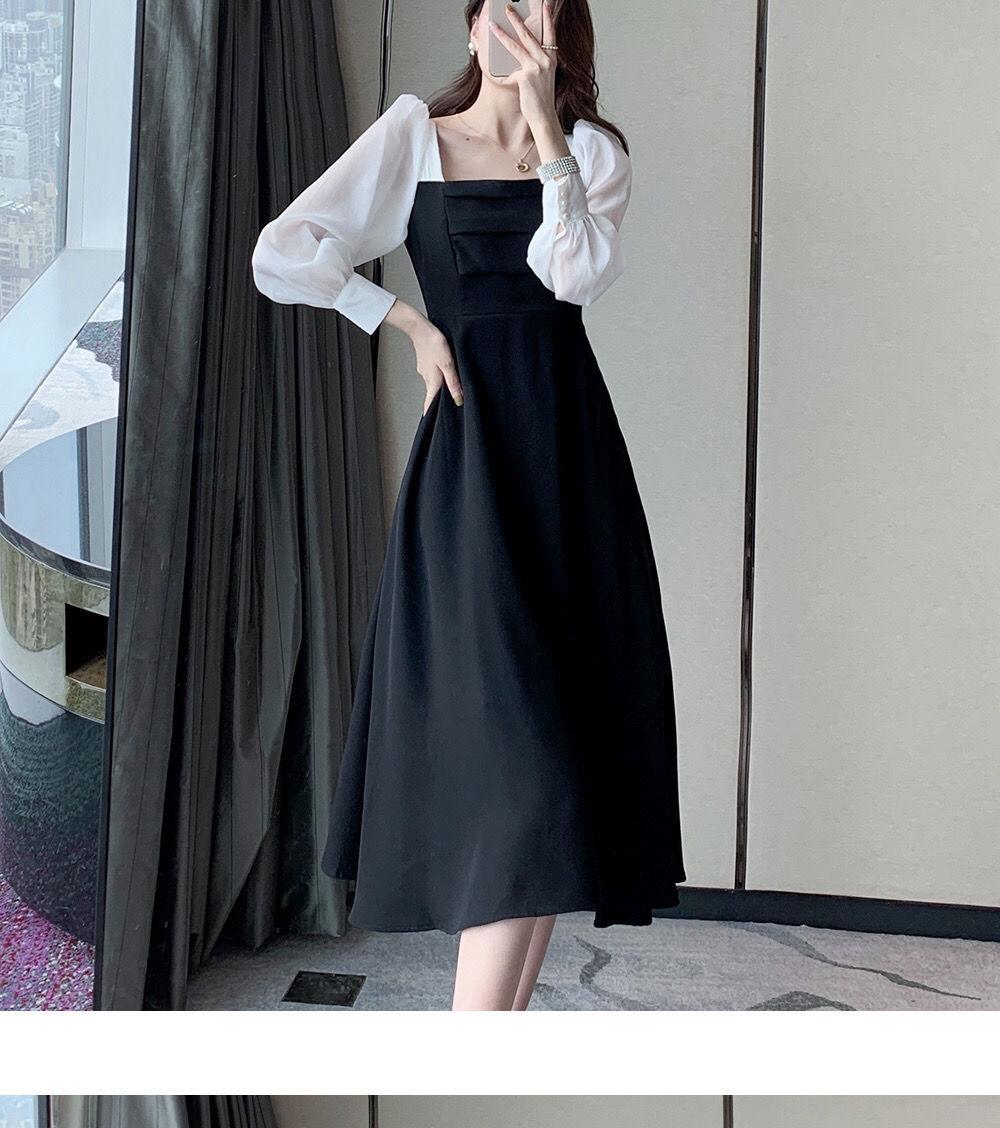 Vestido negro estilo Hepburn de manga larga y escote cuadrado estilo retro francés para mujer, talla grande, para otoño