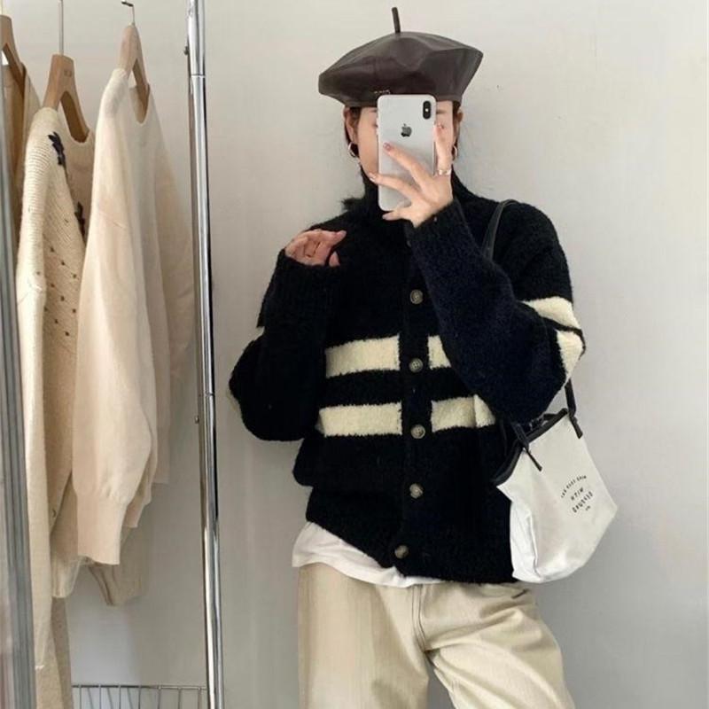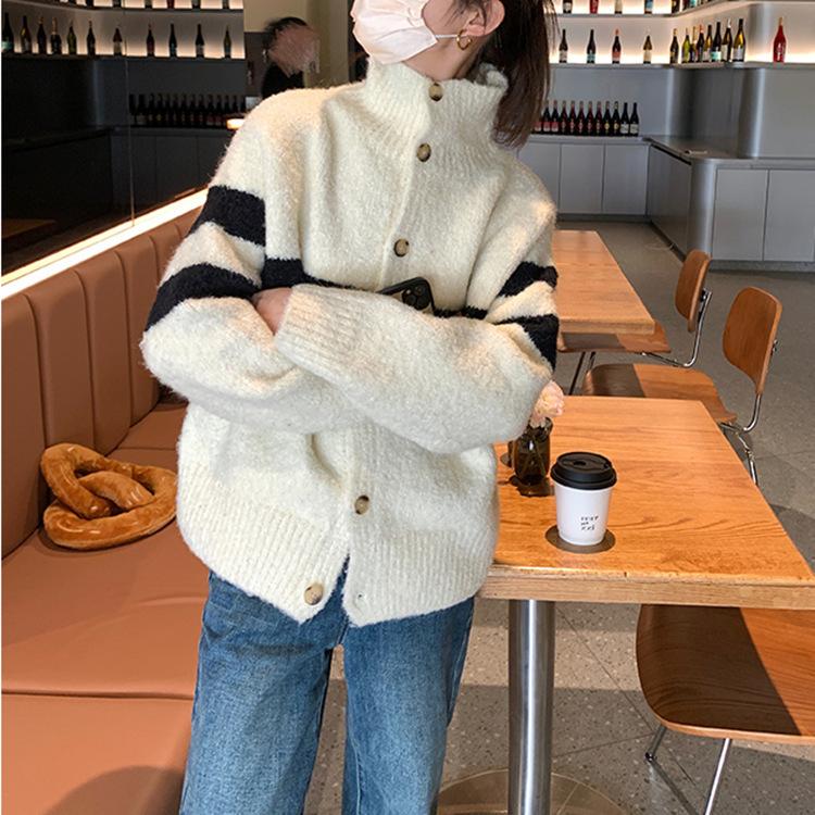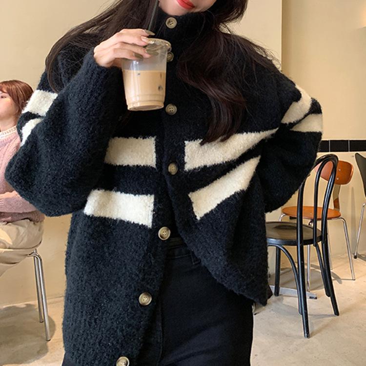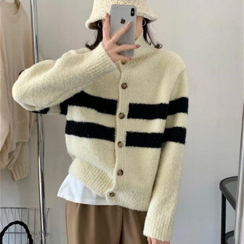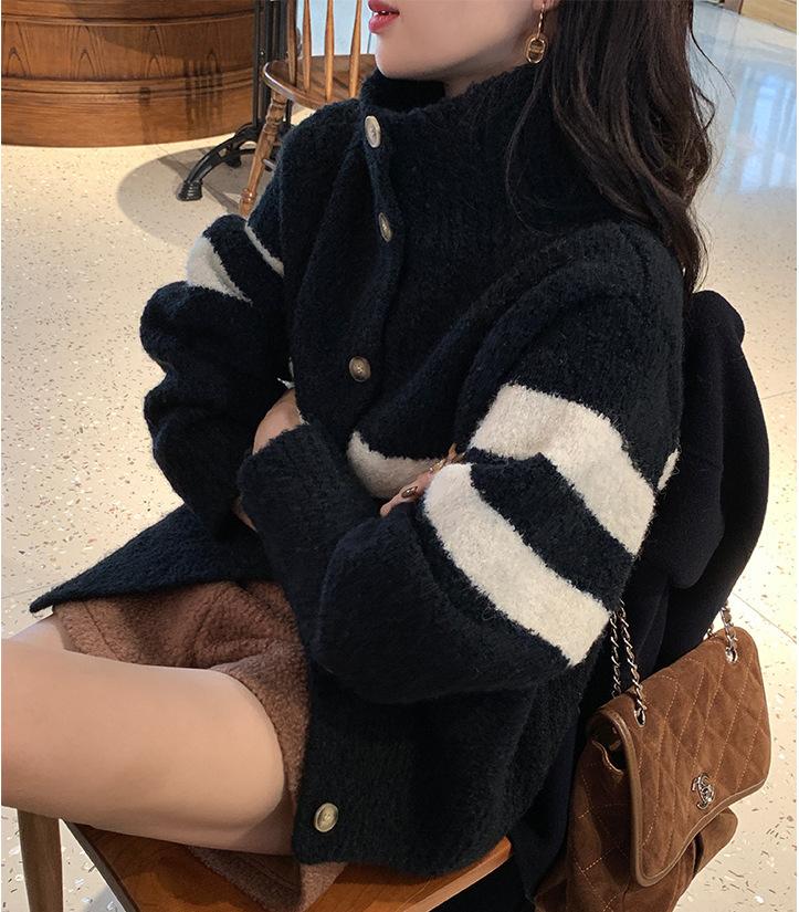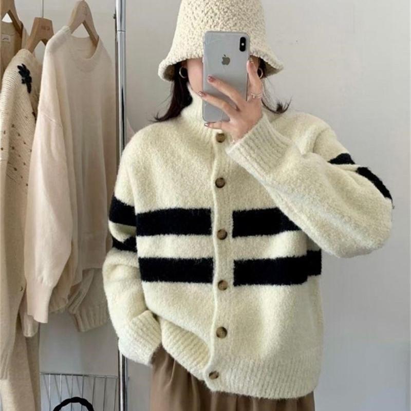 Suéter de cuello alto a rayas engrosado para otoño e invierno, nuevo, de moda para mujer, combina con todo, suelto, adelgazante, suave, de punto glutinoso.