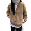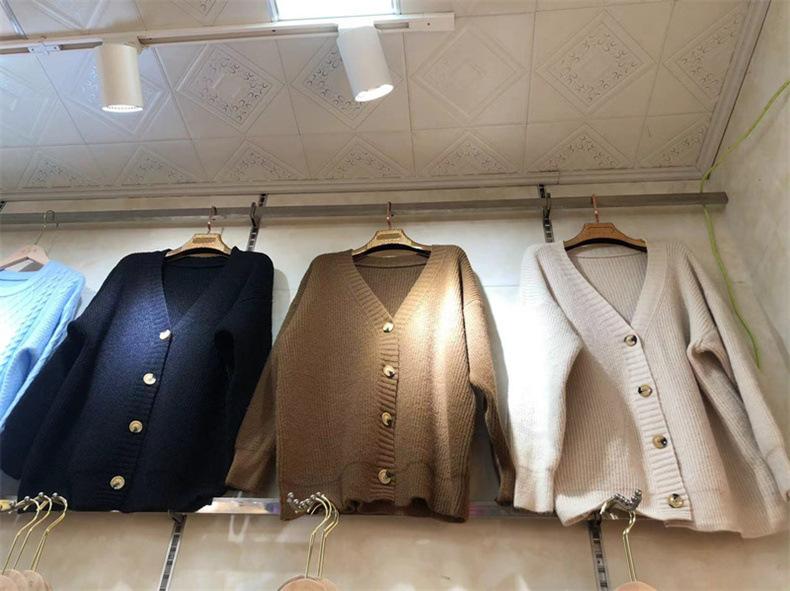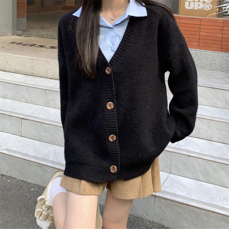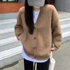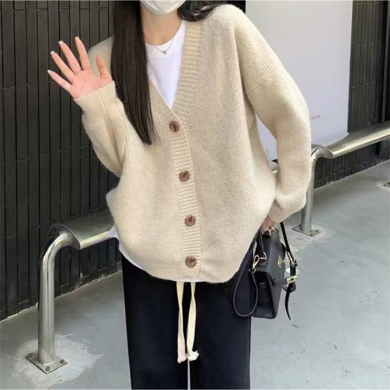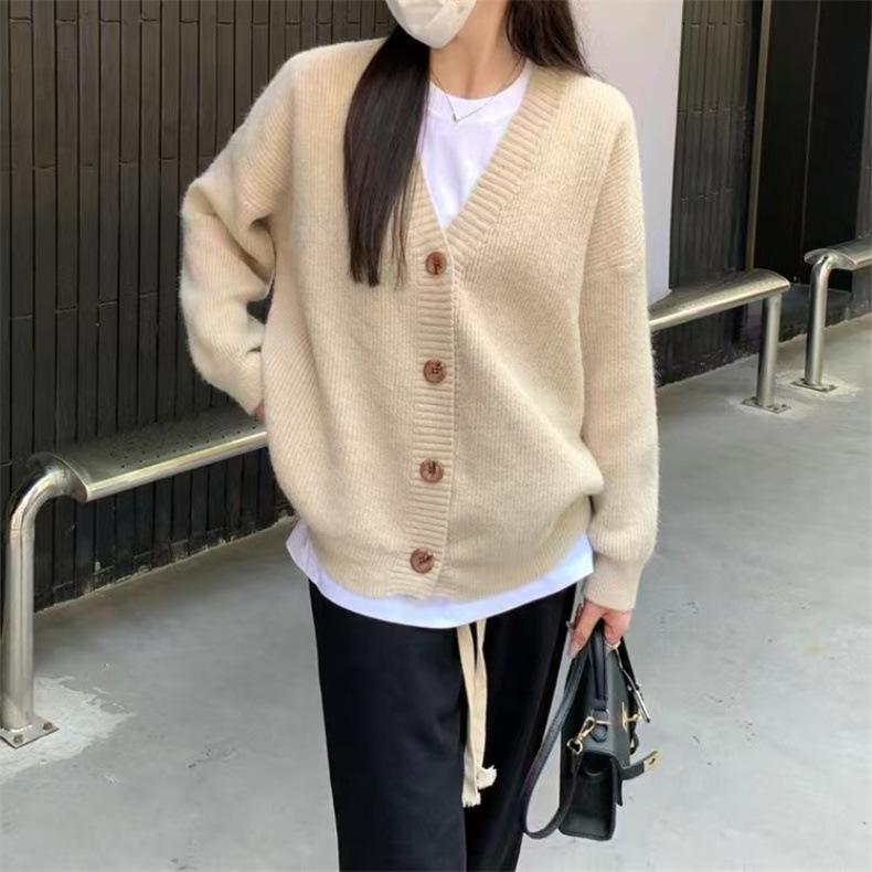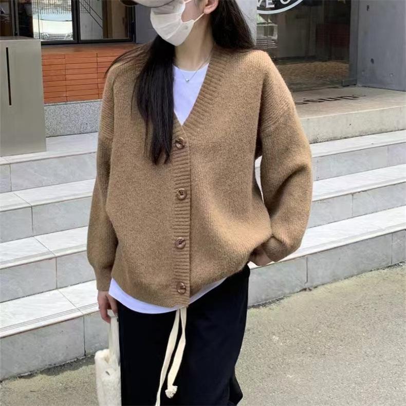 Suéter de talla grande de color liso con cuello en V estilo coreano para mujer, abrigo de otoño e invierno, nuevo cárdigan de punto holgado y suave de estilo perezoso para mujer