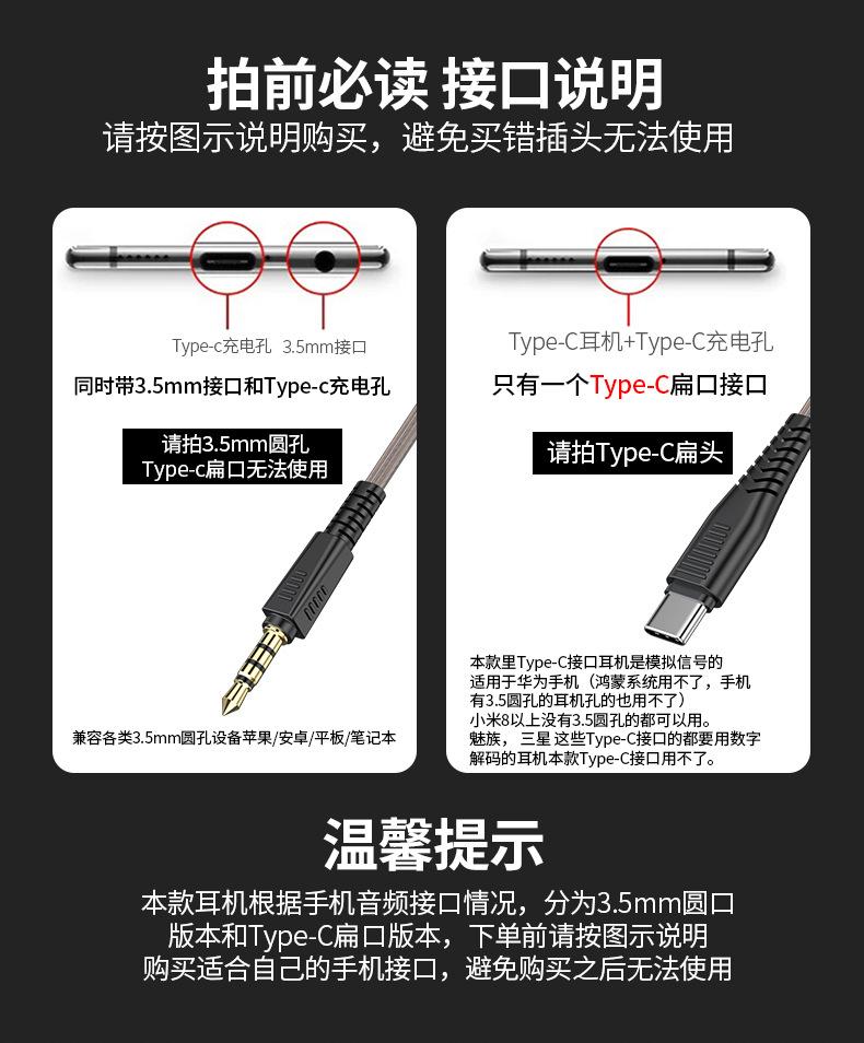 Consejos: Los audífonos con interfaz Tipo-C en este modelo son señales analógicas, adecuados para teléfonos Huawei (el sistema Hongmeng no se puede usar, y los teléfonos con conectores de audífonos de orificio redondo de 3.5 mm no se pueden usar), Xiaomi 8 y superiores sin orificios redondos de 3.5 pueden usarse, Meizu, Samsung y otras interfaces Tipo-C deben usar audífonos de decodificación digital, esta interfaz Tipo-C de este modelo no se puede usar. Los audífonos de orificio redondo de 3.5 mm son universales independientemente del modelo de teléfono.