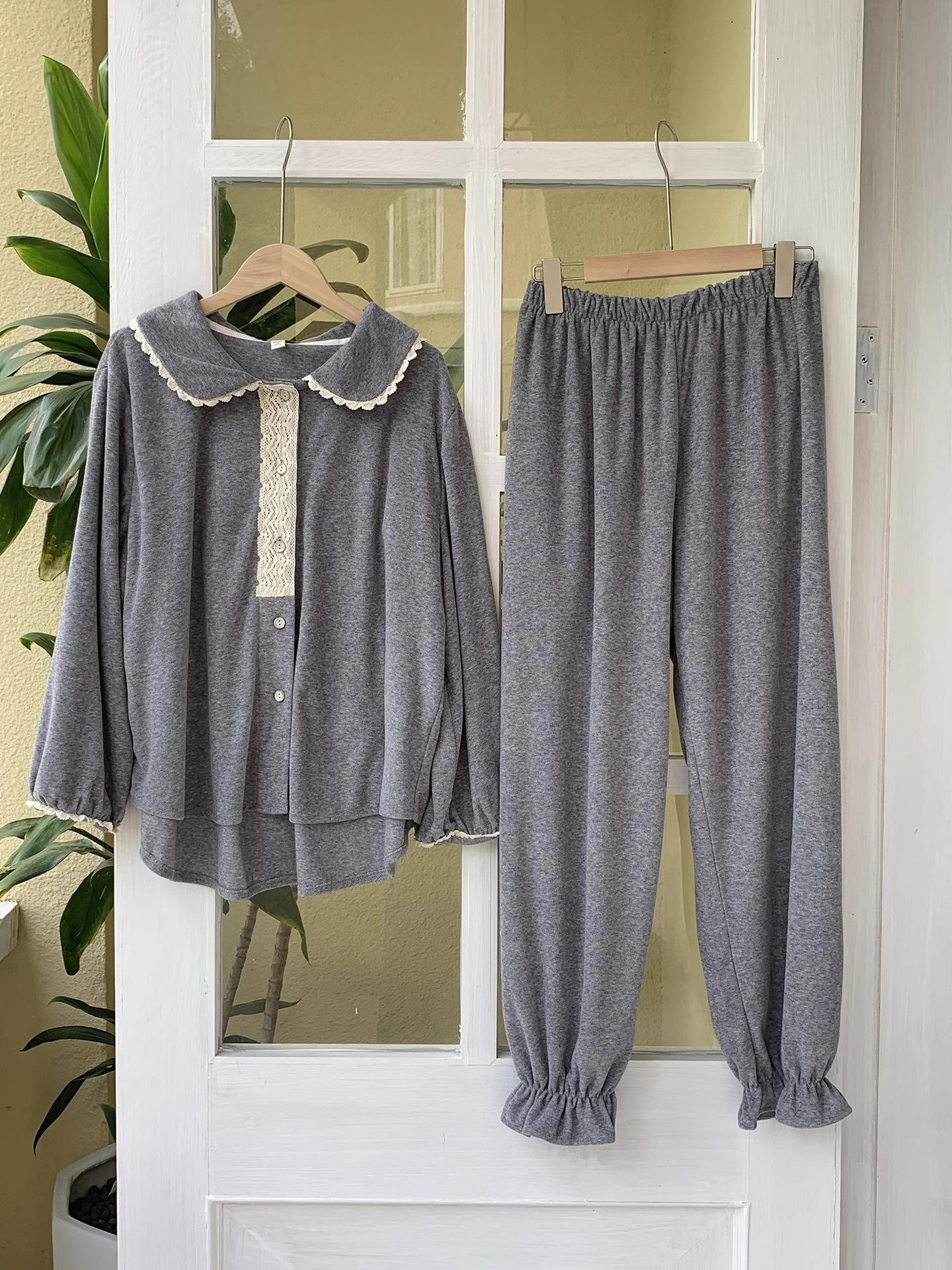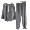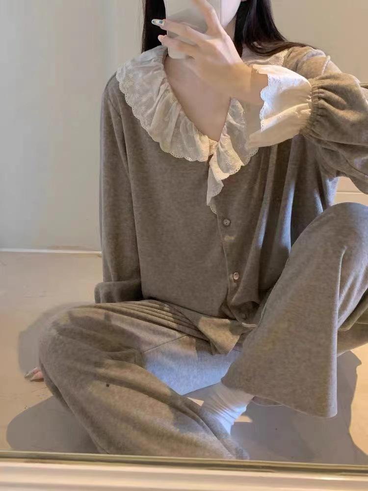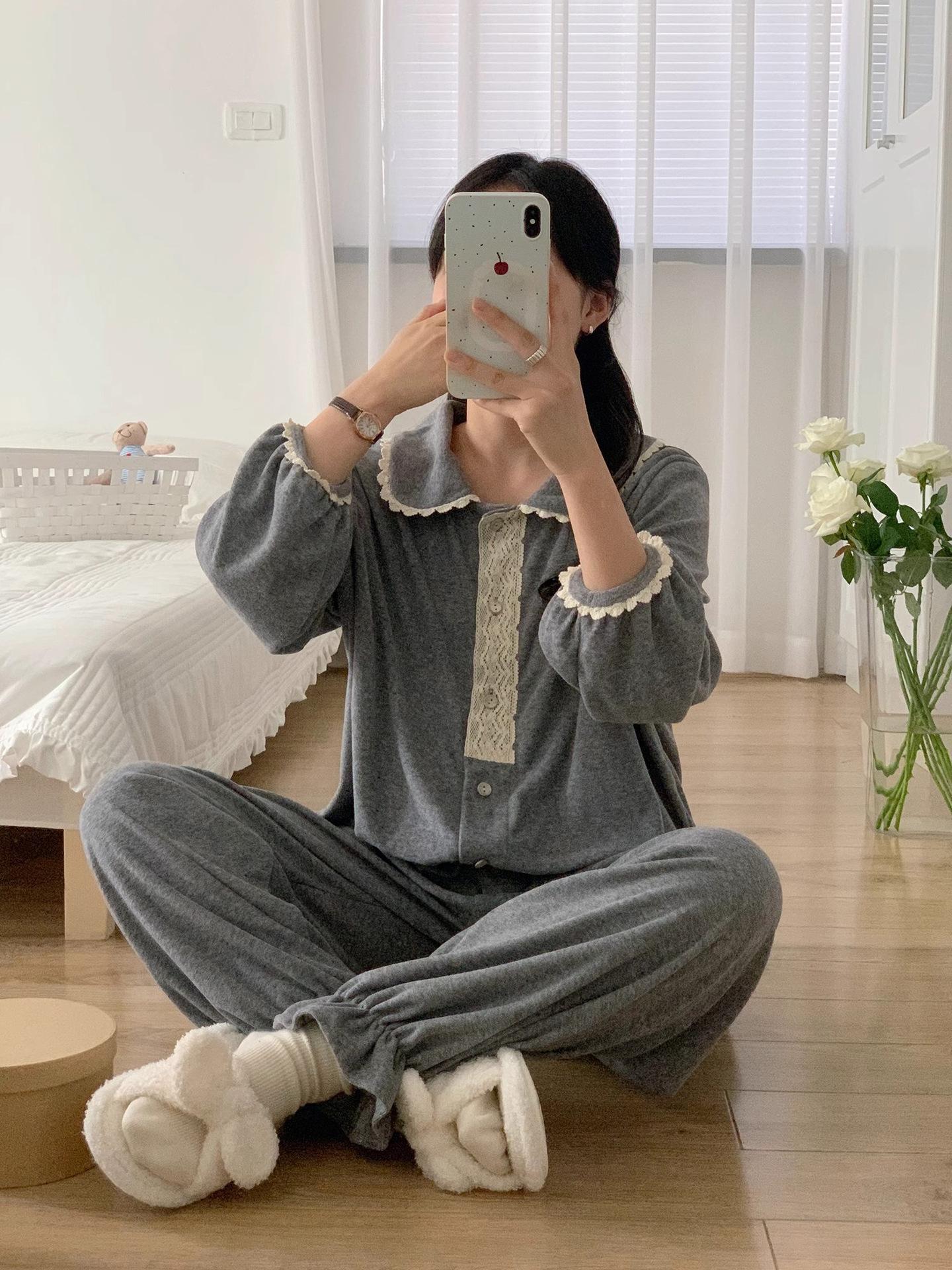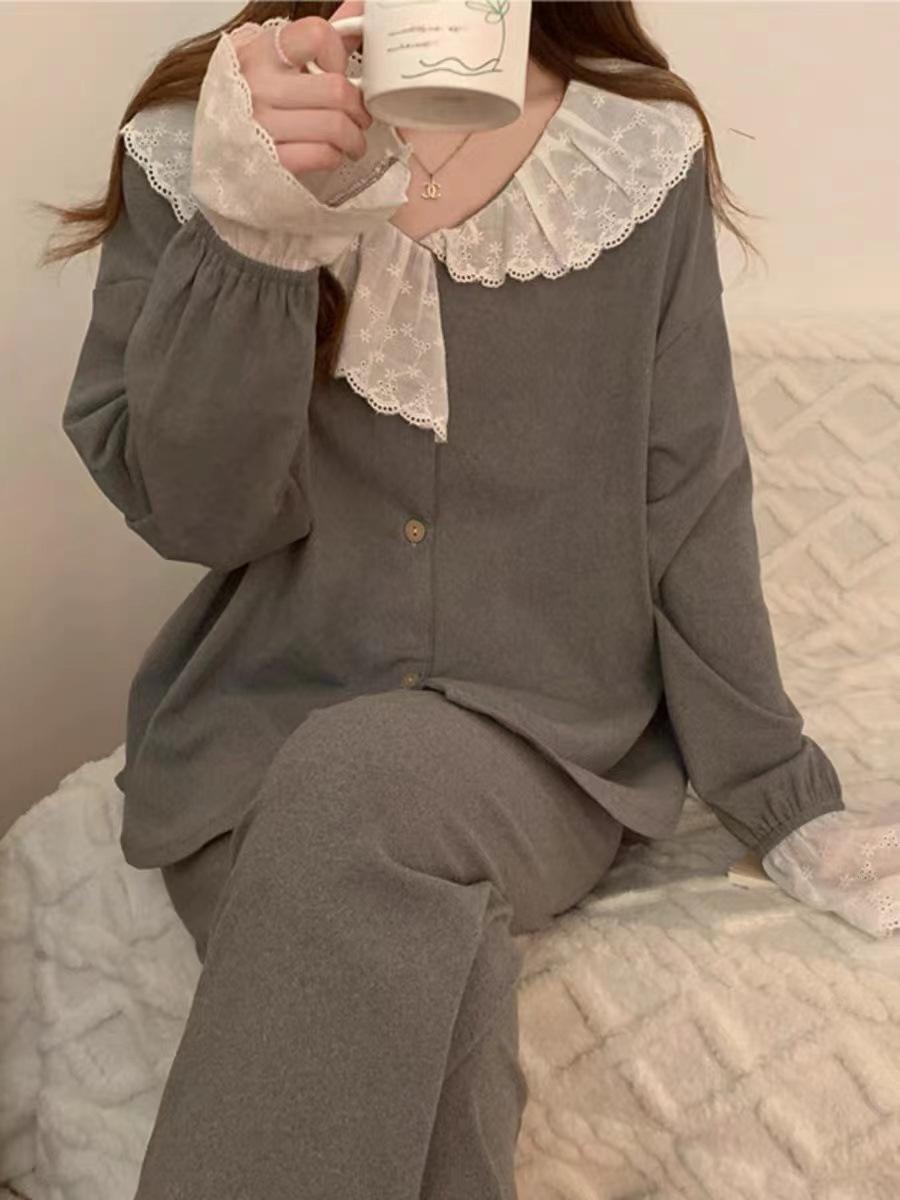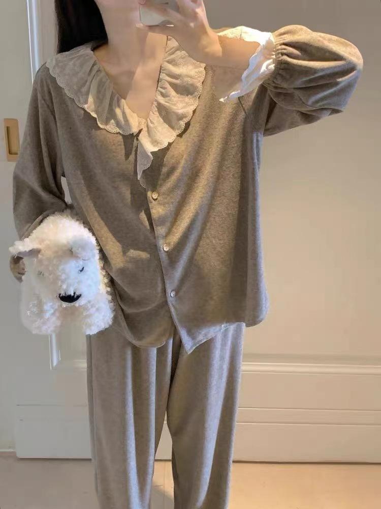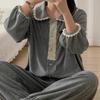 Pijama de estilo coreano para mujer, cuello de muñeca, borde de encaje, lindo para niña, manga larga, pantalones, cárdigan, algodón artificial engrosado, traje para estar en casa