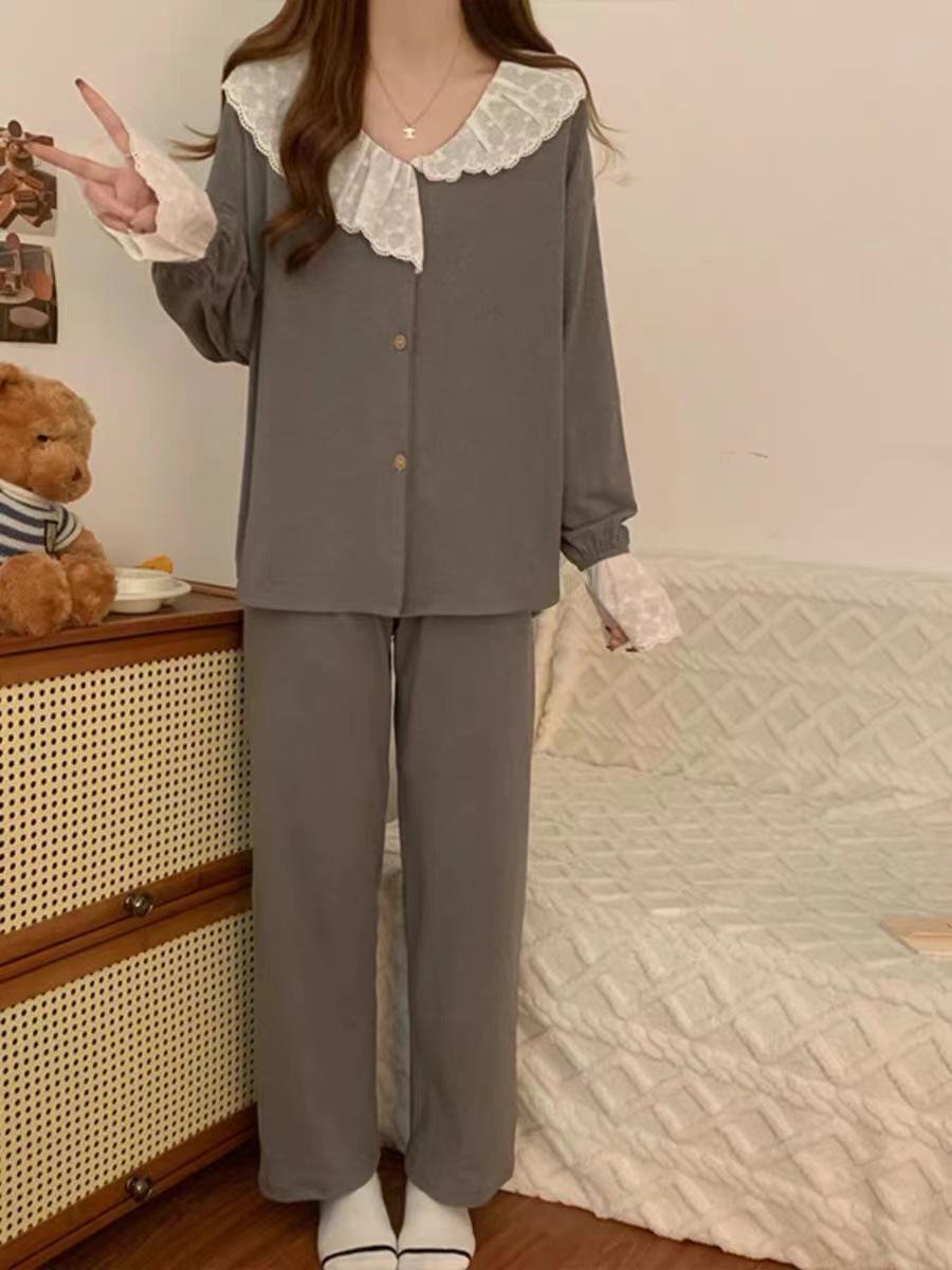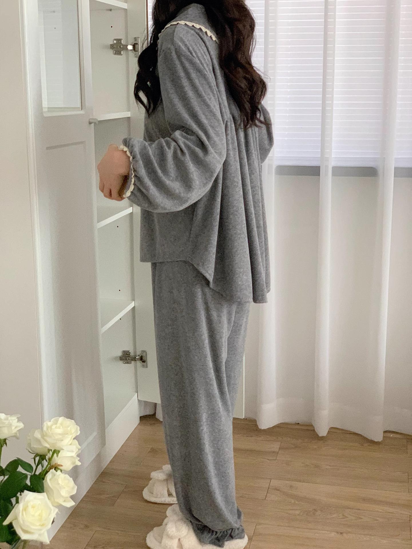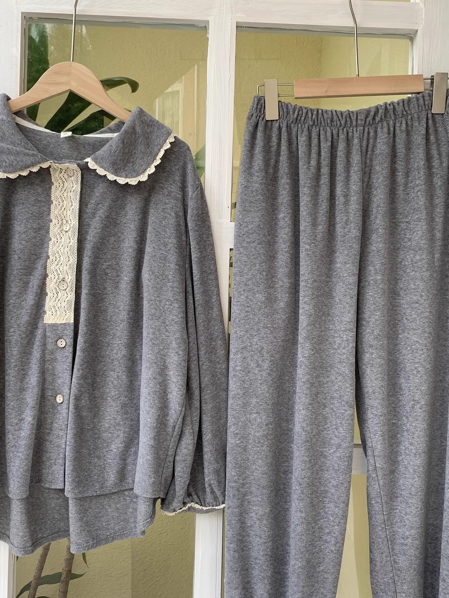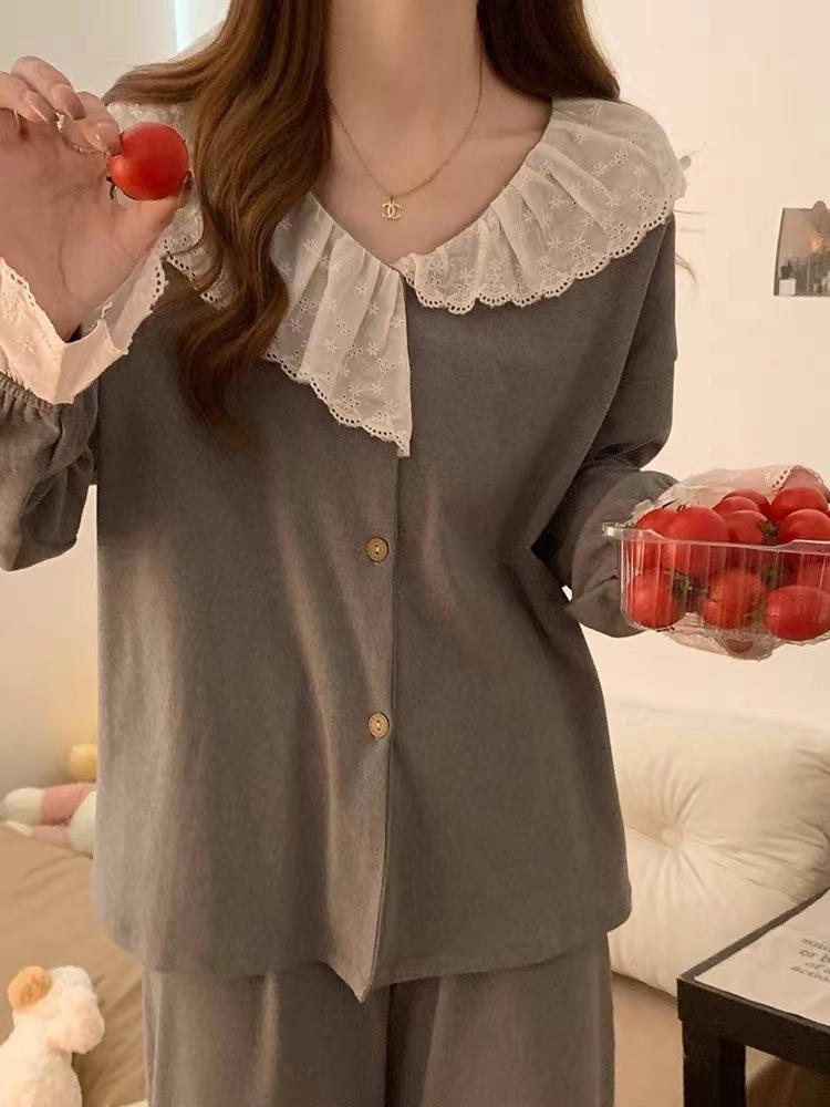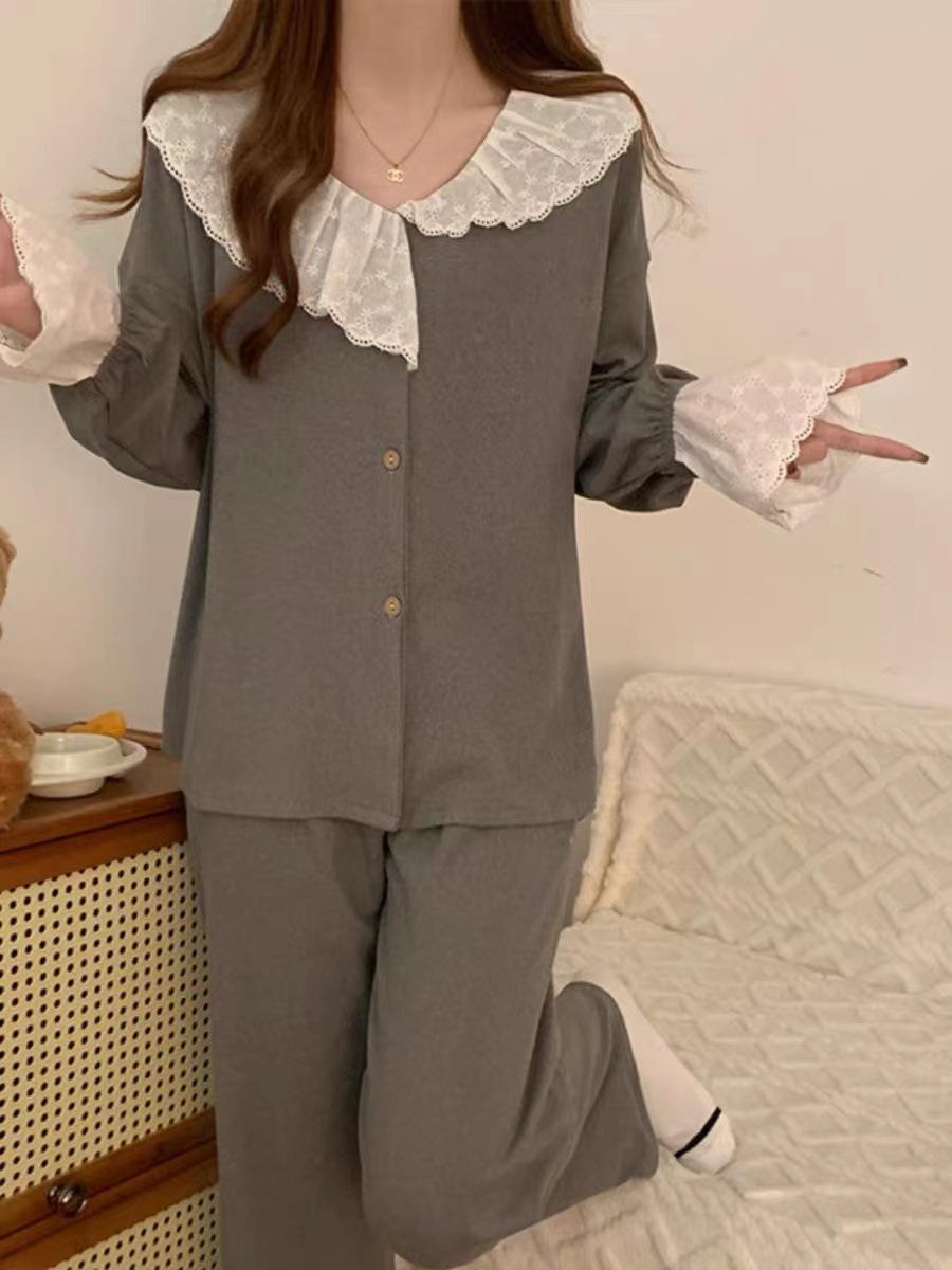 Pijama de estilo coreano para mujer, cuello de muñeca, borde de encaje, lindo para niña, manga larga, pantalones, cárdigan, algodón artificial engrosado, traje para estar en casa