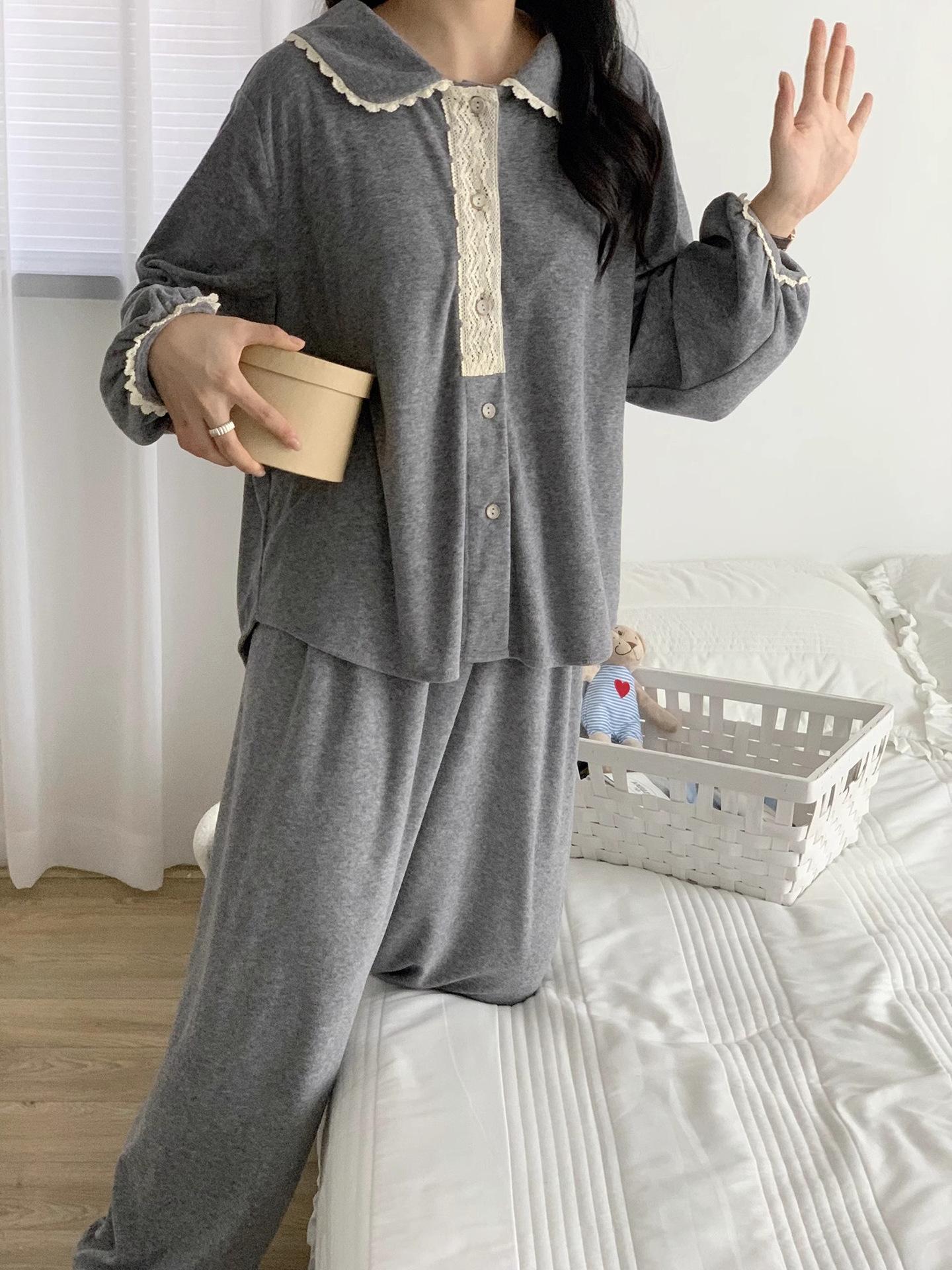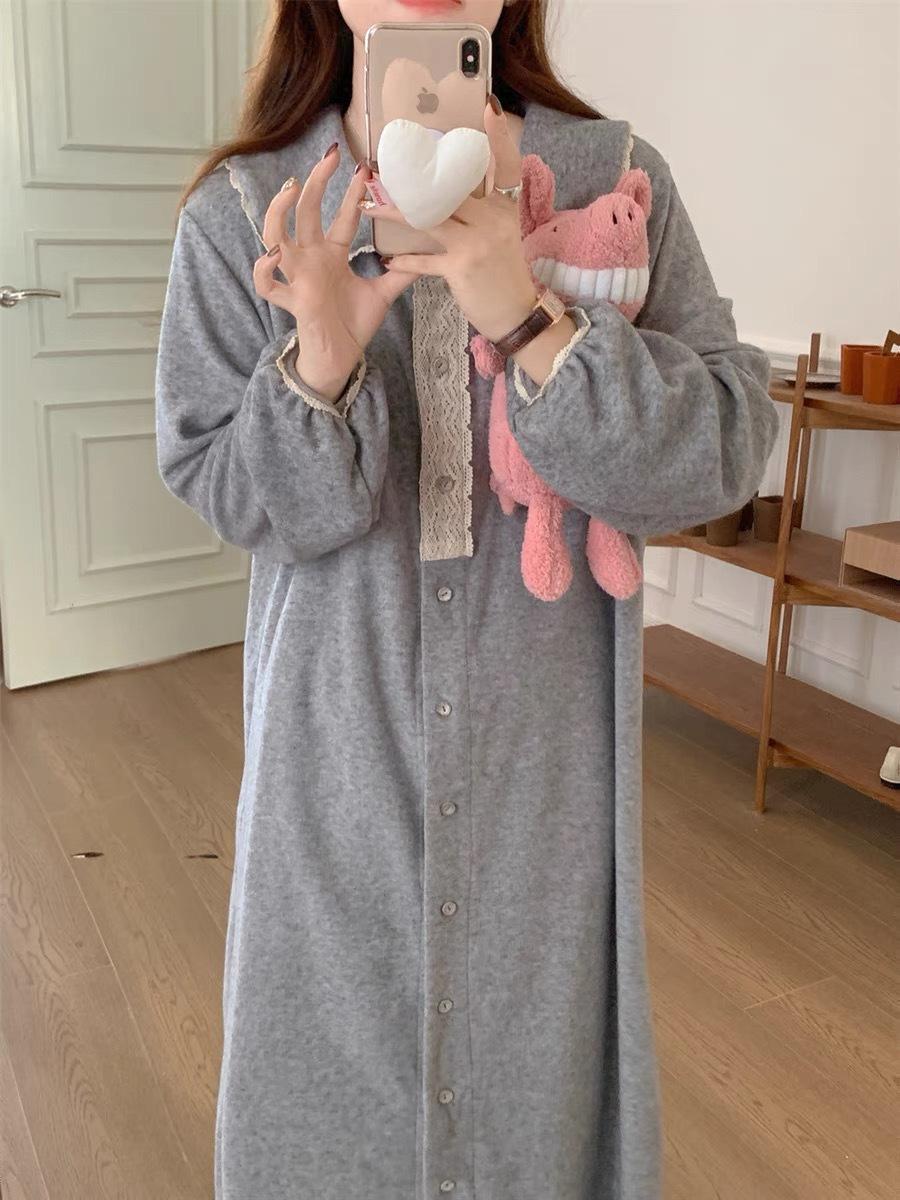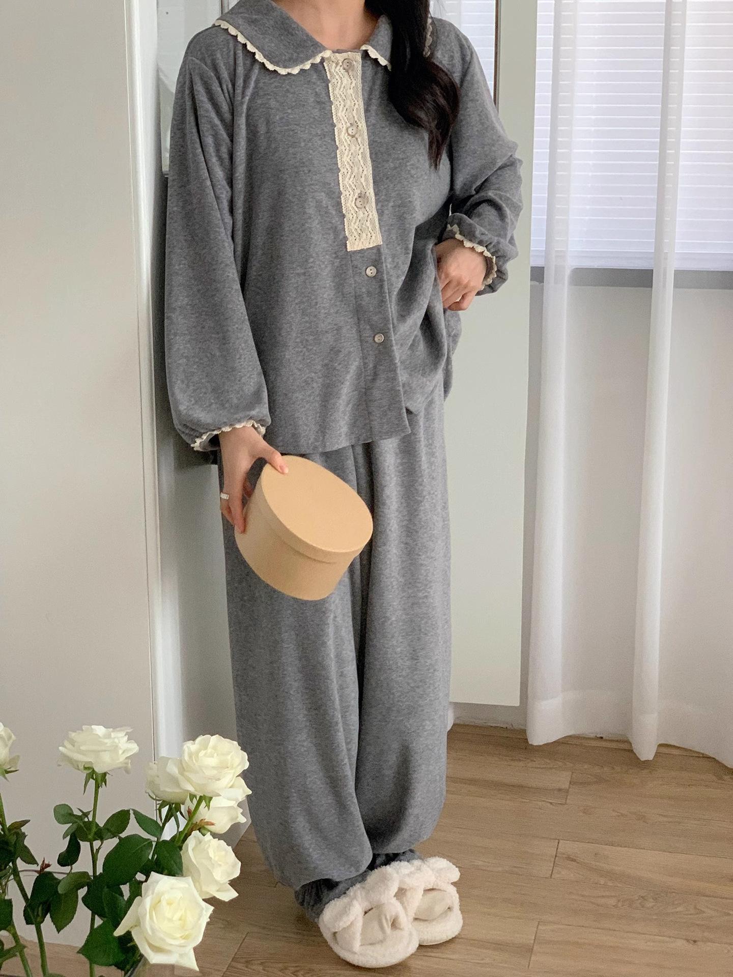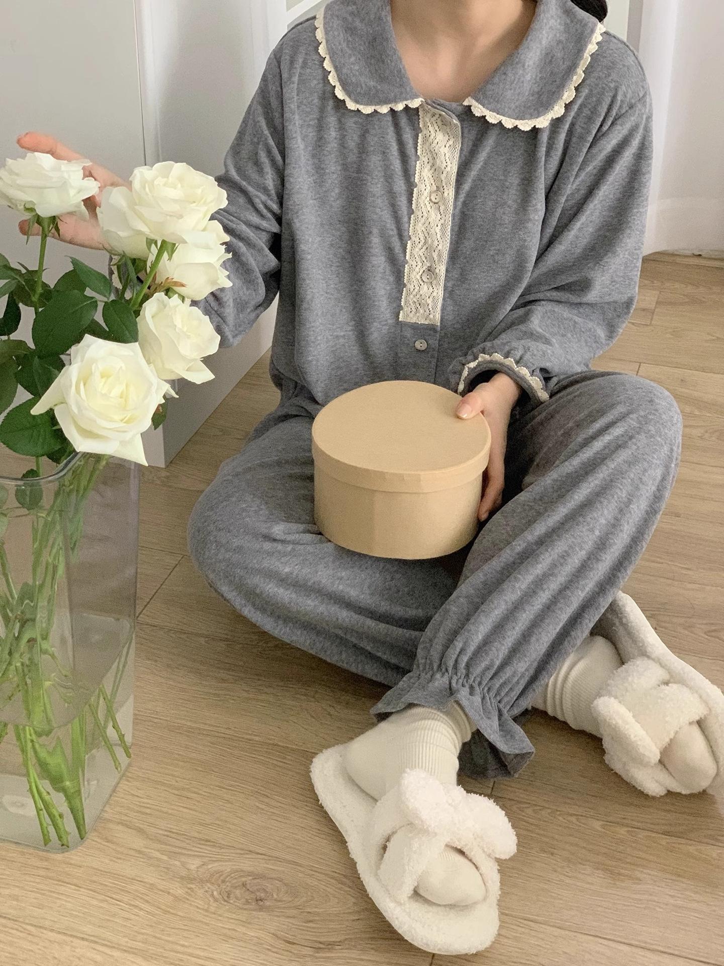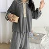 Pijama de estilo coreano para mujer, cuello de muñeca, borde de encaje, lindo para niña, manga larga, pantalones, cárdigan, algodón artificial engrosado, traje para estar en casa