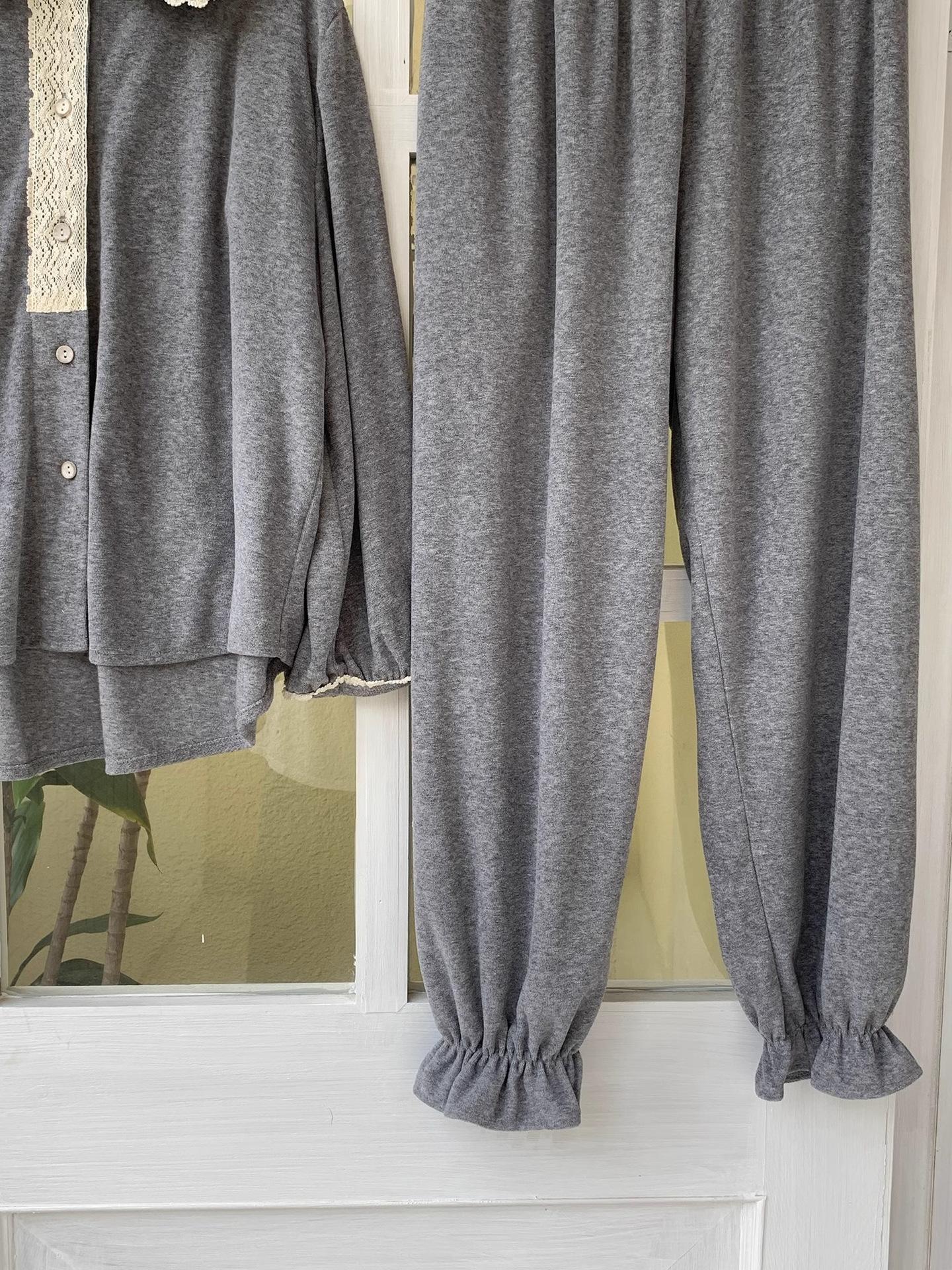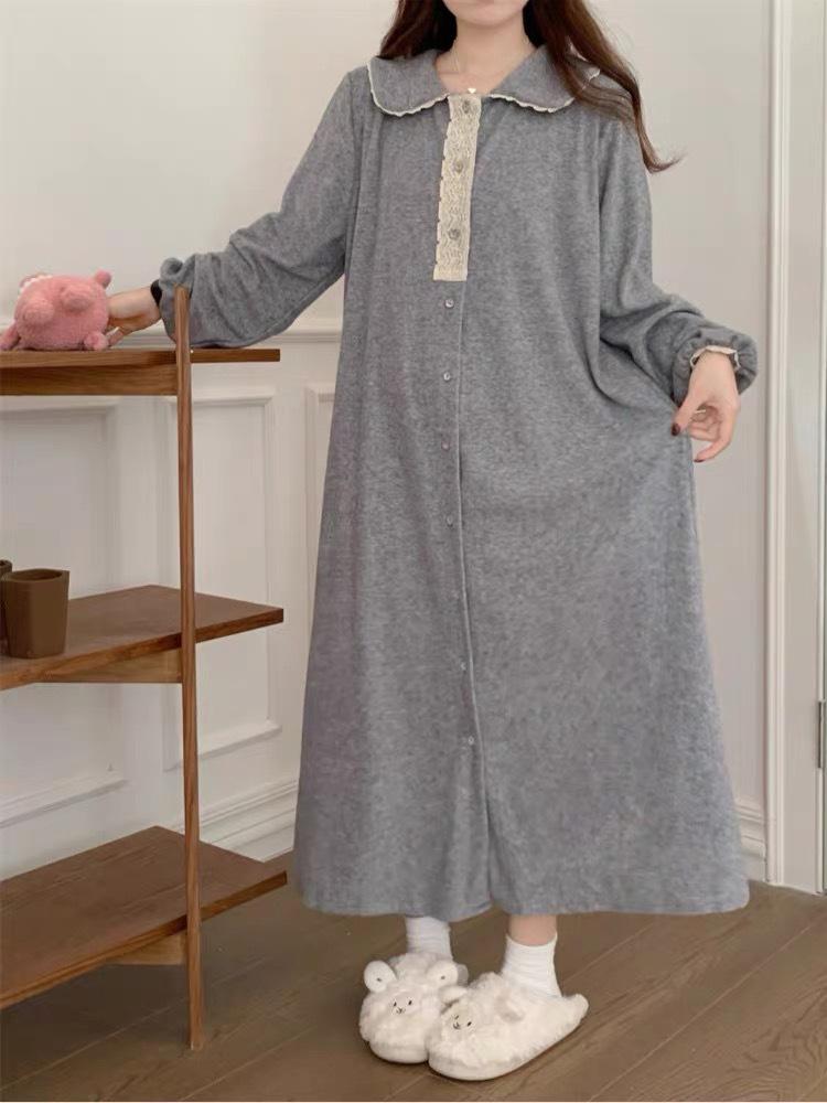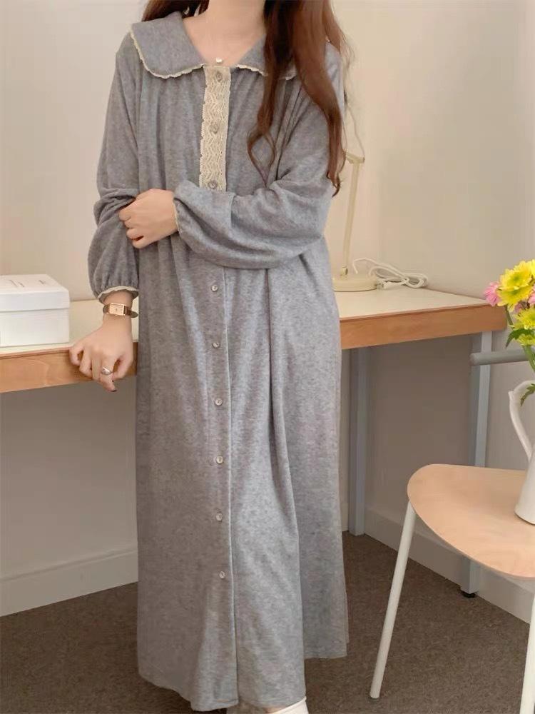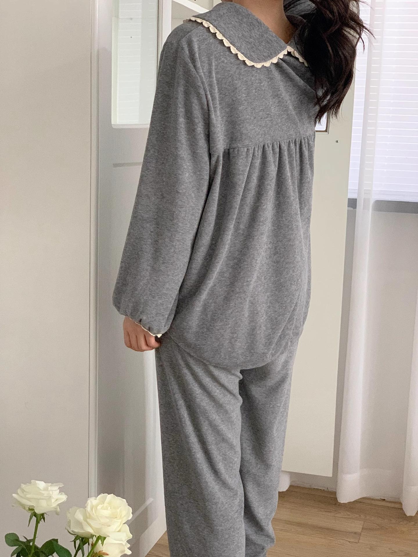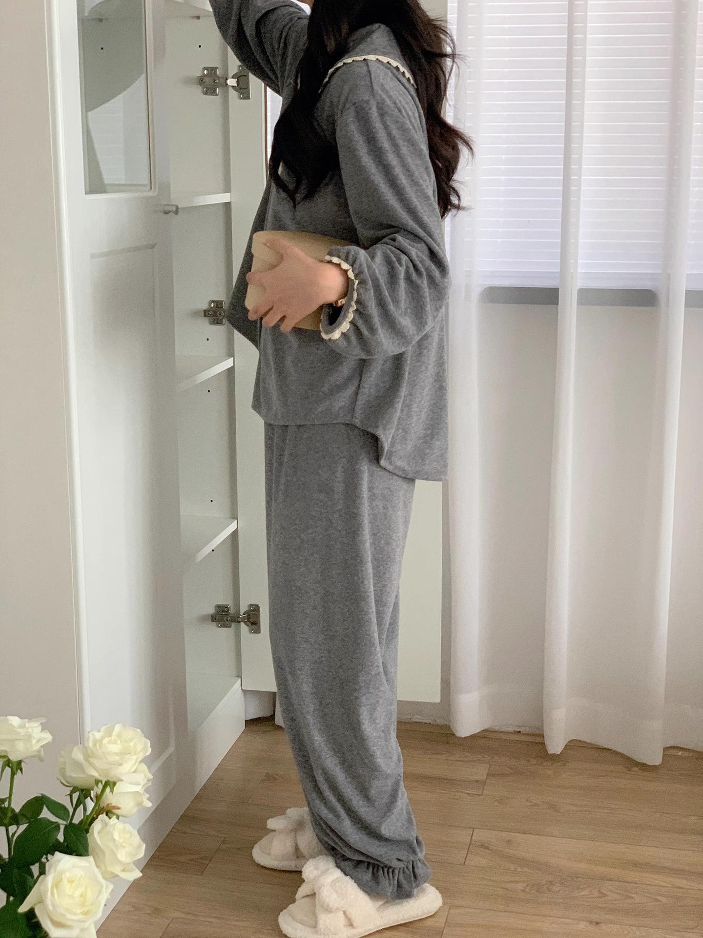 Pijama de estilo coreano para mujer, cuello de muñeca, borde de encaje, lindo para niña, manga larga, pantalones, cárdigan, algodón artificial engrosado, traje para estar en casa