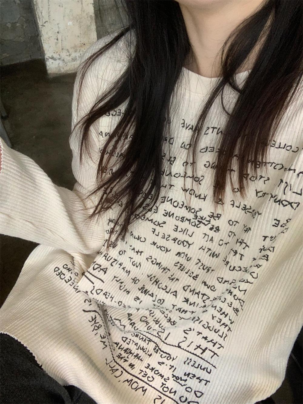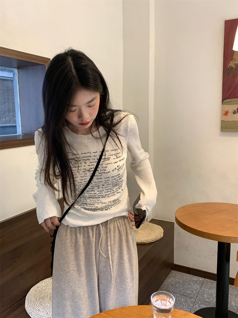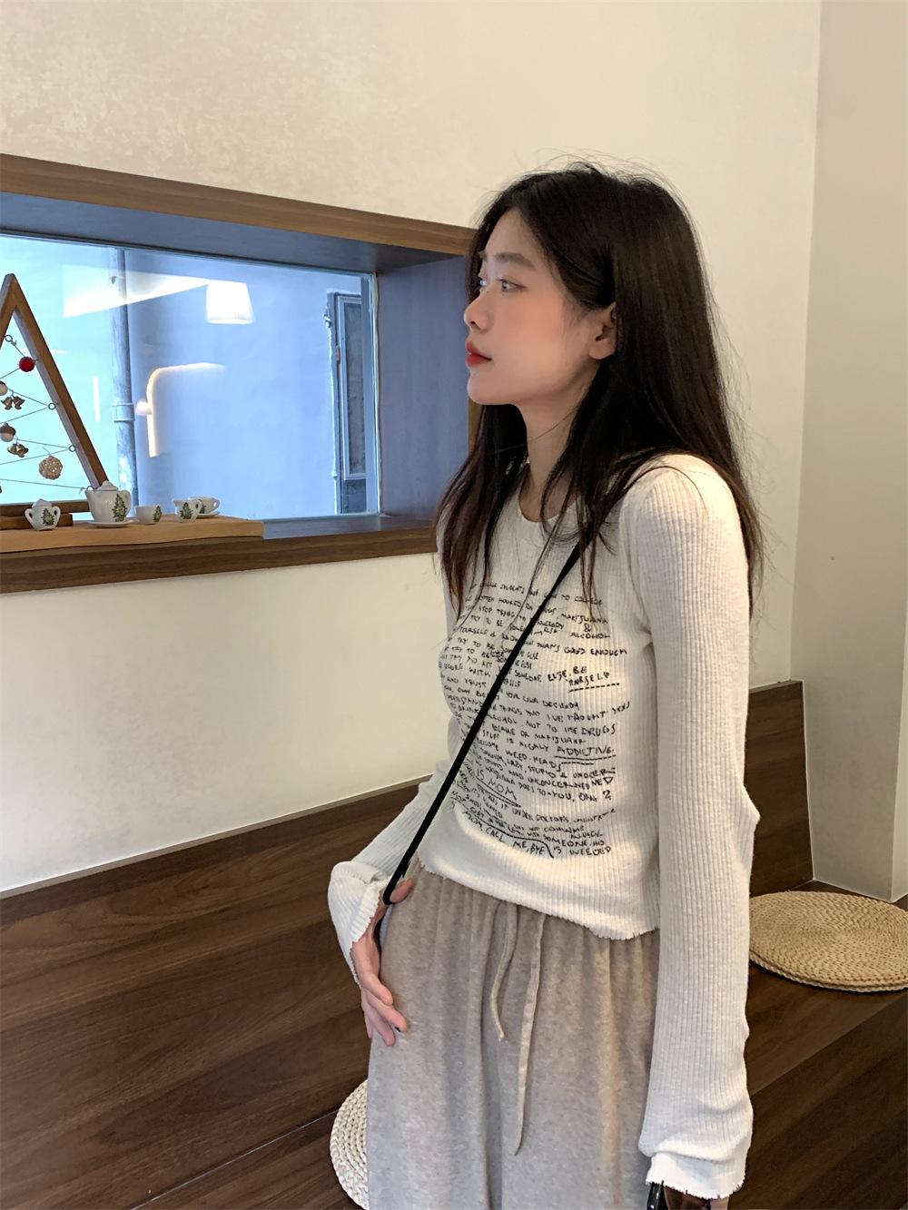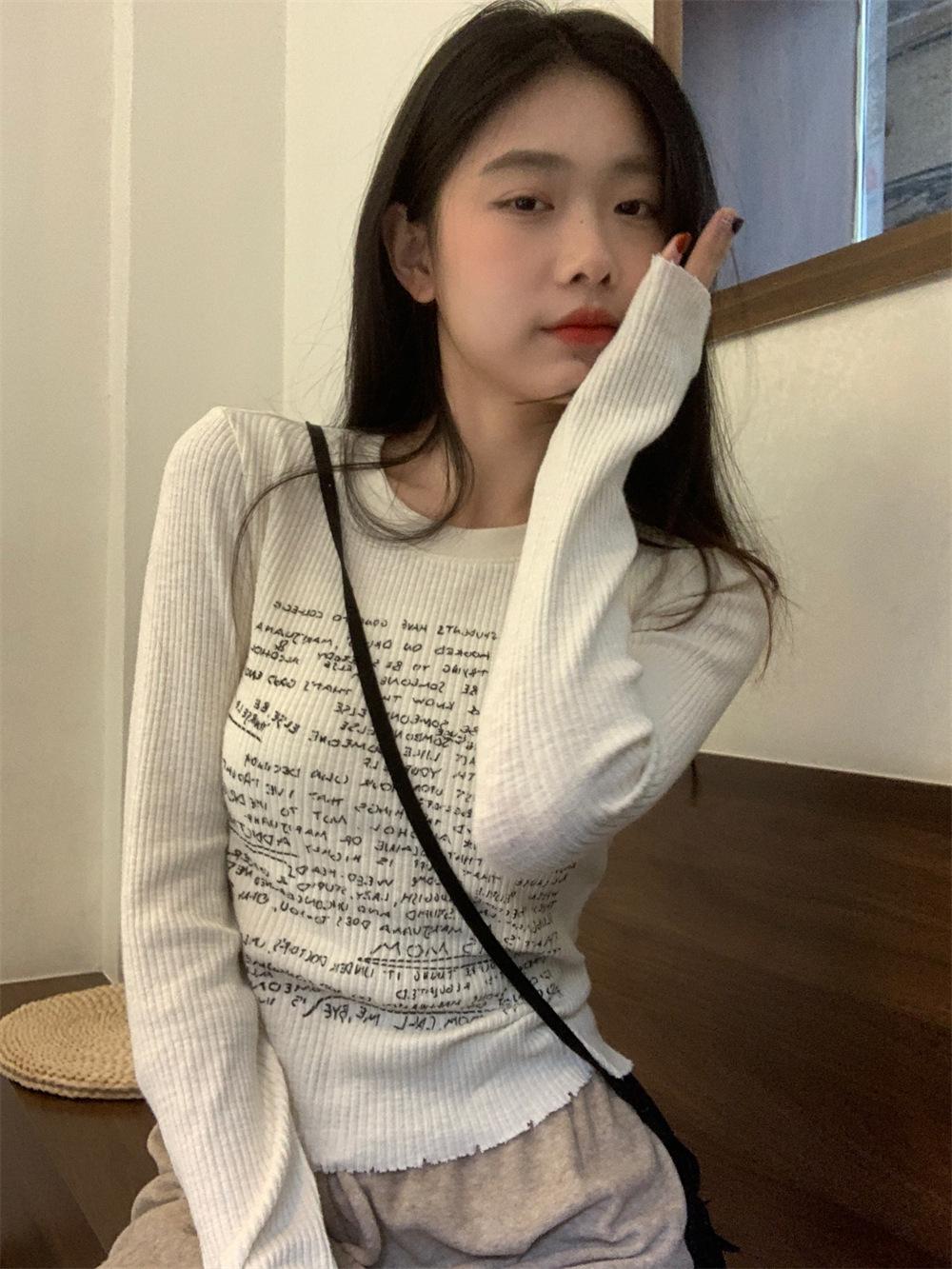 Camiseta de estilo dulce y picante de manga larga con hombros descubiertos y estampado de letras para mujer, top básico corto blanco ajustado adelgazante de nicho para primavera y otoño