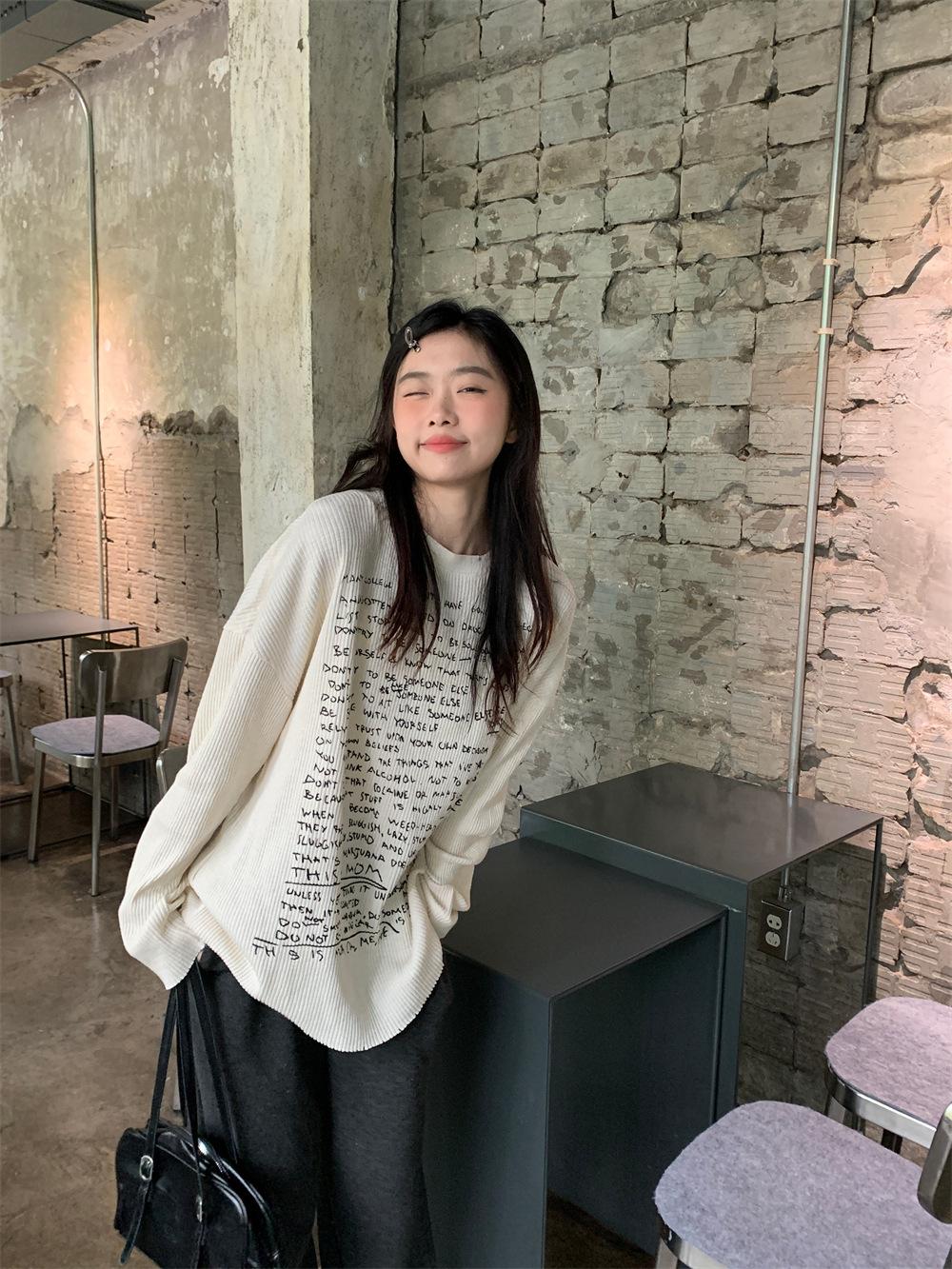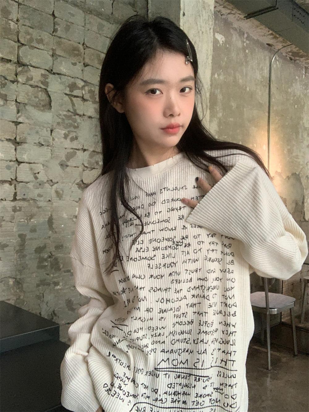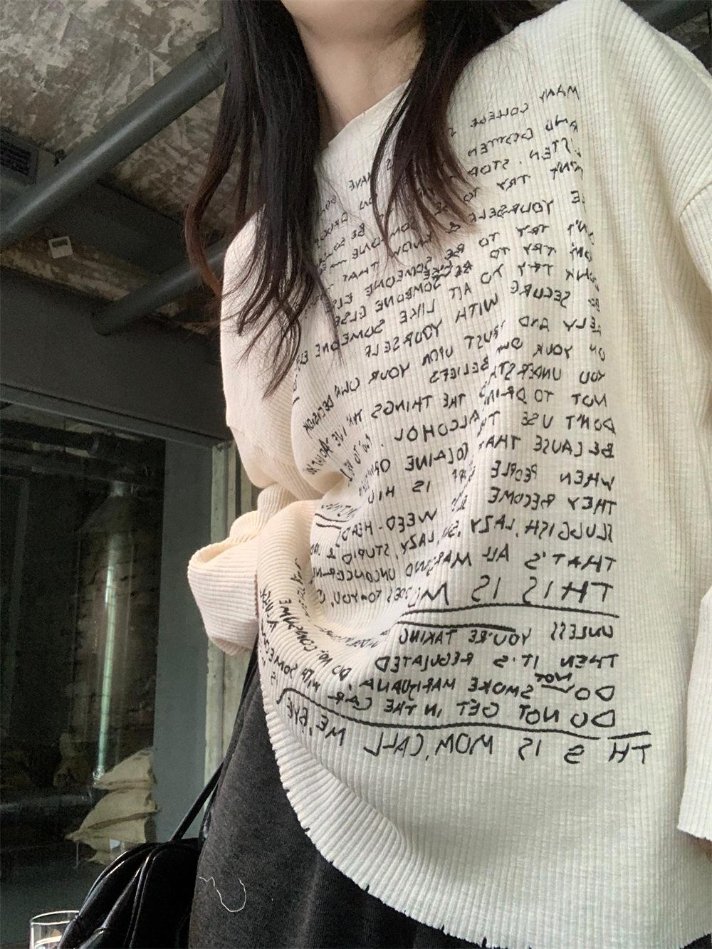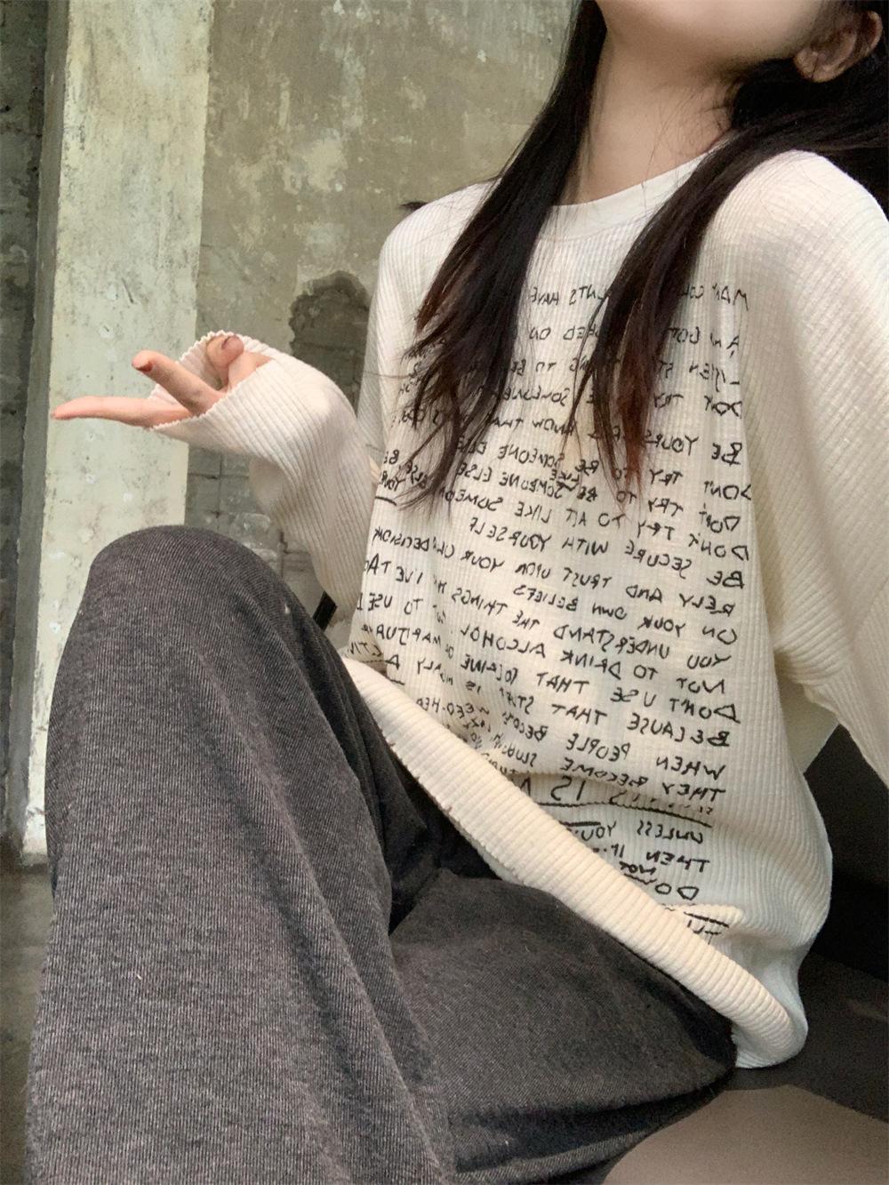 Camiseta de estilo dulce y picante de manga larga con hombros descubiertos y estampado de letras para mujer, top básico corto blanco ajustado adelgazante de nicho para primavera y otoño
