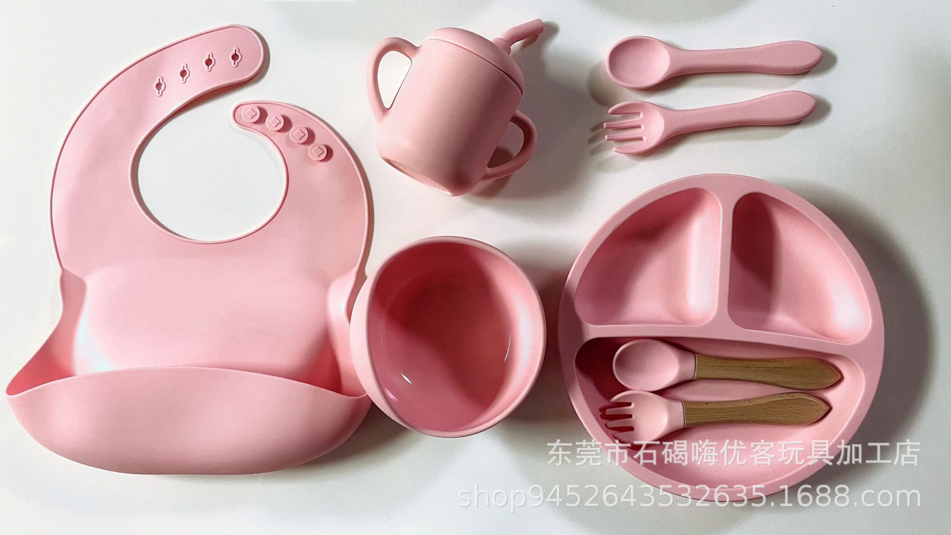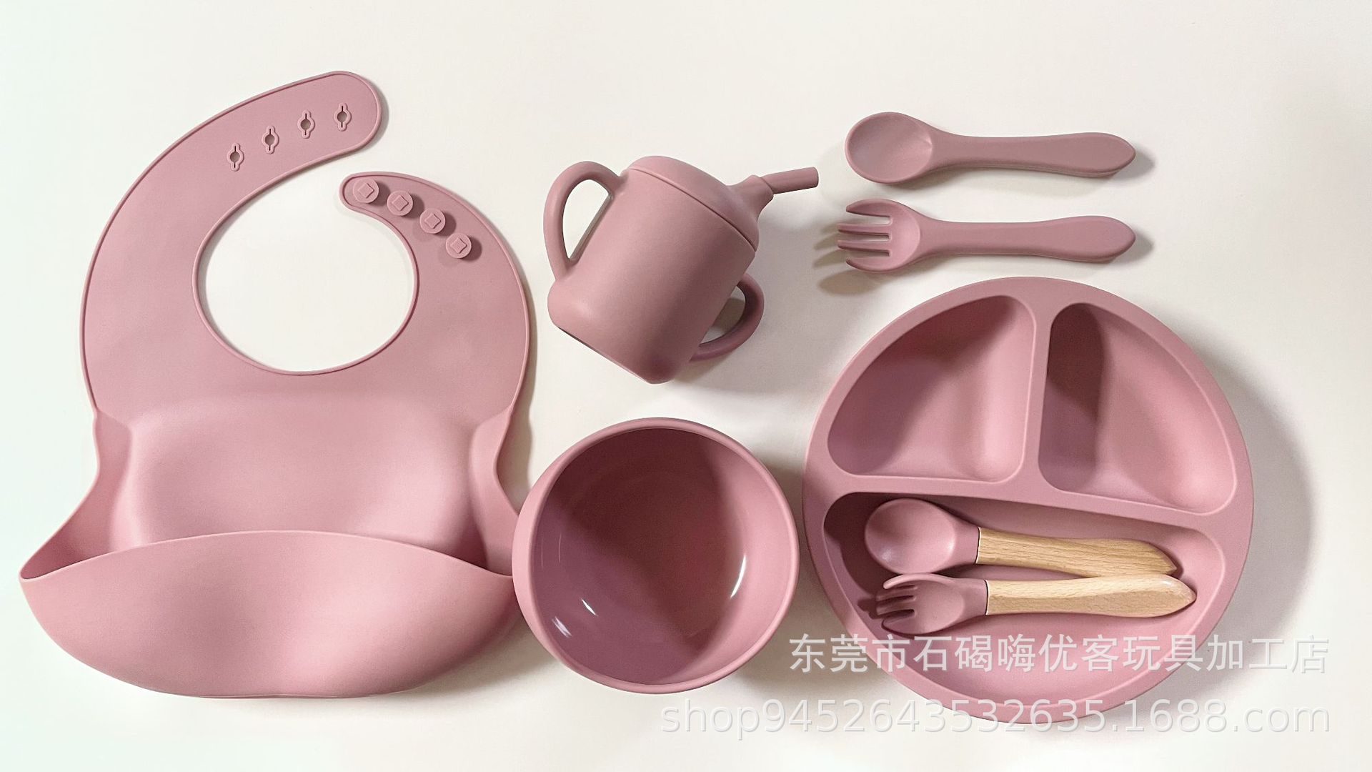 Gray rose red (cup 2 bib plate bowl wooden handle fork wooden handle spoon)