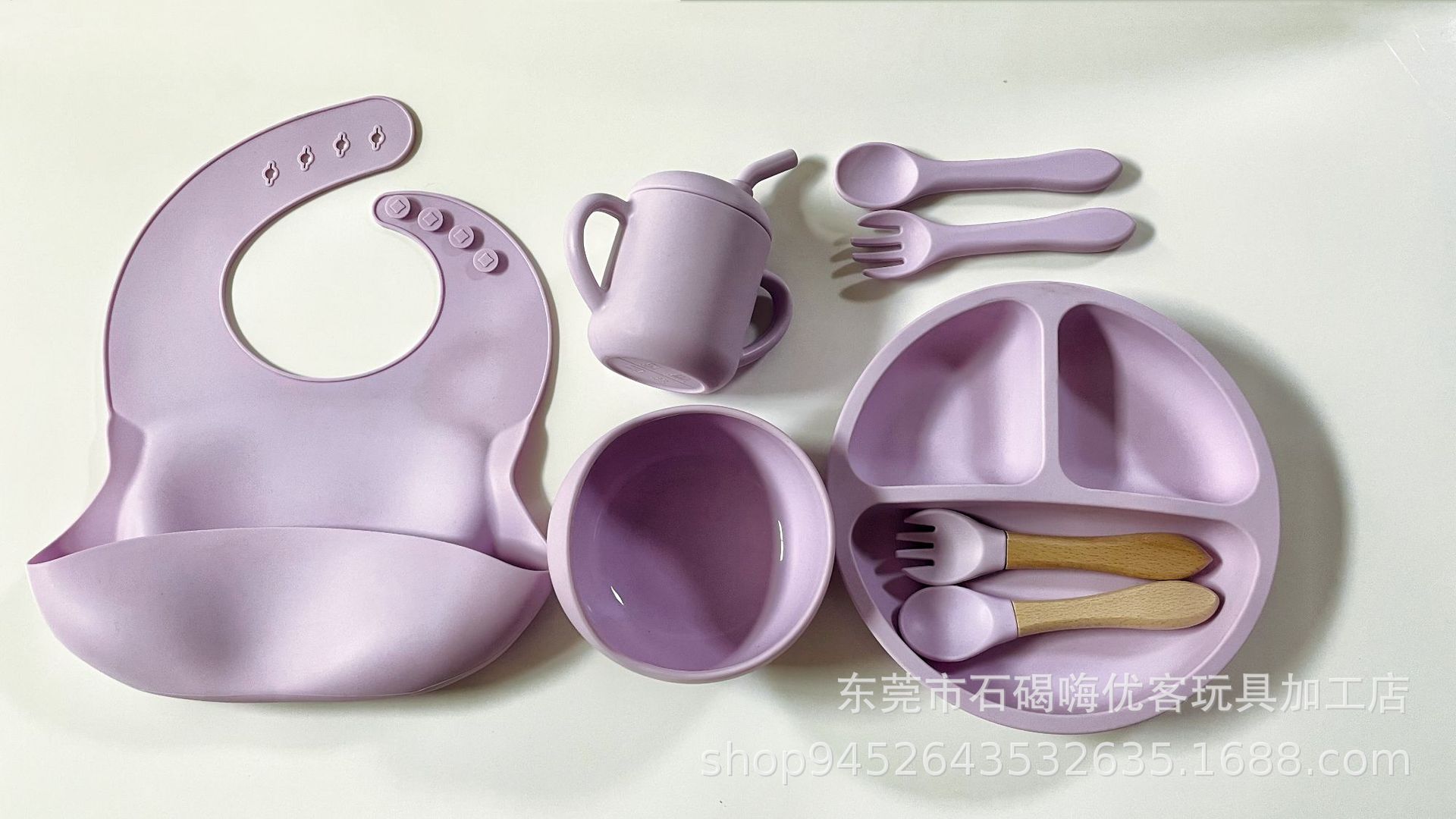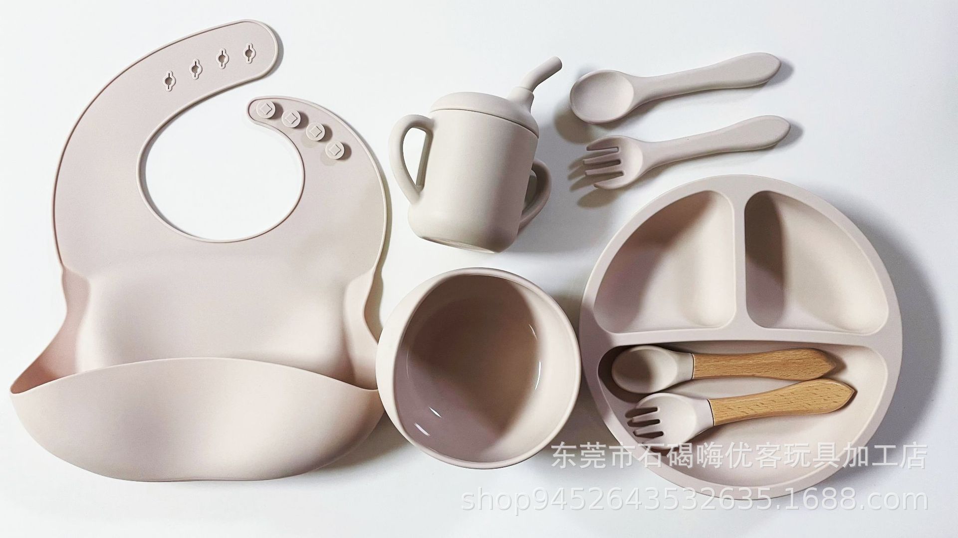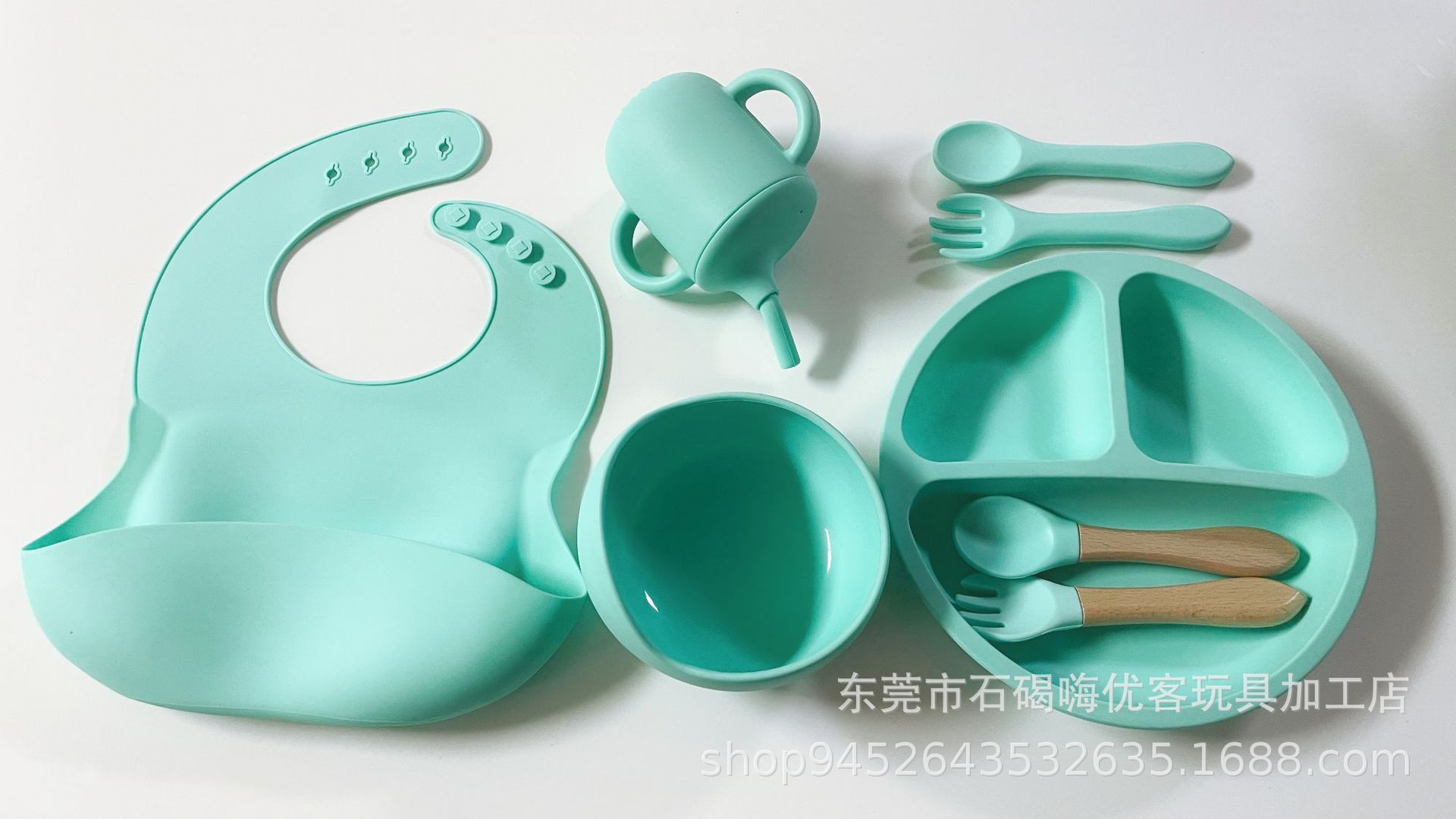 Gray Blue (Cup No. 2 Bib Plate Bowl Wooden Handle Fork Wooden Handle Spoon)