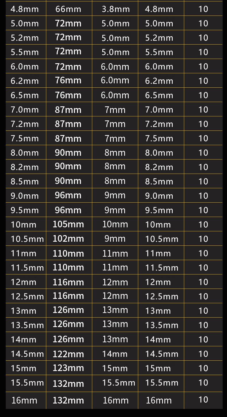 3mm, 3.2mm, 3.5mm, 4mm, 4.2mm, 4.5mm, 4.8mm, 5mm, 5.2mm, 5.5mm, 6mm, 6.2mm, 6.5mm, 7mm, 7.2mm, 7.5mm, 8mm, 8.2...