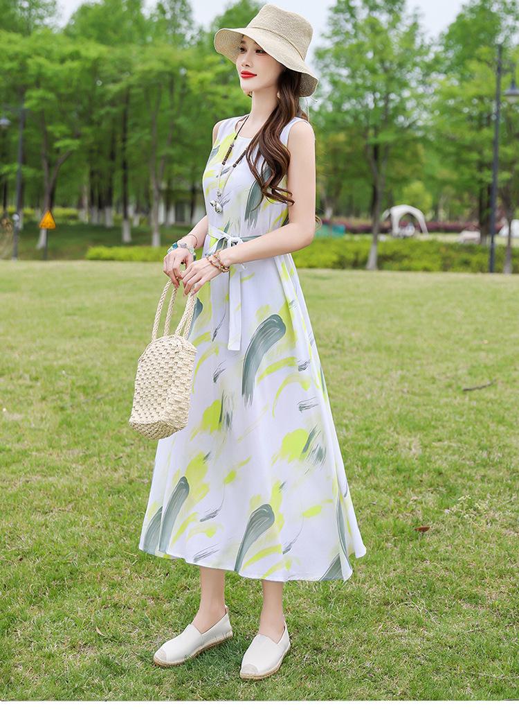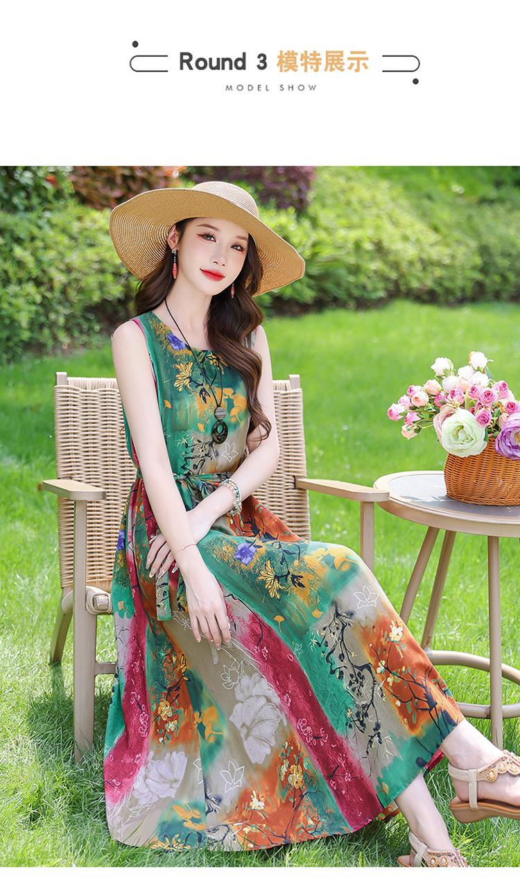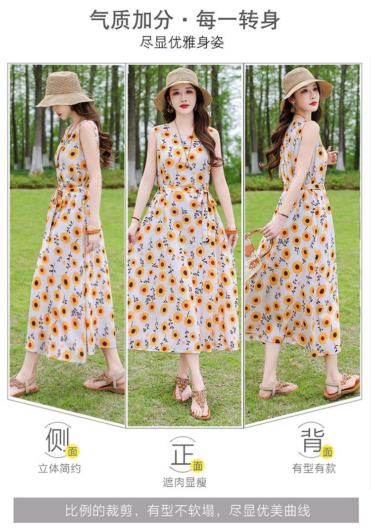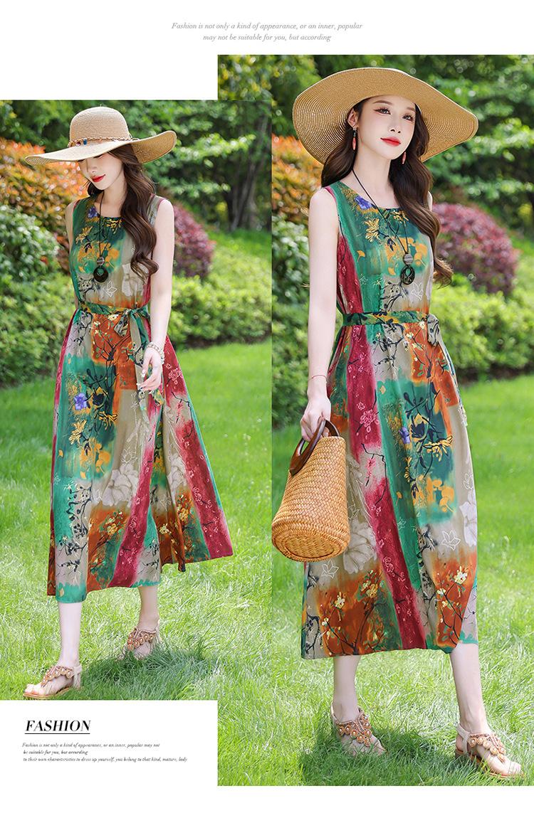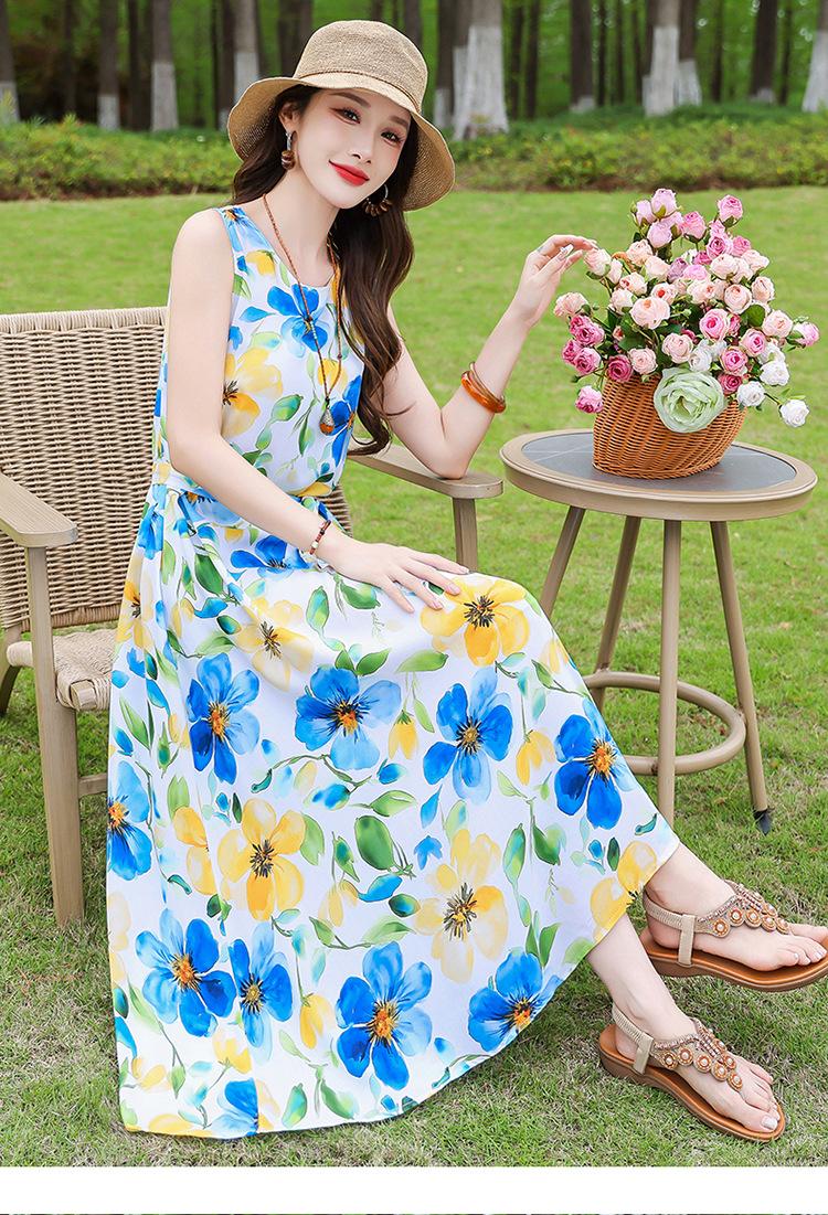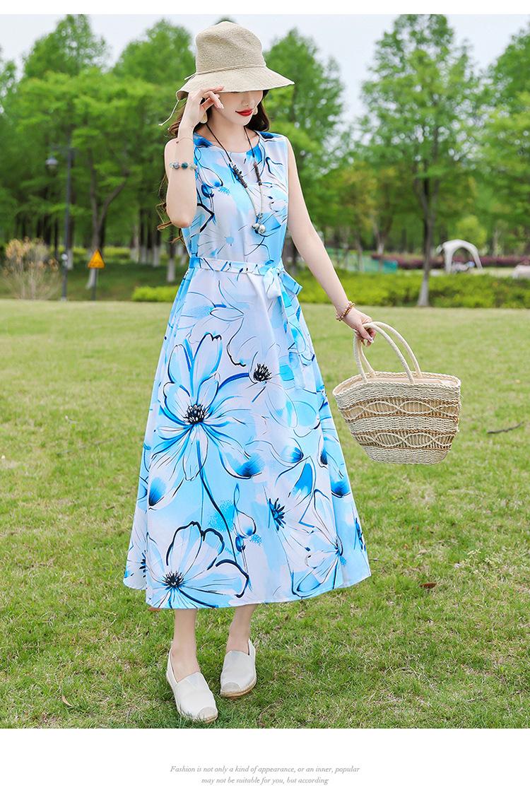 Nuevo Vestido sin Mangas de Algodón Seda de Cintura Ajustada Estilo Vacaciones Marinas para Mujer Talla Grande Adelgazante Chica Gorda Playa Tirantes Falda Larga