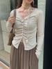 [Oufan] Camisa plisada de manga larga con cuello en V para mujer, otoño 2024, nueva chaqueta interior ajustada 2065