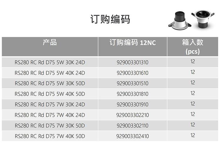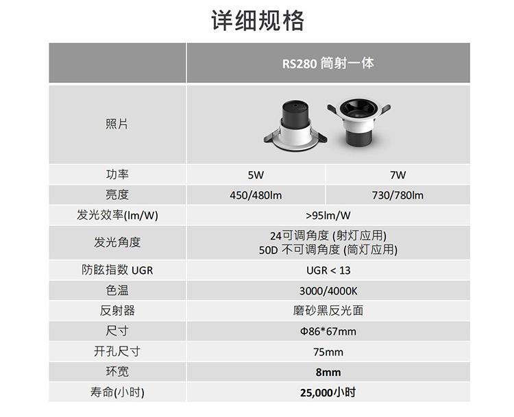 RS280 5W D75 24D spotlight, RS280 5W D75 50D Downlight, RS280 7W D75 24D spotlight, RS280 7W D75 50D Downlight...