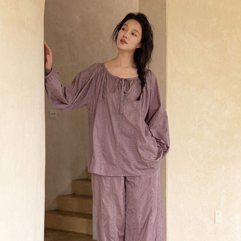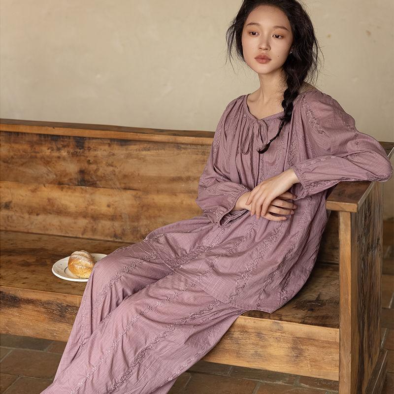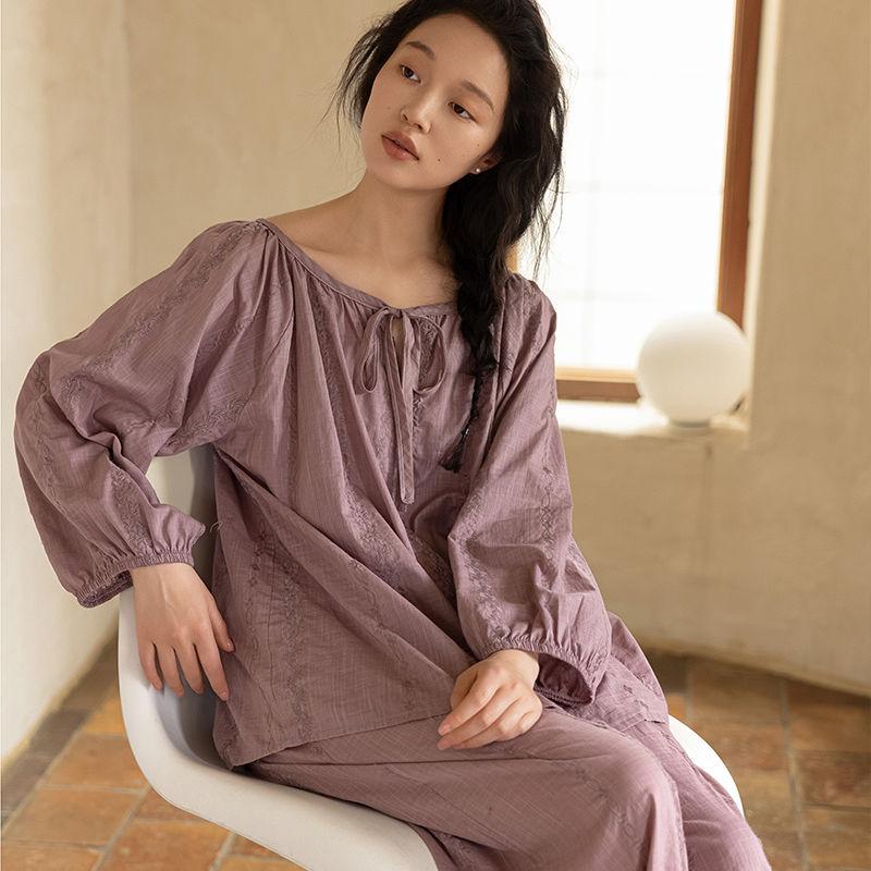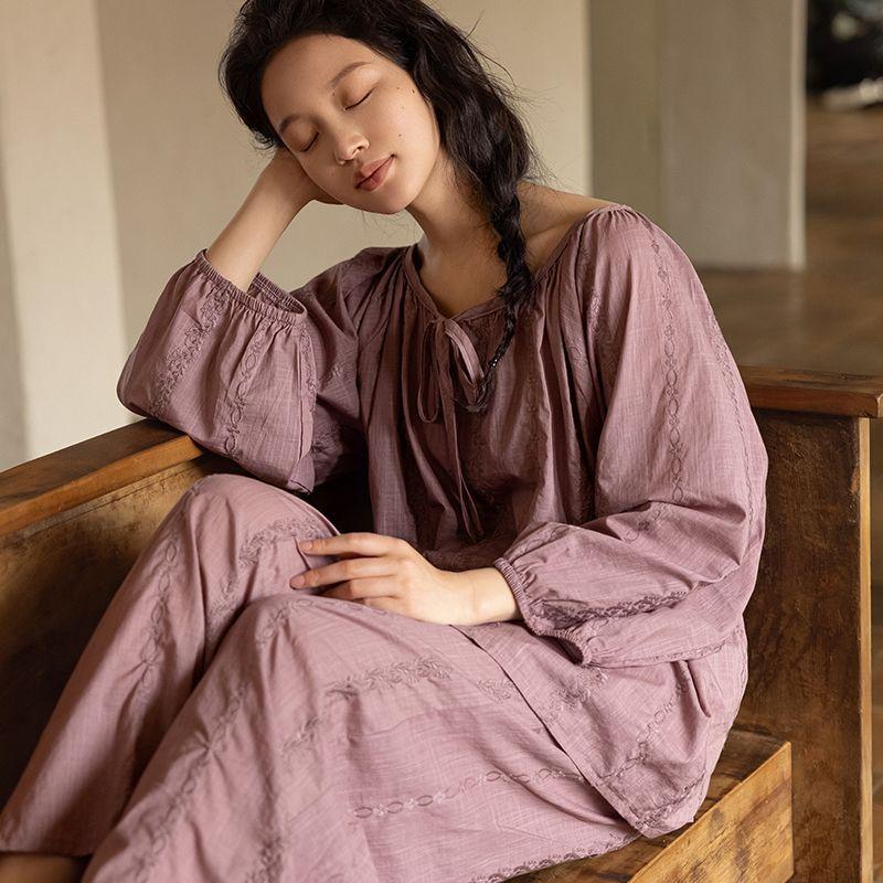 Pijamas Zumashi para Mujer Primavera y Verano Nuevo Algodón Puro Bordado Traje de Pantalón de Manga Larga Holgado Delgado Ropa para el Hogar 150