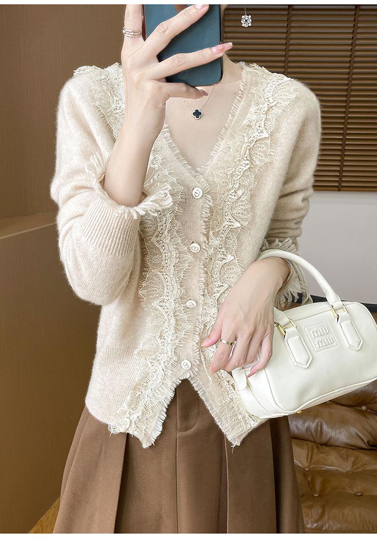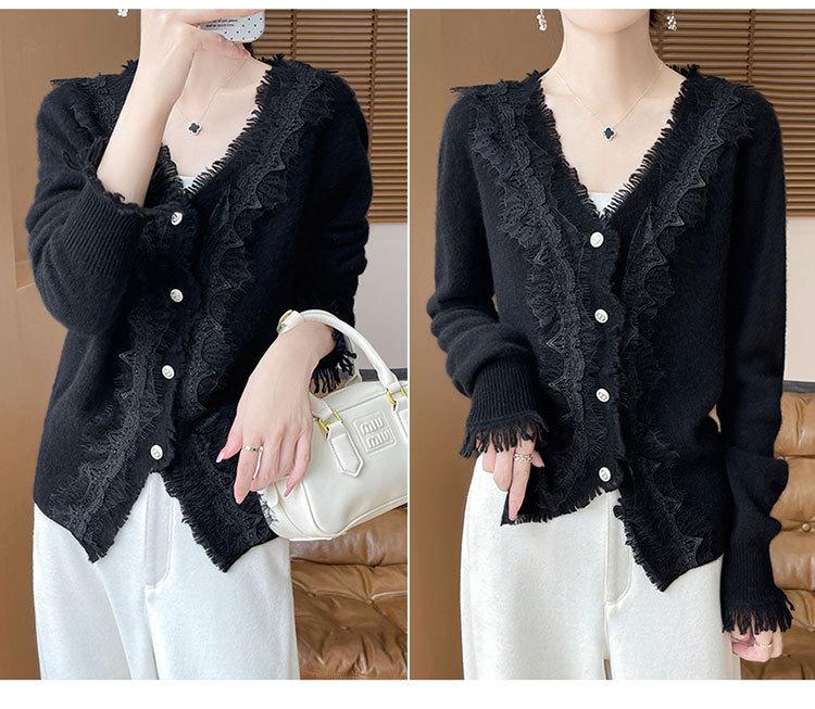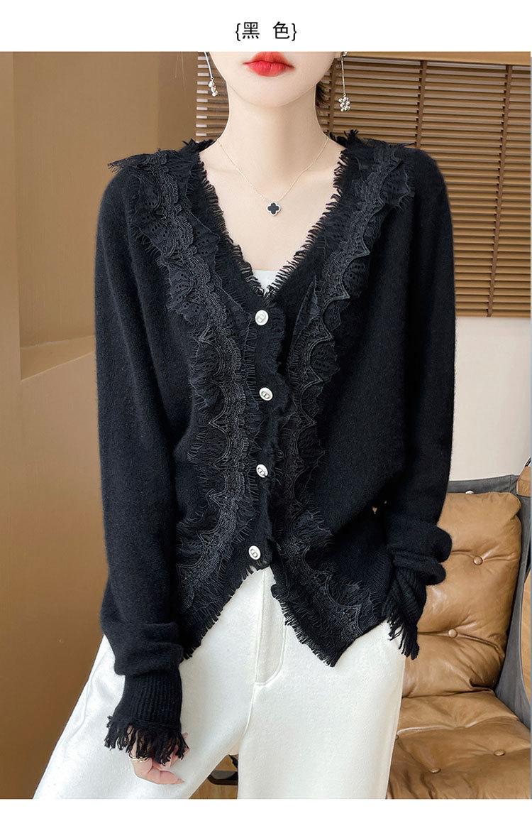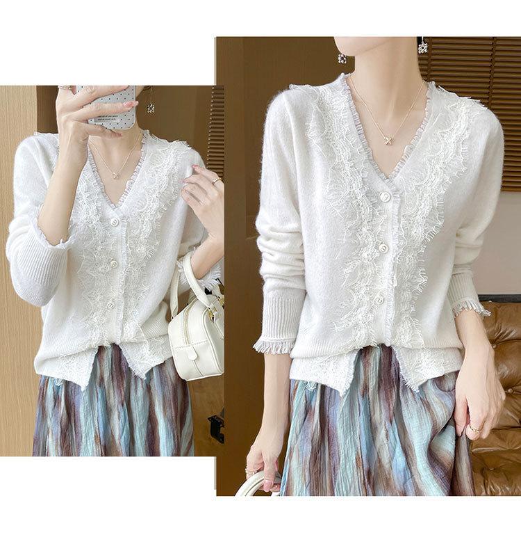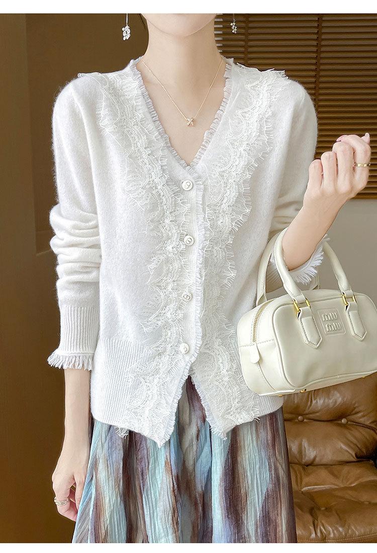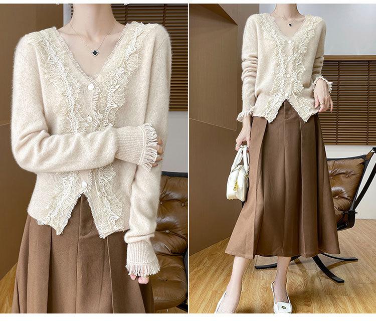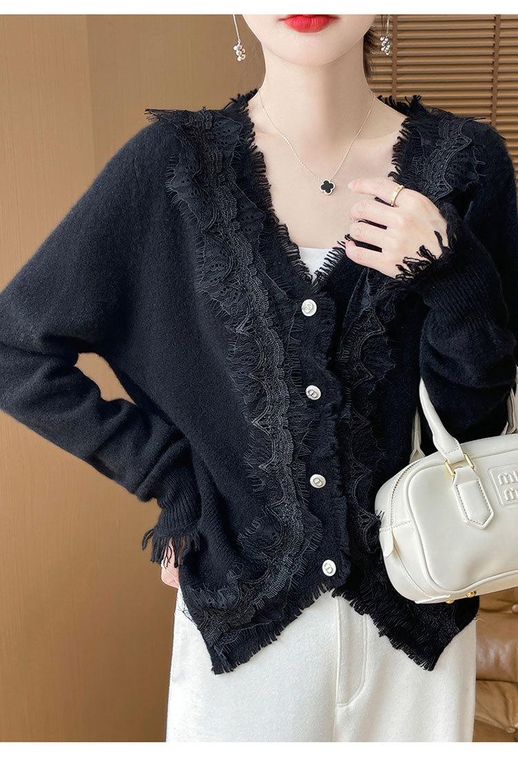 Suéter de Lana Nueva Estilo Chanel para Principios de Otoño para Mujer, Suéter de Encaje con Costuras, Cuello en V, Cárdigan de Cachemira, Top, Suéter de Manga Larga