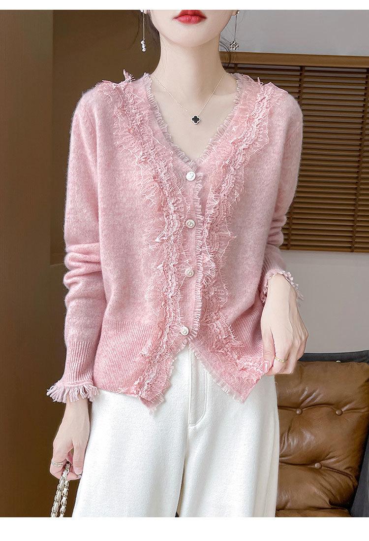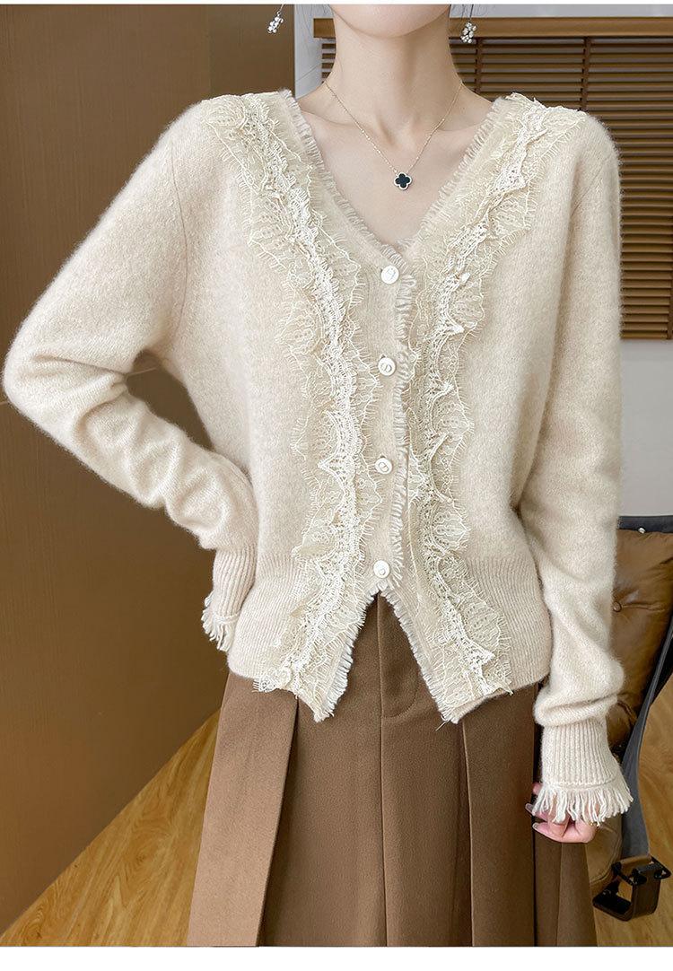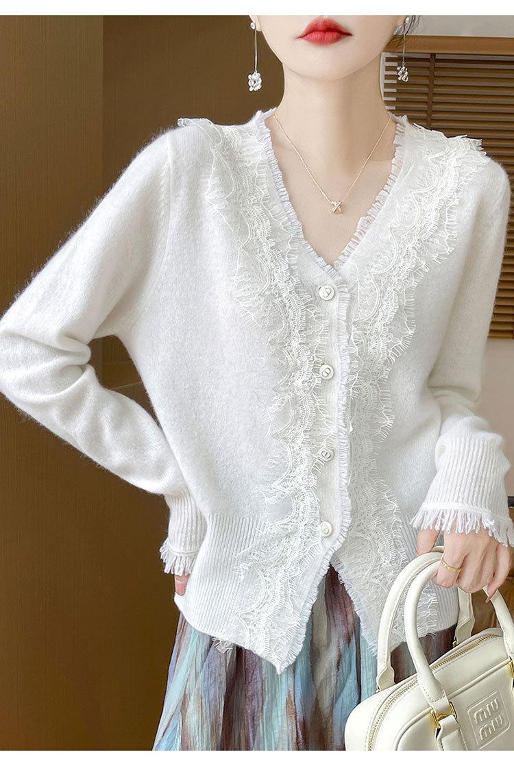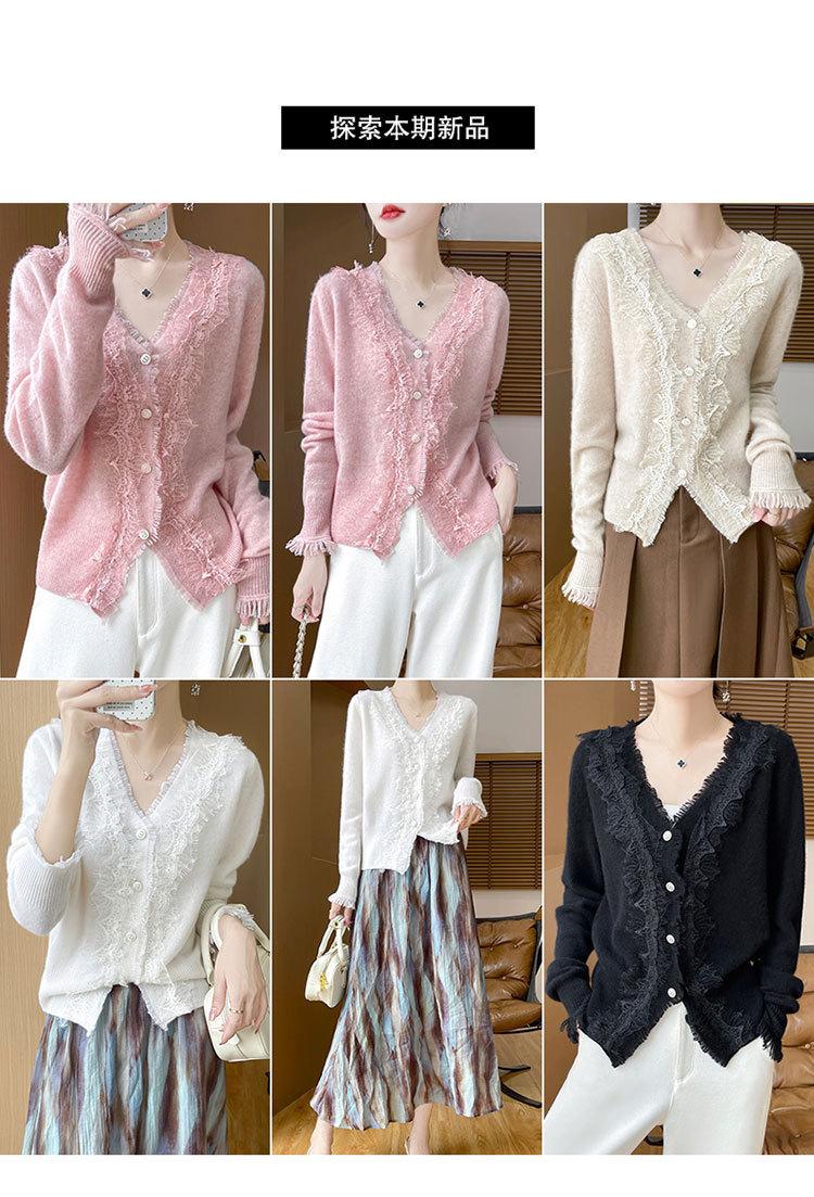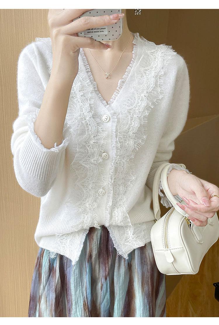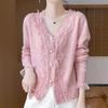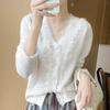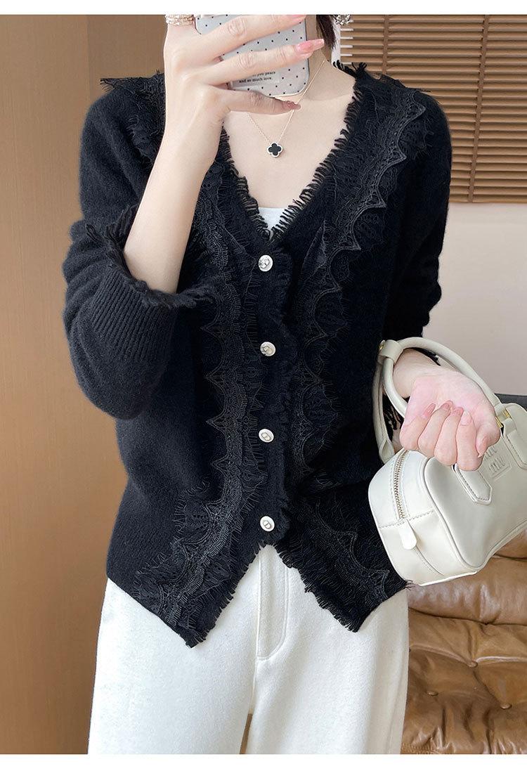 Suéter de Lana Nueva Estilo Chanel para Principios de Otoño para Mujer, Suéter de Encaje con Costuras, Cuello en V, Cárdigan de Cachemira, Top, Suéter de Manga Larga
