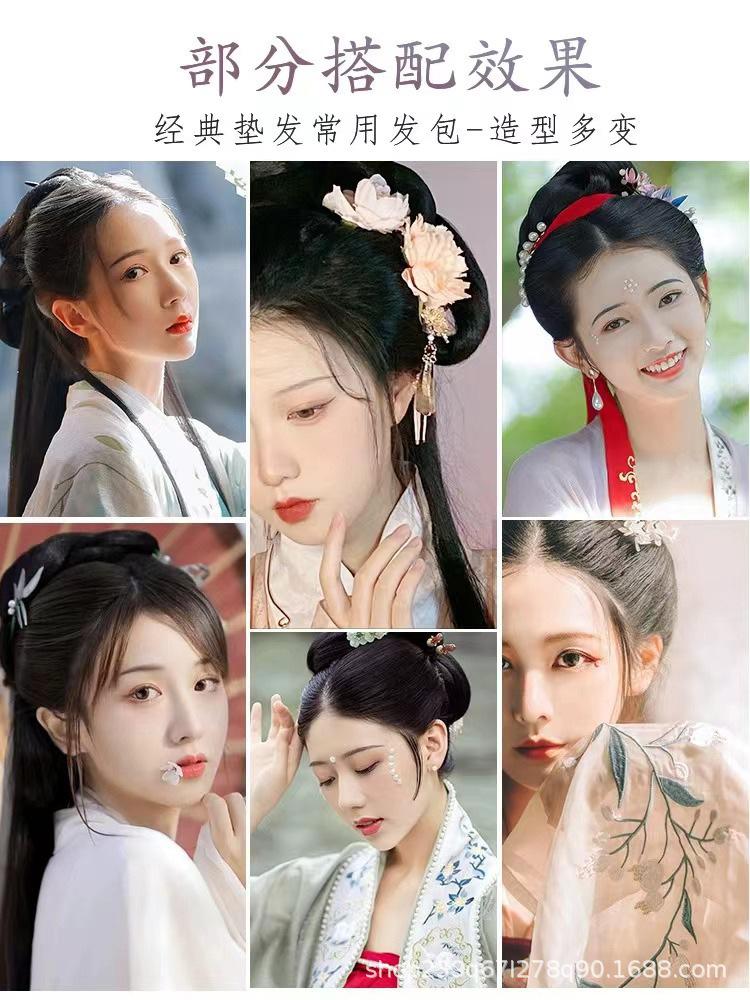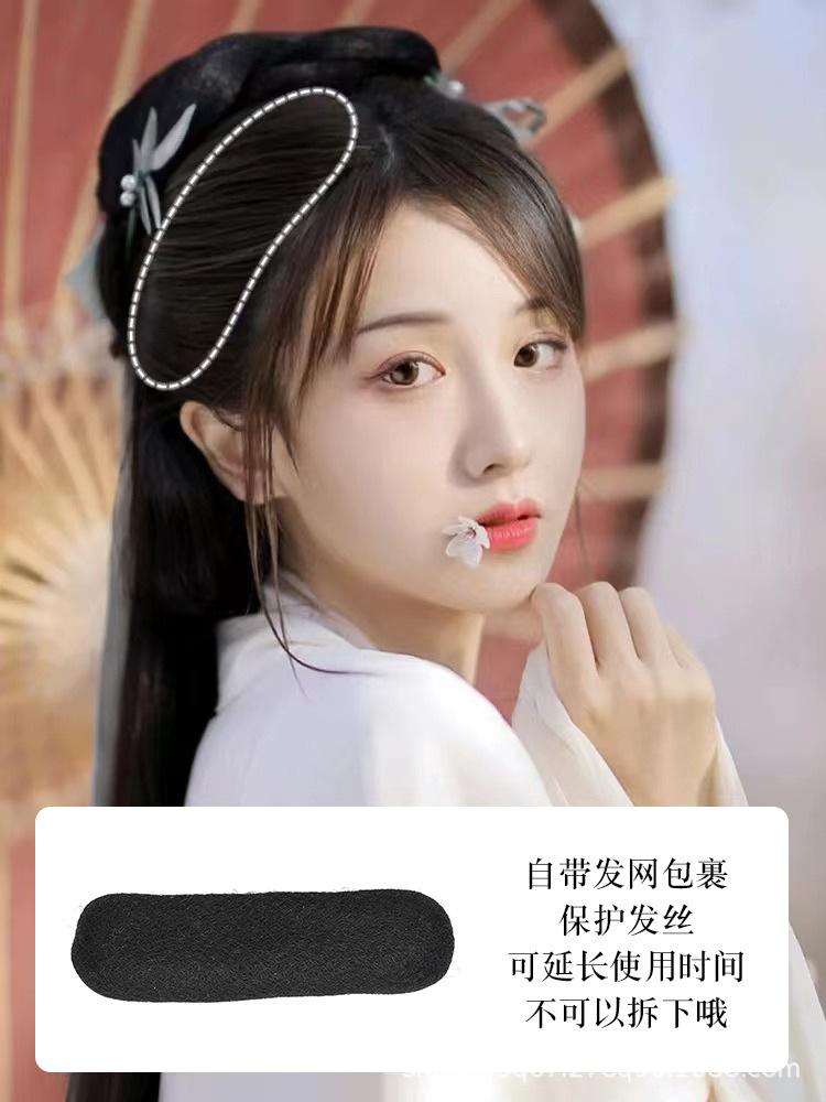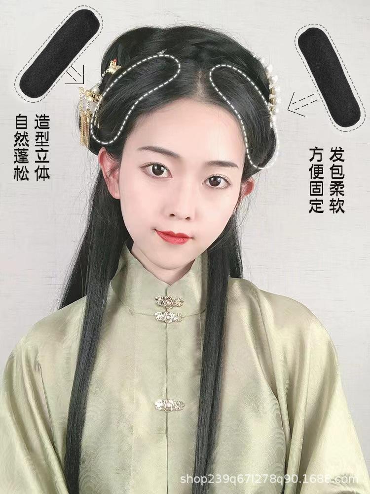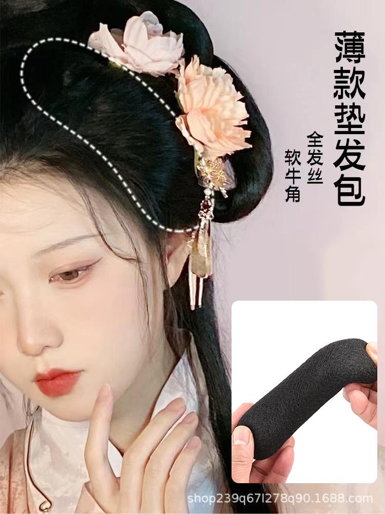 Peluca de disfraz antiguo cabello completo seda cuerno redondo palillo para el cabello estilo hanfu antiguo almohadilla diente de luna bolsa para el cabello moño de cuerno suave almohadilla para el cabello