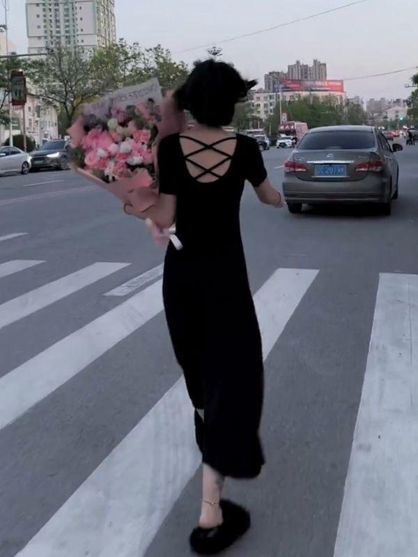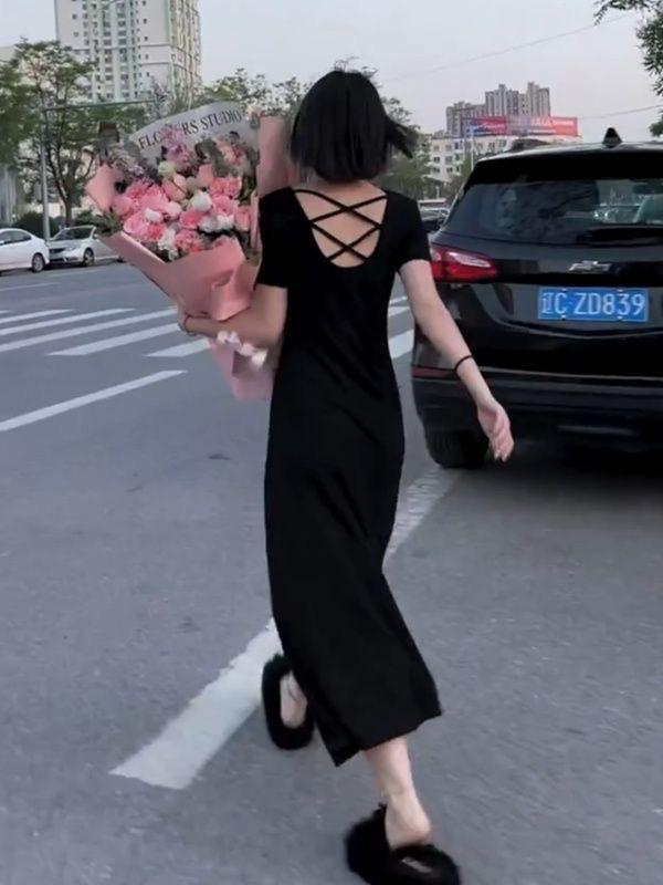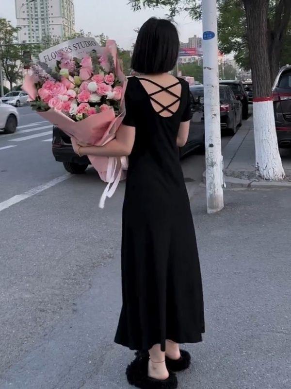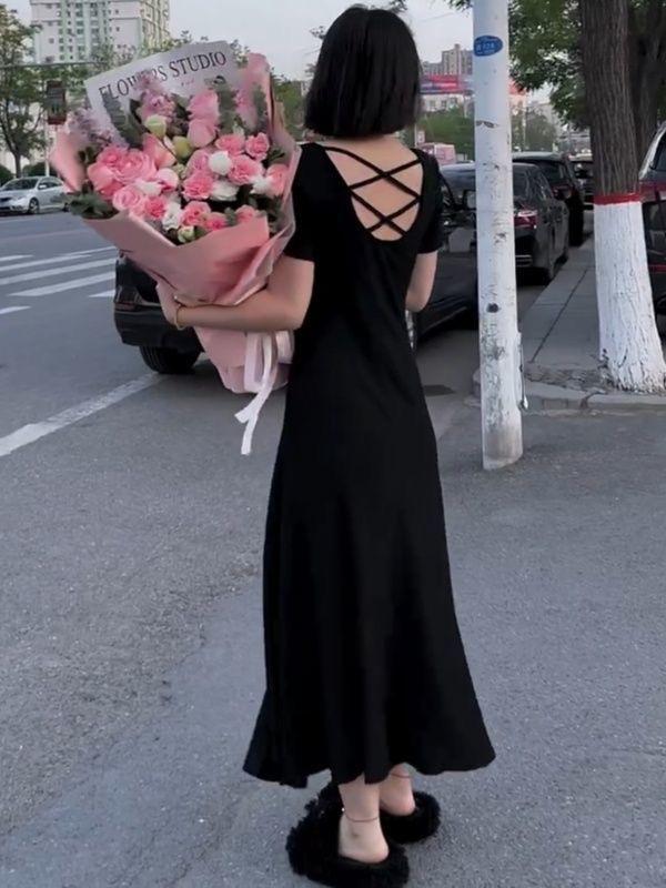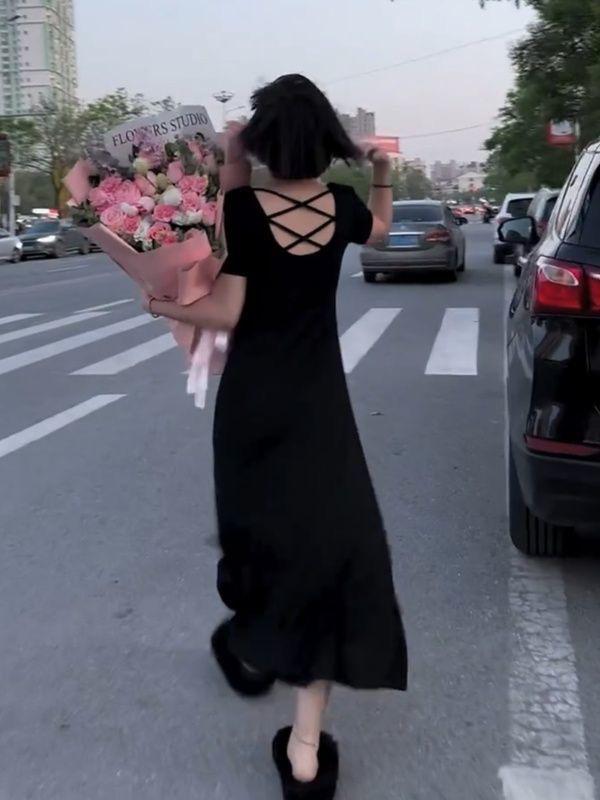 Vestido de manga corta sin espalda estilo Hepburn francés para mujer, verano 2024, nuevo, elegante, ajustado, con cintura adelgazante, corte A, vestido negro pequeño.