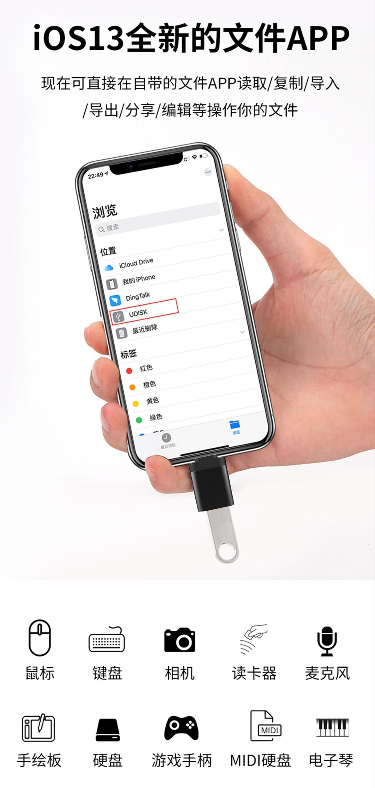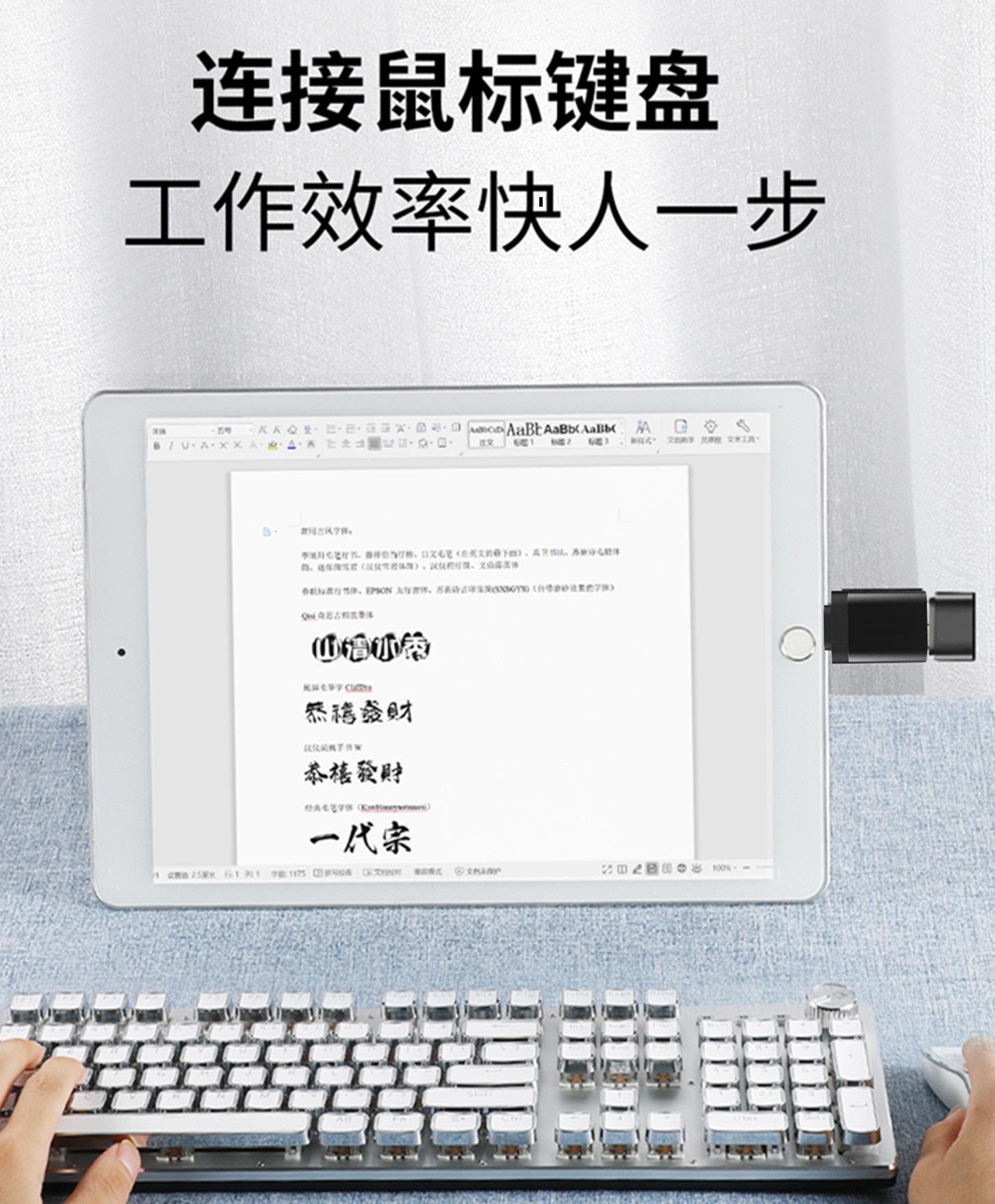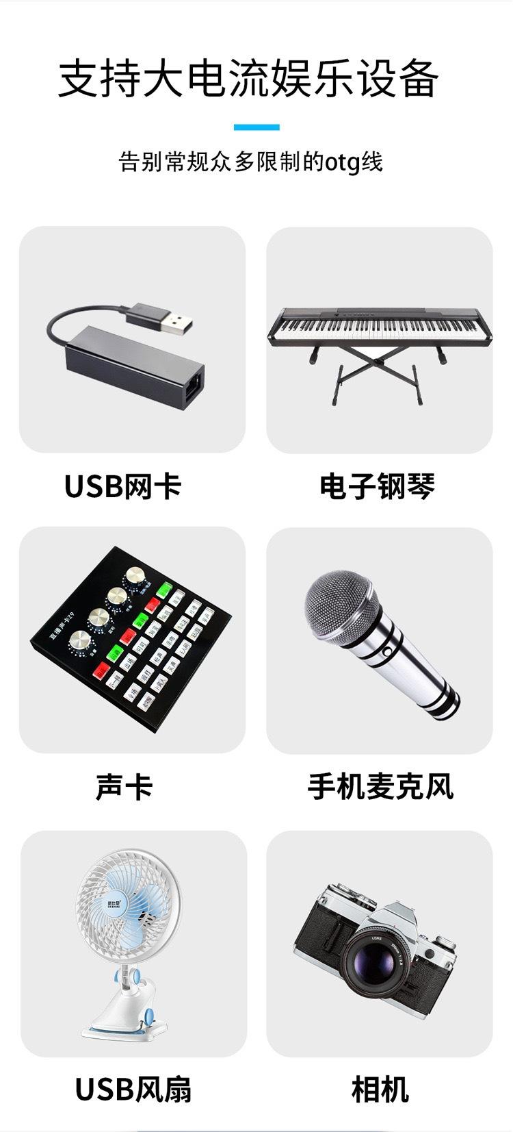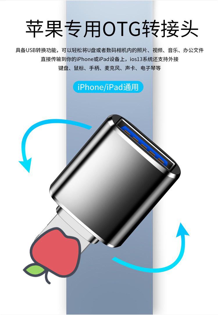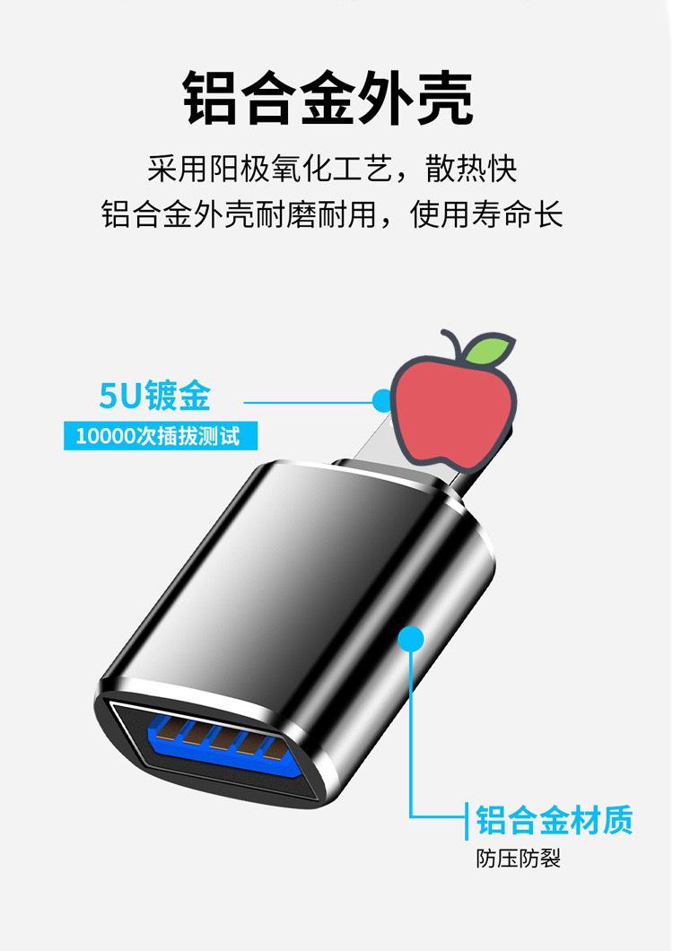 El adaptador OTG es adecuado para teléfono móvil Apple, lectura de disco U, lector de tarjetas, USB a convertidor de ratón y teclado de computadora.