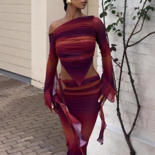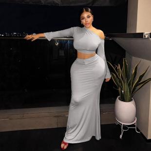 Estilo Europeo y Americano Otoño 2025 Transfronterizo Sexy Top Corto Crop de Un Hombro Set Falda Midi Ajustada de Cintura Alta