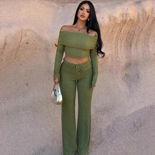 Amazon 2025 Comercio Exterior Transfronterizo Otoño Nuevo Moda Top de Manga Larga con Hombros Descubiertos Set de Pantalones de Pierna Ancha para Mujer