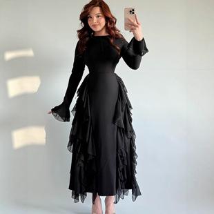 Ropa de Mujer de Comercio Exterior Europeo y Americano 2025 Transfronteriza Amazon Otoño Cuello Redondo Manga Trompeta Temperamento Cintura Alta Adelgazante Vestido Mujeres