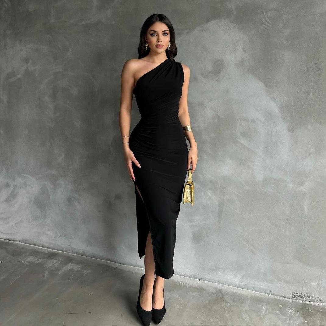 Vestido Otoño 2025 Amazon Más Vendido Un Hombro Cuello Inclinado Manga Larga Ropa de Mujer Transfronteriza Europea y Americana Vestido Largo con Abertura