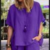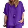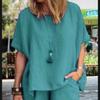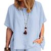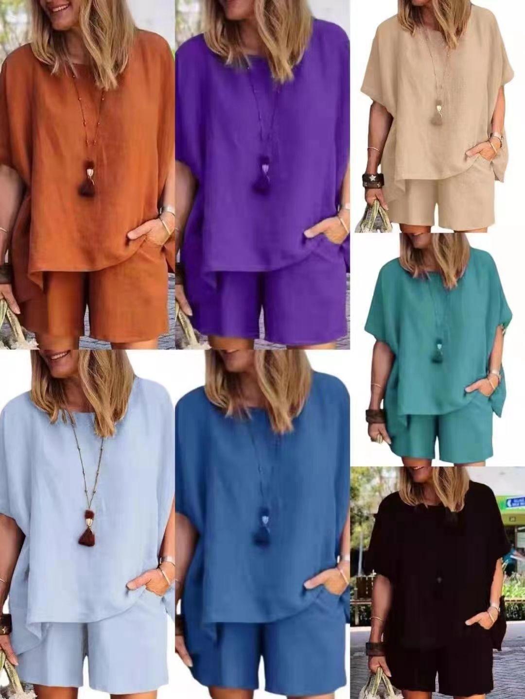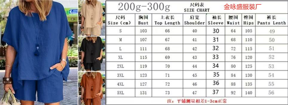 Exportaciones de comercio exterior transfronterizo a Europa y Estados Unidos, traje de algodón y lino, moda de verano para mujer, talla grande, top holgado de manga corta y pantalones cortos, conjunto de dos piezas