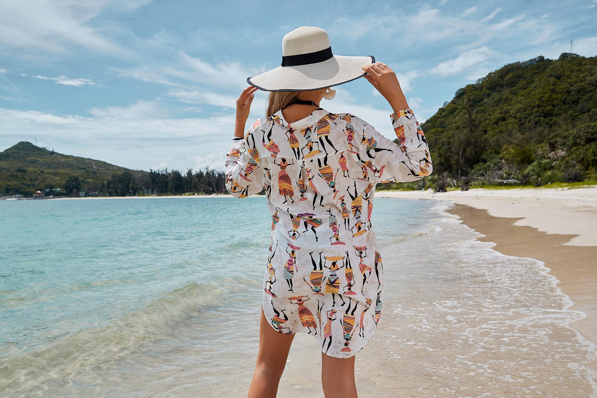 Falda de playa de algodón estampada nueva europea y americana, bata suelta, bikini para vacaciones en la playa, traje de baño, camisa de protección solar para mujer