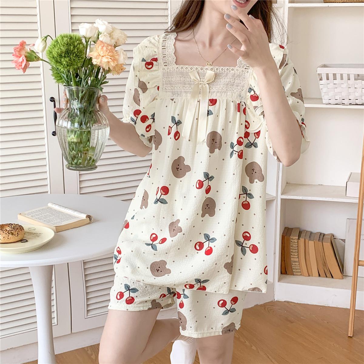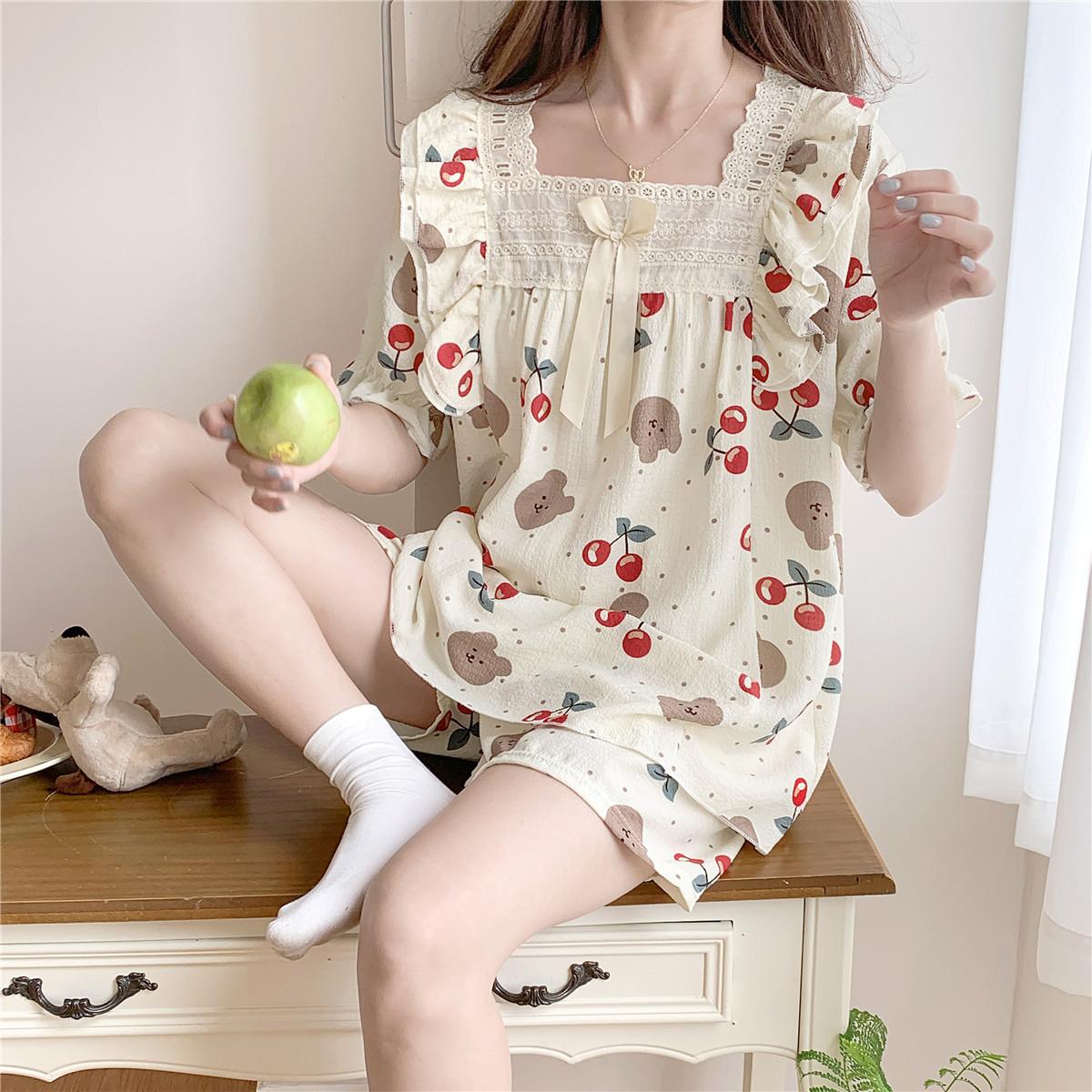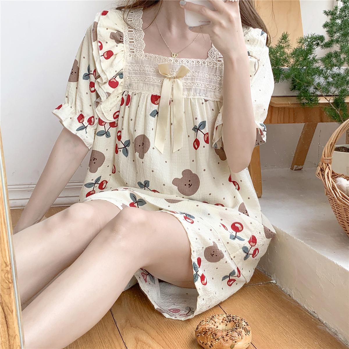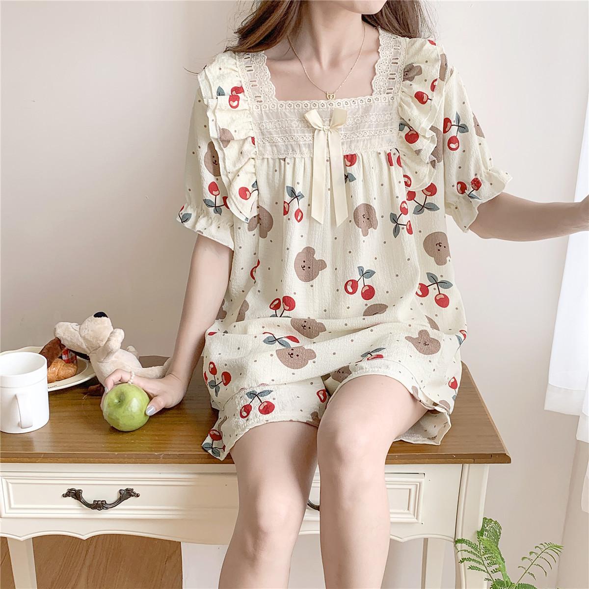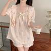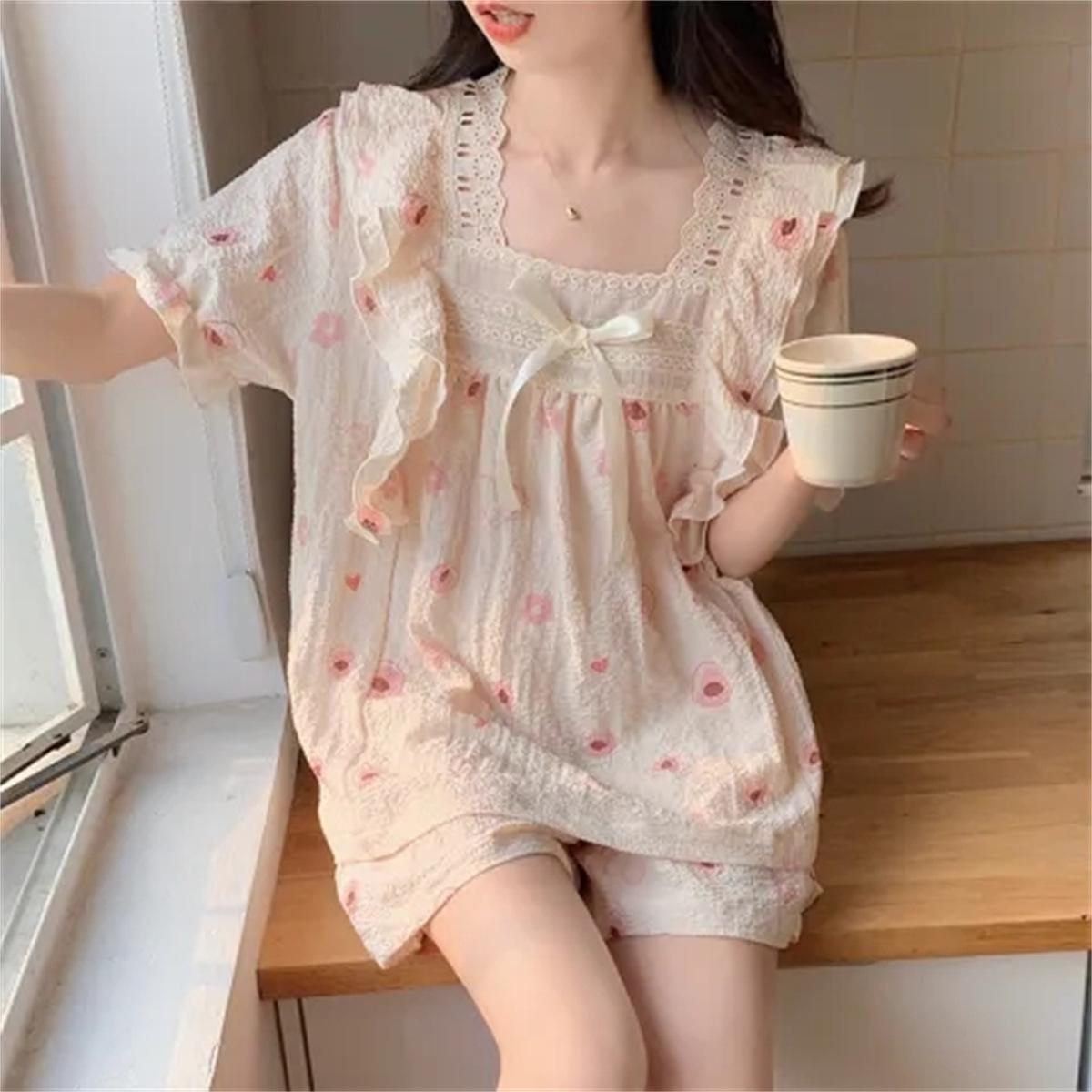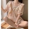 Pijama de algodón con burbujas estilo princesa Ins para mujer, de manga corta, cuello cuadrado con borde de encaje, bonito traje holgado de verano para niña